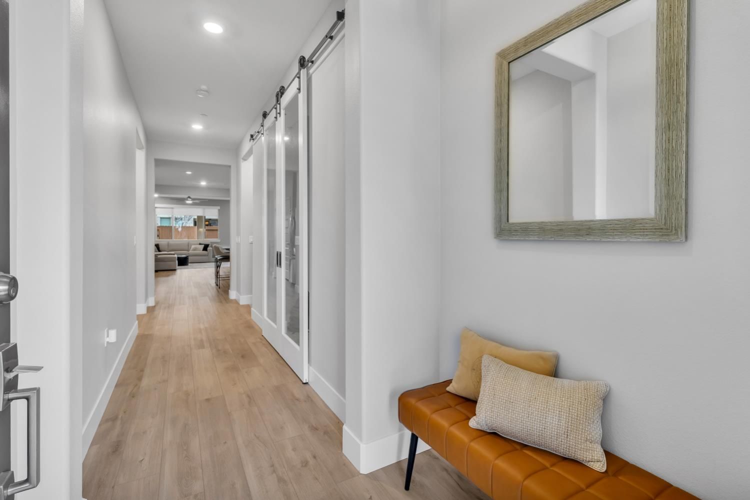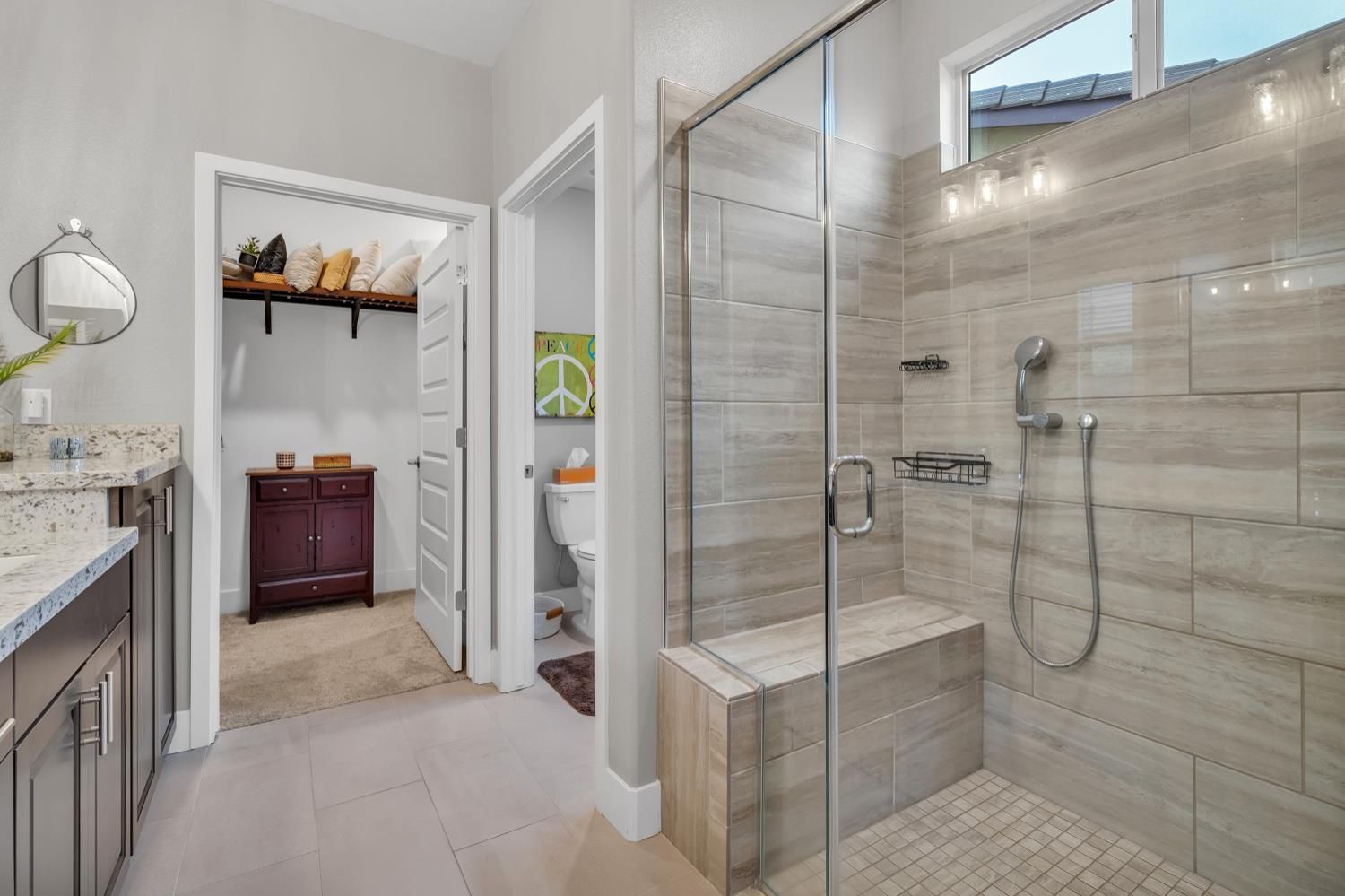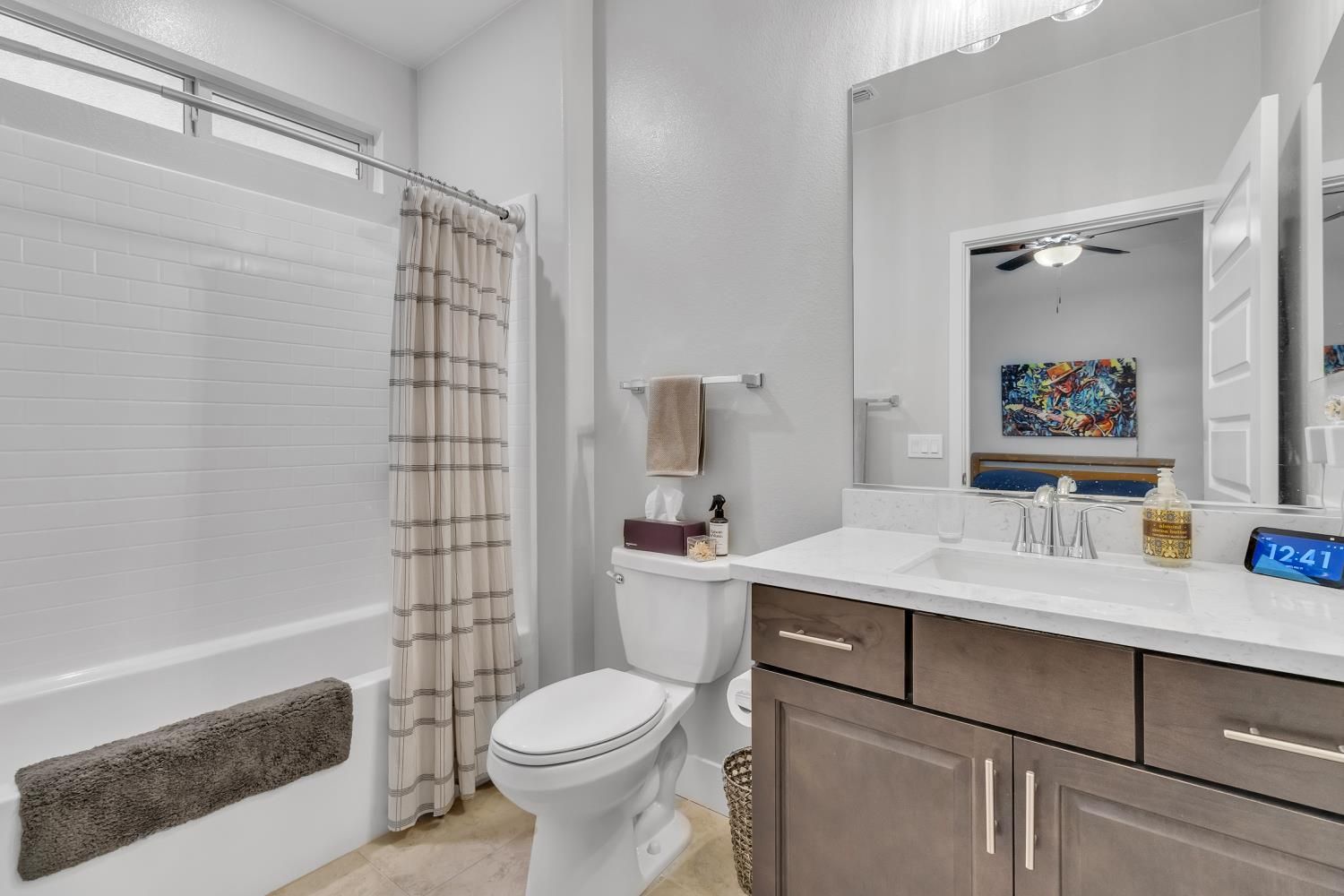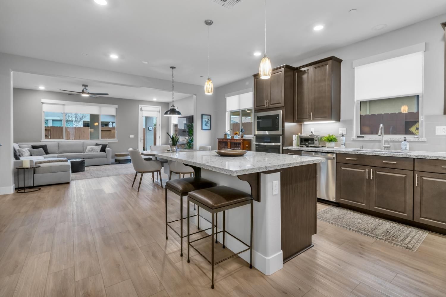 Welcome to this beautifully designed single-story home in the desirable Heritage 55+ gated community. Offering 1,712 sq. ft., this home features 2 bedrooms (possible 3), 3 bathrooms, owned solar for energy efficiency with savings and a whole-house air filtration system for enhanced air quality for year-round comfort. A spacious entry welcomes you inside, where glass sliding doors open to a versatile den ideal for a home office, hobby room, or optional third bedroom. A conveniently located half bath adds comfort for guests. The bright open-concept living area is perfect for everyday living and entertaining. The kitchen features quartz countertops, double ovens, ample cabinetry, and a pantry closet, blending style and functionality. Bedrooms are thoughtfully positioned on opposite ends for privacy. One bedroom includes a walk-in closet and an ensuite bath with a roll-in shower, while the second bedroom offers its own private bathroomideal for guests. A hallway laundry closet adds convenience. Recent updates include fresh interior paint and custom cabinetry in the 2-car garage for excellent storage. Enjoy outdoor living with a covered front porch and covered backyard patio. HOA includes front landscaping, providing low-maintenance living in a peaceful, secure, and well-maintained active adult community.