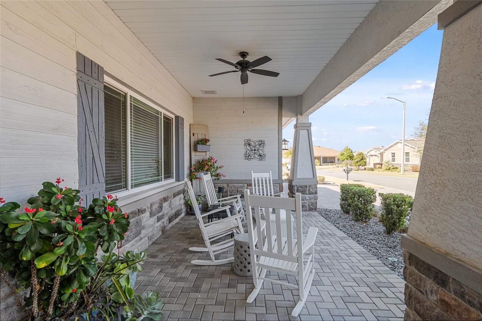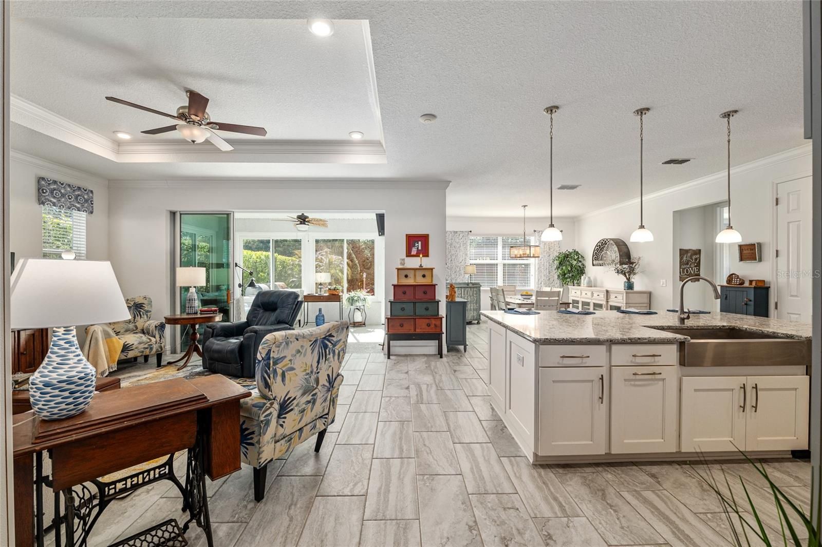 Welcome to this beautiful Brighton Model located in the coveted Larkhill area of Candler Hills West, On Top of the World. This elegant open floor plan with 2 bedrooms, 2 bathrooms, a flex room, and a 3-car garage on a private lot, is a pleasure to show. The home boasts ceramic tile, tray ceilings, and custom blinds throughout. The gourmet kitchen is a chef's delight with a large island, coffee station/breakfast bar, built-in oven, gas cooktop, stainless steel appliances, quartz counters, lots of cabinet space and pendant lighting. The spacious living room offers plenty of space to unwind or host guests. The master suite features a tray ceiling, an en suite with a zero-entry shower, dual sinks, and a large walk-in closet. Enjoy split bedrooms, upgraded bathrooms, a large laundry room, and impeccable landscaping. The home is tiled throughout the living areas and carpeted in the bedrooms. Beautiful sunroom great for entertaining. Other features include, pavered driveway and patio, slate rock filled landscaped bets with concrete edging. Larkhill, Candler Hills West, is located in Ocala's premier, gated, active 55+ community, loaded with amenities, including golf cart access to two shopping centers, indoor/outdoor pools, 3 golf courses, 2 restaurants, multiple exercise facilities with plenty of top of the line equipment, water aerobics, yoga, exercise classes, steam and sauna, pickleball courts, RC plane airport, RC car track, min golf, wood working, 100’s of clubs and continuing education, bocce, horseshoes, shuffleboard, billiards, game room. Social activities galore with great residents. The amenities are too much to list.