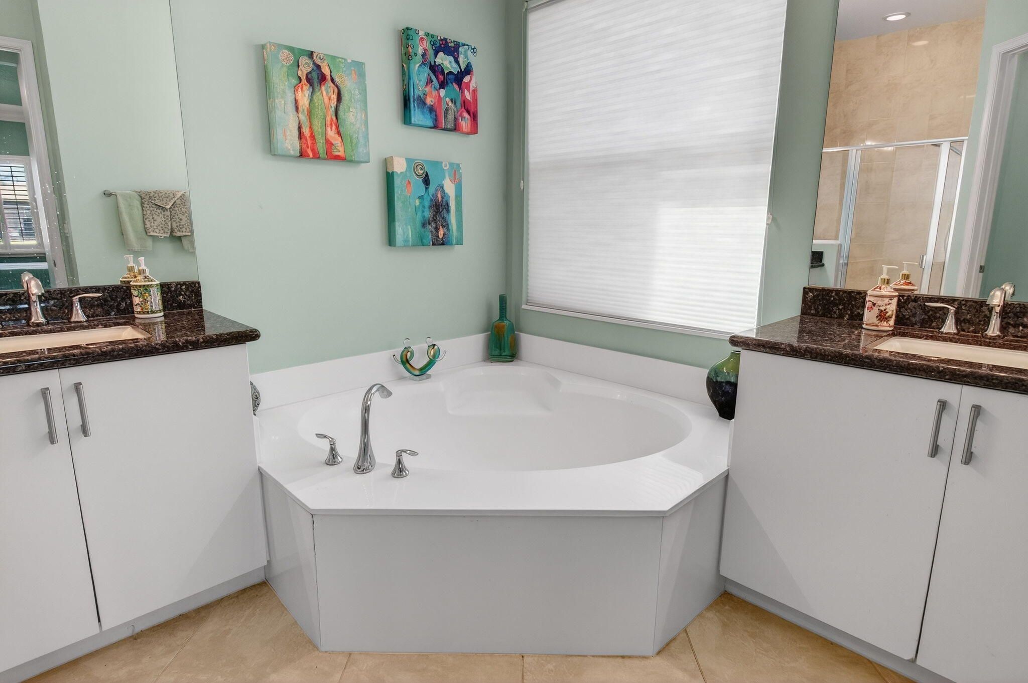 - Entry Level Living Area, Pantry, Garden Tub/Roman Tub, Split Bedrooms, High Ceilings, Walk-In Closet(s), Home Office, Great Room, Kitchen/Dining Combo, Separate/Formal Dining Room, Snack Bar, Blinds, Dual Sinks, Primary Downstairs, Separate Shower, Bathtub, Storm Shutters