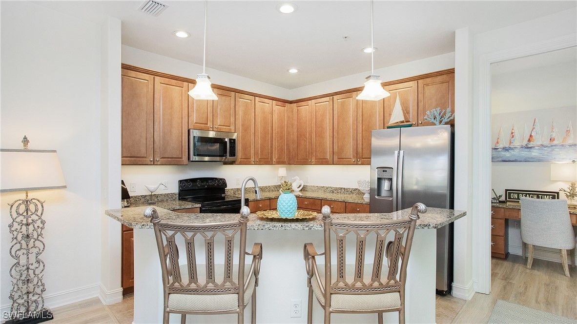 Discover the ease of resort-style living in this meticulously updated 3-bedroom, 2-bathroom residence in Ole’ at Lely Resort. Perfectly situated at the end of the charming Rialto Street, this home offers more than just a place to sleep—it offers a vibrant, walkable lifestyle just moments from the heart of the Village Center. Imagine starting your morning with coffee on your private patio, listening to the tranquil sounds of a double-tiered water fountain overlooking a manicured lawn. Inside, the home feels brand new and effortlessly modern. Recently upgraded with luxury flooring, fresh designer paint, recessed lighting, and custom fixtures, the open-concept floor plan is bathed in natural light. The chef’s kitchen, featuring granite countertops and abundant cabinetry, flows seamlessly into the living and dining areas—perfect for entertaining friends after a day at the pool. A rare find in condo living, the attached two-car garage provides ample storage for your vehicle, golf clubs, and beach gear. The Ole’ Lifestyle: Step outside and enjoy a scenic stroll past tropical landscaping to the Village Center, the social heartbeat of the community. Here, you have exclusive access to a massive lagoon-style pool with waterfalls and cabanas, a dedicated kids' pool, and a poolside Bistro & Pub for dining. Stay active at the state-of-the-art fitness center, tennis, pickleball, and bocce courts, or relax at the private movie theater, library, and ice cream parlor. For the Savvy Owner: With a flexible rental policy (12 leases/year, 30-day minimum), this unit is the perfect hybrid of a private winter retreat and a high-performing investment asset. Located minutes from downtown Naples and Marco Island beaches, this is the piece of paradise you’ve been waiting for.