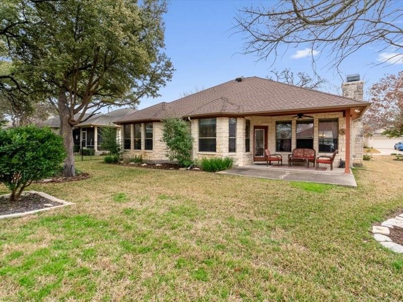 Discover comfortable living in the welcoming Heritage Oaks community of Georgetown, Texas. This well-maintained 3-bedroom, 2-bath home offers a functional layout, perfect for those seeking ease and convenience. Step inside to an open-concept living area filled with natural light, featuring high ceilings and a stunning floor-to-ceiling fireplace with a raised hearth, gas starter, and gas logs—creating a warm and inviting atmosphere. The kitchen, while classic in design, offers ample cabinetry, plenty of counter space, a water filtration system, and pendant lighting over the kitchen bar—ready for your personal touch. It’s also pre-plumbed for gas at the stove, offering flexibility for future upgrades. A bay window in the breakfast nook brings in even more natural light, creating the perfect spot for morning coffee. The spacious primary suite provides a peaceful retreat with a bay window, private en-suite bathroom, and generous closet space. Two additional bedrooms and an office niche offer flexibility for hobbies or a home office. This home comes equipped with a water softener and an ADT-wired security system, offering convenience and peace of mind. A new roof was installed in 2022, adding value and longevity. The laundry room features an additional 220V outlet, perfect for an extra freezer or other appliances. Custom window treatments throughout the home enhance its charm, while ample storage space ensures everything has its place. Outside, mature trees provide shade, creating a serene and inviting outdoor space. The extended covered patio is ideal for relaxation and entertaining. Located in a 55+ community, residents can enjoy trails and a clubhouse featuring a large ballroom, commercial kitchen, meeting rooms, fitness center, library, and game room. Seller will consider all reasonable offers. Partial assumable VA loan or flexible owner financing options may also be available—please contact the listing agent for details!