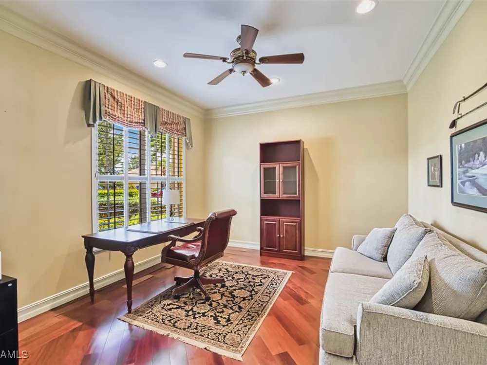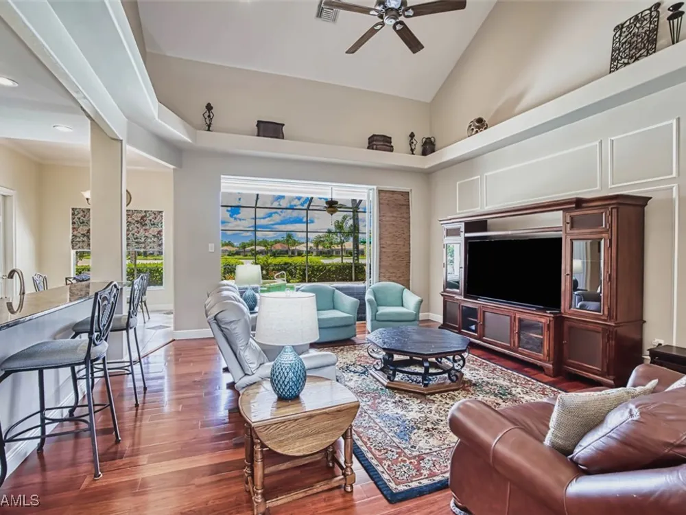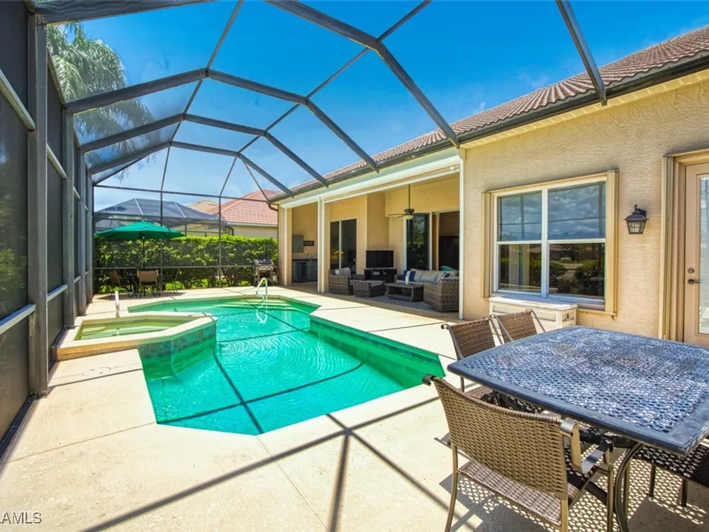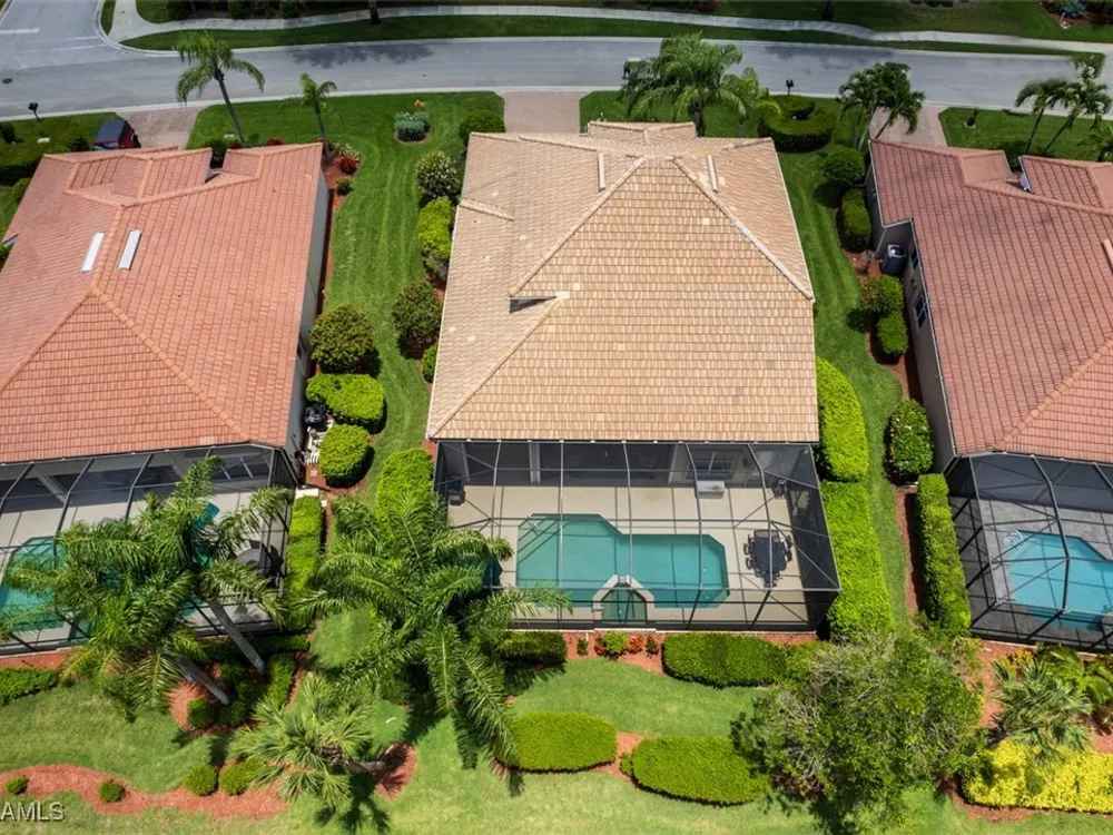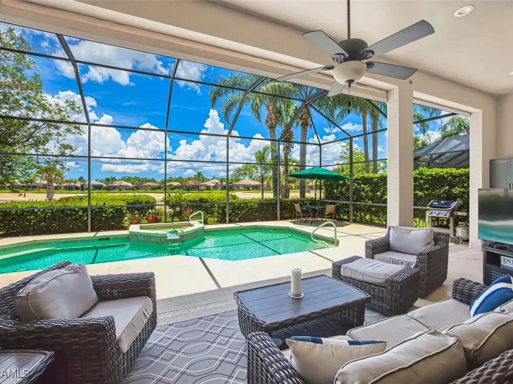 Welcome to your dream home in the prestigious Colonial Country Club! This stunning single family home boasts 3 bedrooms, 2.5 bathrooms, and a plethora of luxurious features that will make you never want to leave. NO FLOOD INSURANCE REQUIRED! This home comes with a FULL GOLF MEMBERSHIP to a Gordon Lewis designed championship golf course which is being renovated so you will have a brand new golf course in December. Reciprocals are set up for play through November. Step inside and be greeted by custom tile and elegant mahogany floors creating a warm and inviting atmosphere throughout. The gourmet kitchen is a chef's delight, with granite counters, stainless steel appliances, and a newer refrigerator and garbage disposal. The spacious office provides the perfect space for working from home or unwinding with a good book. The real showstopper of this home is the in-ground pool with spa that overlooks the 10th hole, perfect for relaxing and entertaining guests year-round. With newer accordion and electric hurricane shutters, Aqua Pod pool control, a newer air conditioning compressor and hot water heater, and a newer pool heater, you can rest easy knowing that this home is not only beautiful but also well-maintained and ready for you to move in and start enjoying the Florida lifestyle .The award-winning Colonial Country Club offers resort-style living with amenities like bundled golf, tennis, pickleball, a fitness center, miles of walking trails and bocce ball. The on-site restaurant and bar offers a place to socialize with friends and neighbors Colonial Country Club has won the Distinguished Club Award as one of only two clubs in Fort Myers and in the top 4% of clubs globally, Colonial proudly upholds the esteemed Distinguished Club Award, a testament to its steadfast dedication to excellence in service, facilities, and the overall member experience. Handpicked through a meticulous evaluation process by BoardRoom magazine's industry specialists, this award solidifies its standing among the world's most esteemed private clubs. Don't miss out on this incredible opportunity to own a piece of paradise in Colonial Country Club!