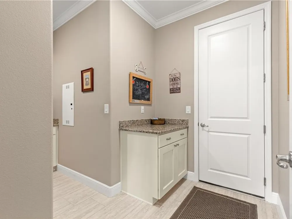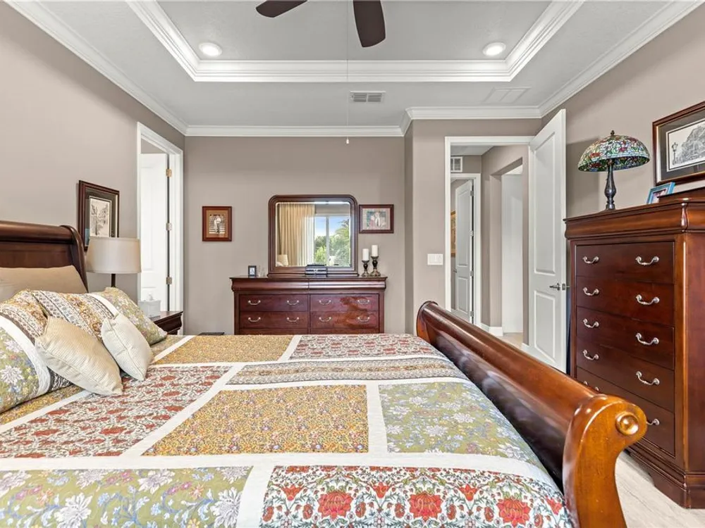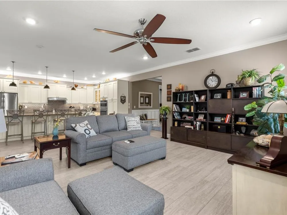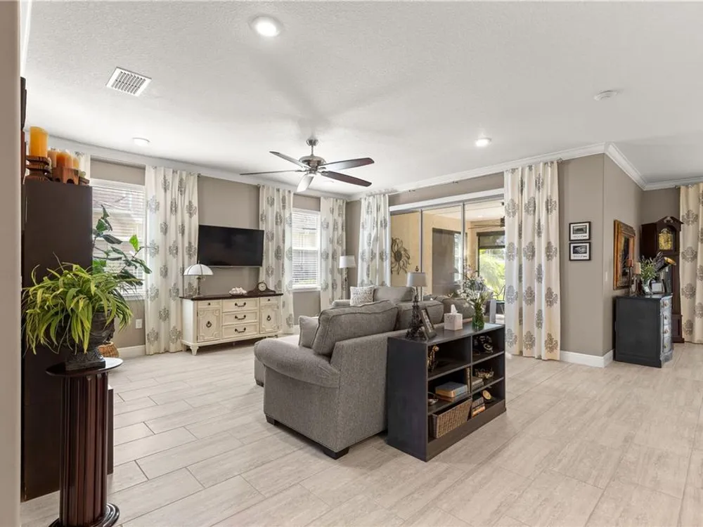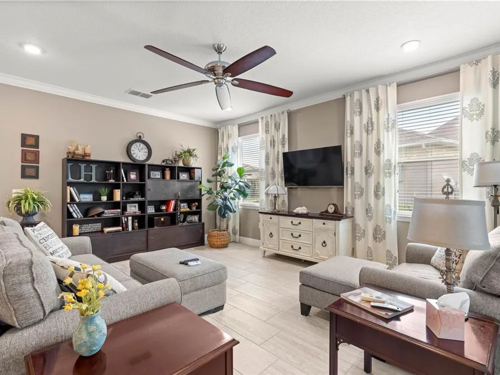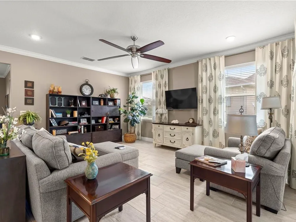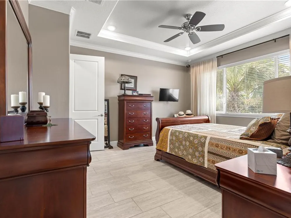 - Ceiling Fan(s), Crown Molding, Eat-in Kitchen, High Ceilings, Kitchen/Family Room Combo, Living/Dining Room, Open Floorplan, Main Level Primary, Smart Home, Stone Counters, Thermostat, Tray Ceiling(s), Walk-In Closet(s), Window Treatments