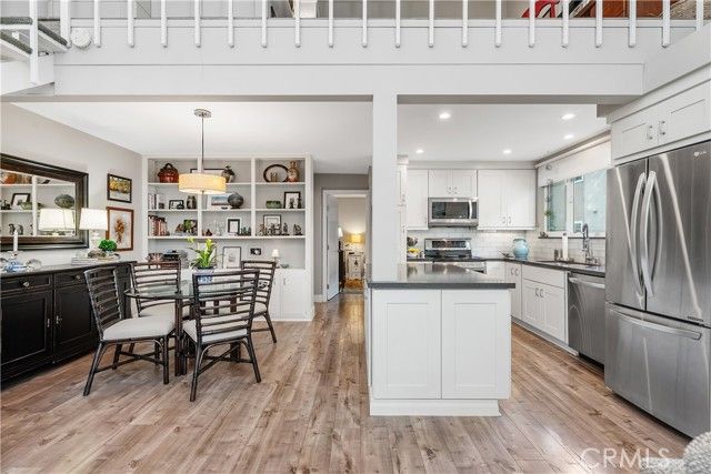Fabulous light and bright SEVILLE model in the resort-style 55+ community of Laguna Woods Village! Great location adjacent to Serpentine walk. This beautifully remodeled 2 bedroom 2 bathroom home feels like a tranquil garden retreat. Lush tropical landscaping and a gated front patio create an outdoor room for morning coffee or evening entertaining. Step inside to a dramatic great room with soaring ceiling, clerestory windows that fill the home with natural light. Easy care luxury wood-look plank flooring runs throughout both levels and a soft neutral color palette gives the home a warm, modern feel. The spacious living room opens to the patio through large slider, creating indoor and outdoor living. The well appointed remodeled kitchen is the heart of the home with crisp white Shaker cabinetry, solid-surface Quartz counters, subway tile backsplash, recessed lighting, and stainless finish appliances. The generous center island with abundant storage flows into the dining area with custom built-in shelving. The main floor bedroom enjoys peaceful greenery views through large dual-pane windows and features mirrored wardrobe doors and a mini split system. The gorgeous downstairs bath feels like a spa with a wide vanity and framed mirror, custom tile and a large walk-in shower with frameless glass enclosure and built-in bench. A convenient full-size stacked LG washer and dryer are located in the bathroom. An open staircase leads to an expansive loft style family room, perfect for a den, media room, art studio or home office. French doors open to the upstairs bedroom suite with its own mini split unit, a generous walk-in closet with custom organizers and a private balcony that overlooks the pretty courtyard setting. The upstairs bath is beautifully remodeled with marble-look tile, glass shower enclosure and plentiful cabinet storage. Additional features include updated dual-pane windows and multiple mini split systems for efficient year-round comfort. Residents of Laguna Woods Village enjoy 7 clubhouses, 5 pools, private golf (27-hole championship and 9-hole par 3 courses), tennis and pickleball courts, lawn bowling, shuffleboard, craft and hobby workshops, garden centers, game and billiard rooms, gyms, horse stables, libraries, an active theater and arts community and over 200 social clubs, all within a beautifully landscaped, guard-gated golf community close to freeways, shopping, restaurants, medical facilities and the beach.