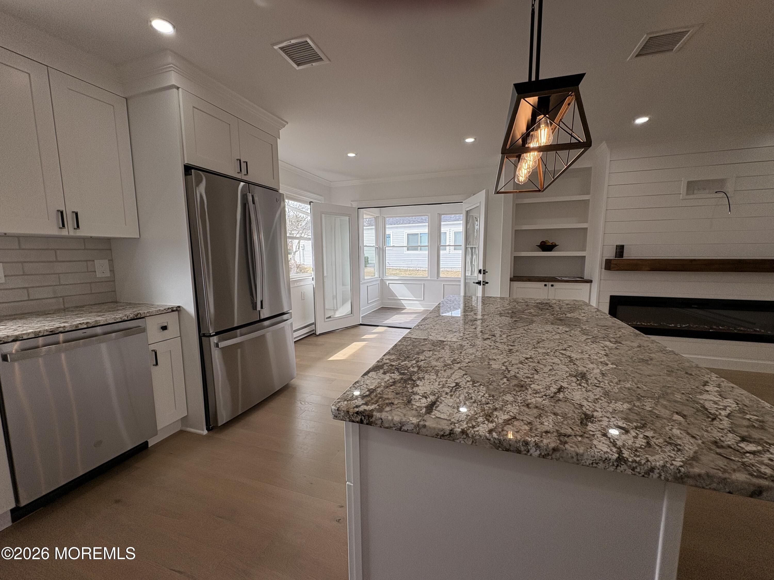 Fresh and bright coastal living! This home has been newly renovated by a local, licensed general contractor/carpenter. Favorite things: large eat in kitchen with brand new cabinets and appliances, shiplap, detail, island with seating for four, beautiful granite/quartz countertops, a custom built-in entertainment center with electric fireplace, hardwood floors throughout, recessed lighting throughout, brand new tiled bathroom with walk-in shower. Crown molding throughout the main living area and kitchen along with detailed baseboard trim throughout. Every door, including front entry and back door has been replaced. New hardware has been installed. Brand new French doors open to a darling three season room that features large windows to welcome the afternoon sun.