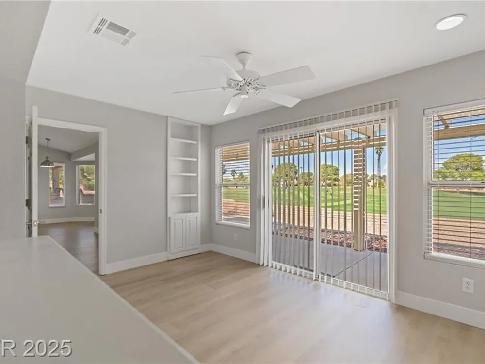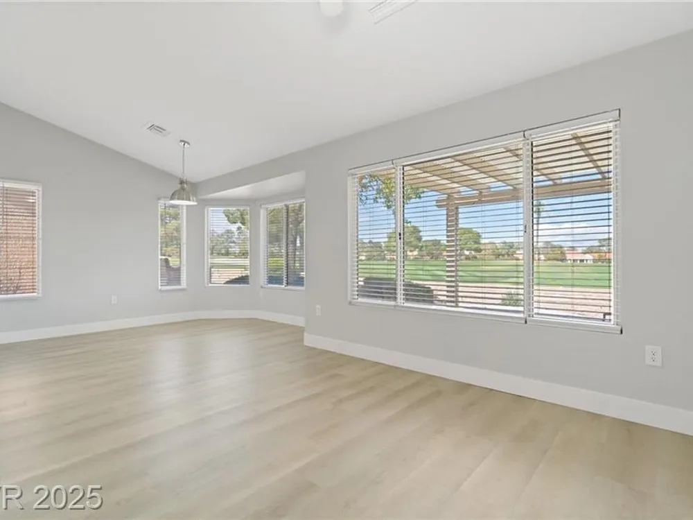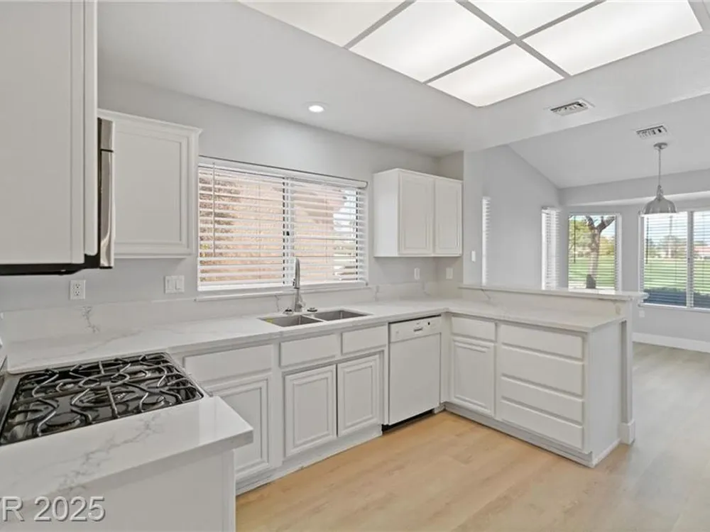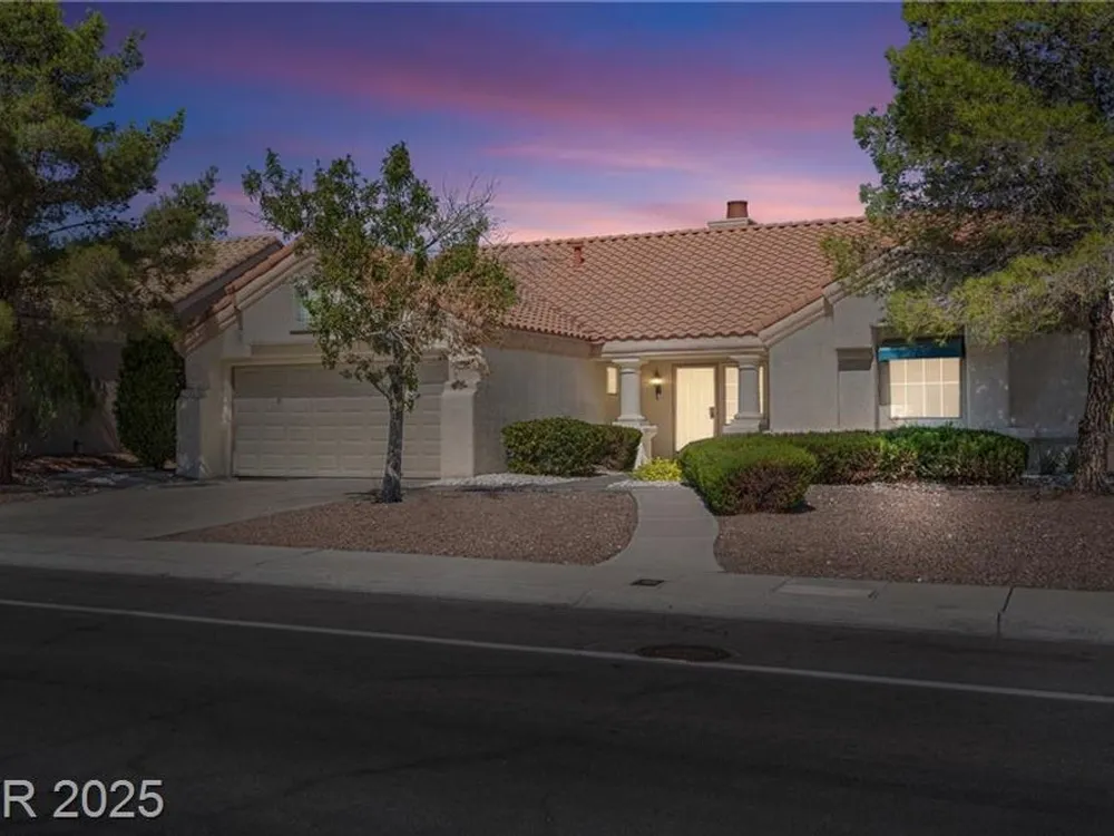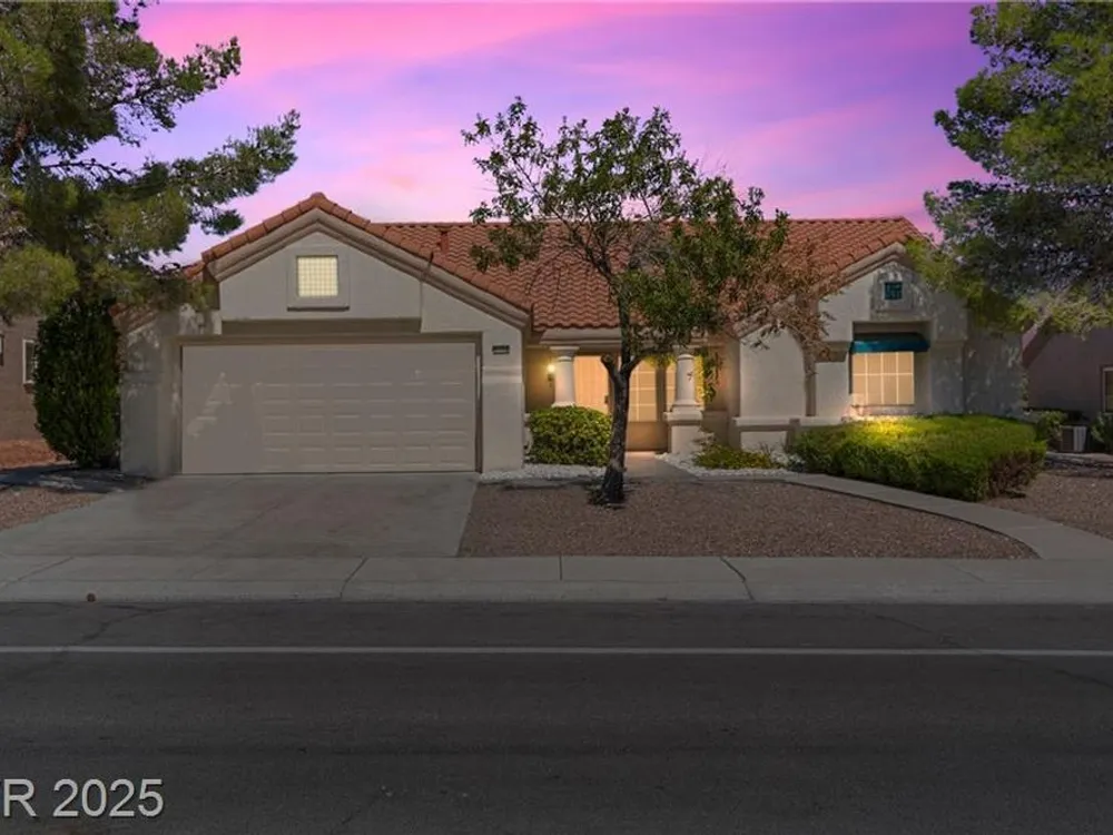 9104 Sundial Dr is a 2 bedroom 2 bathroom single family home located in the Sun City Anthen community. The home is a 1,653 square foot home on a 6,970 square foot lot. The Kitchens and bathrooms have been outfitted with brand new granite countertops. Brand new vinyl flooring throughout the house. New fixtures, chandeliers, and blinds as well. The backyard opens up to a spacious patio that overlooks the 10th green on Palm Valley Golf Course. A must see view. House is located in a quiet 50 and older community. The floor plan is open with a large living room and dining area. Both bedrooms are large and spacious. Primary bedroom has its own large attached bathroom. There is a small isolated room, with built in shelving, that makes for a great office space or study. The house has an attached 2 car garage, and is just a stone's throw away from popular Summerlin shopping and dining areas. Come take a look.