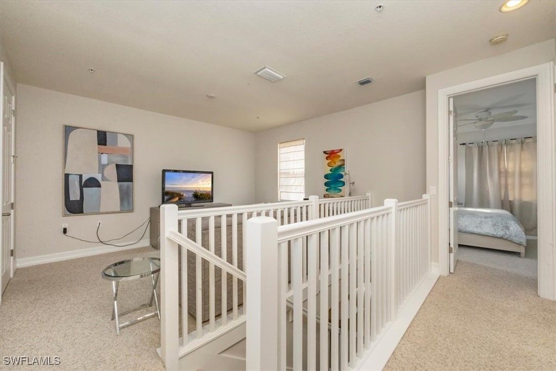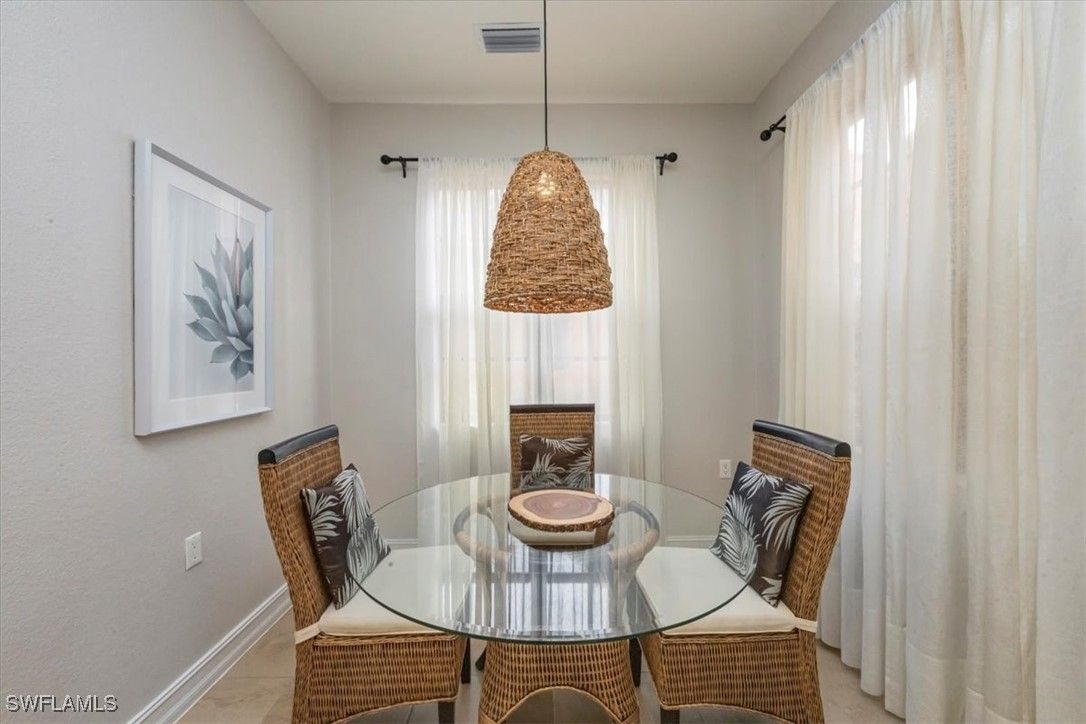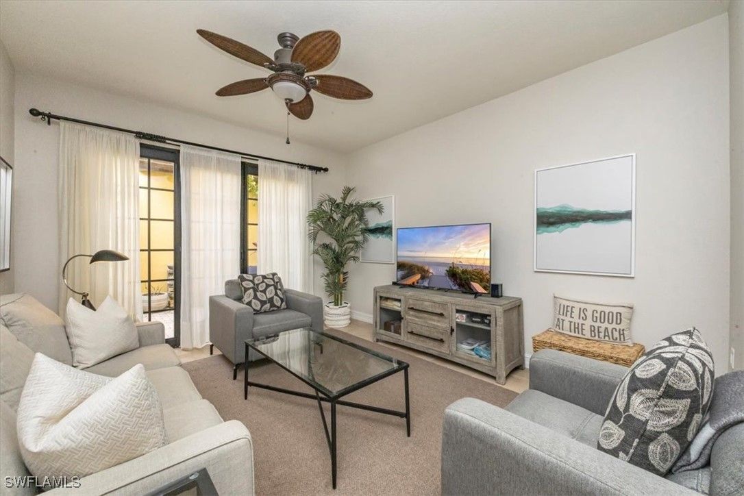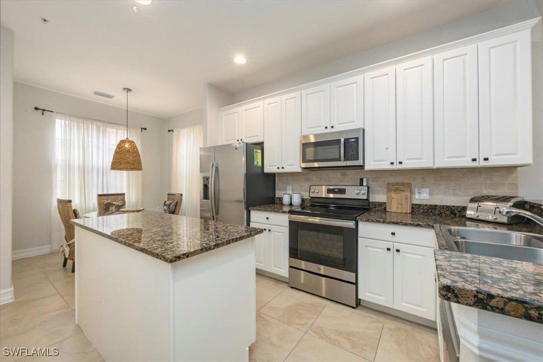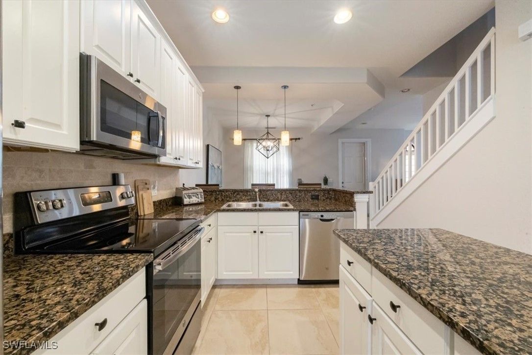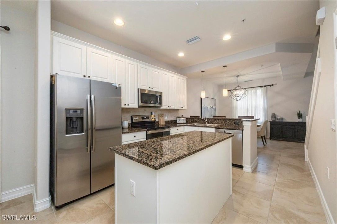 Open floor plan and lives like a single-family home with no common walls with neighbors. This furnished Casita model is a 2 bedroom plus loft/den with sleeper sofa, and 2 ½ baths. First floor living areas include kitchen with walk-in pantry and granite island, dining room, living room with French door to outside patio, and half bath. Upstairs are two bedrooms and loft with two full bathrooms. Primary bath features dual sinks, walk-in shower, soaking tub, and large spacious closet. Freshly painted and tastefully furnished. Attached 2 car garage. Walking distance to town center to enjoy all the amenities Ole has to offer including a resort style pool, pub, restaurant, movie theater, fitness center, tennis courts and access to three championship golf courses with two public options and one private, Great location to downtown Naples and the white sandy beaches.