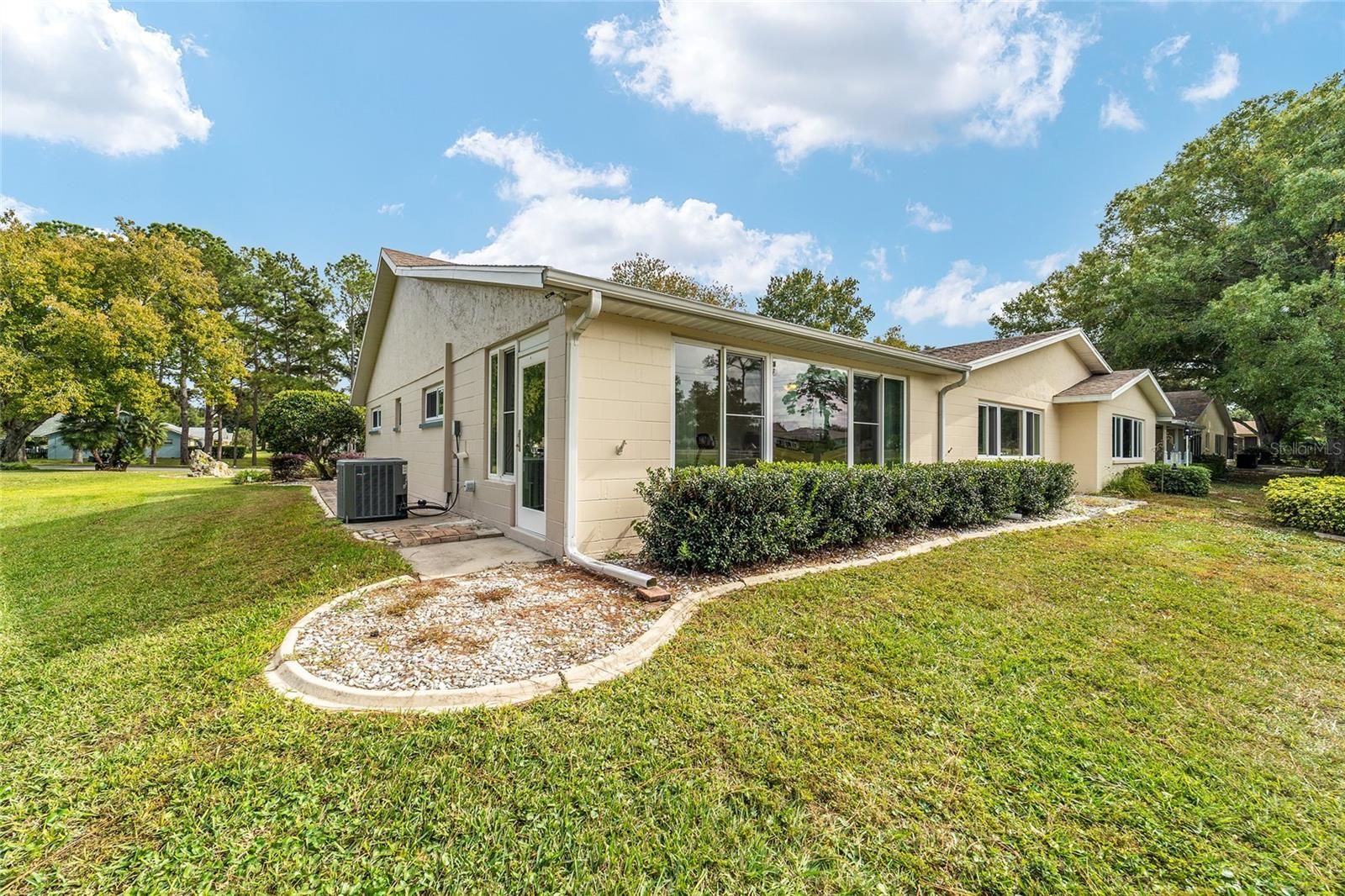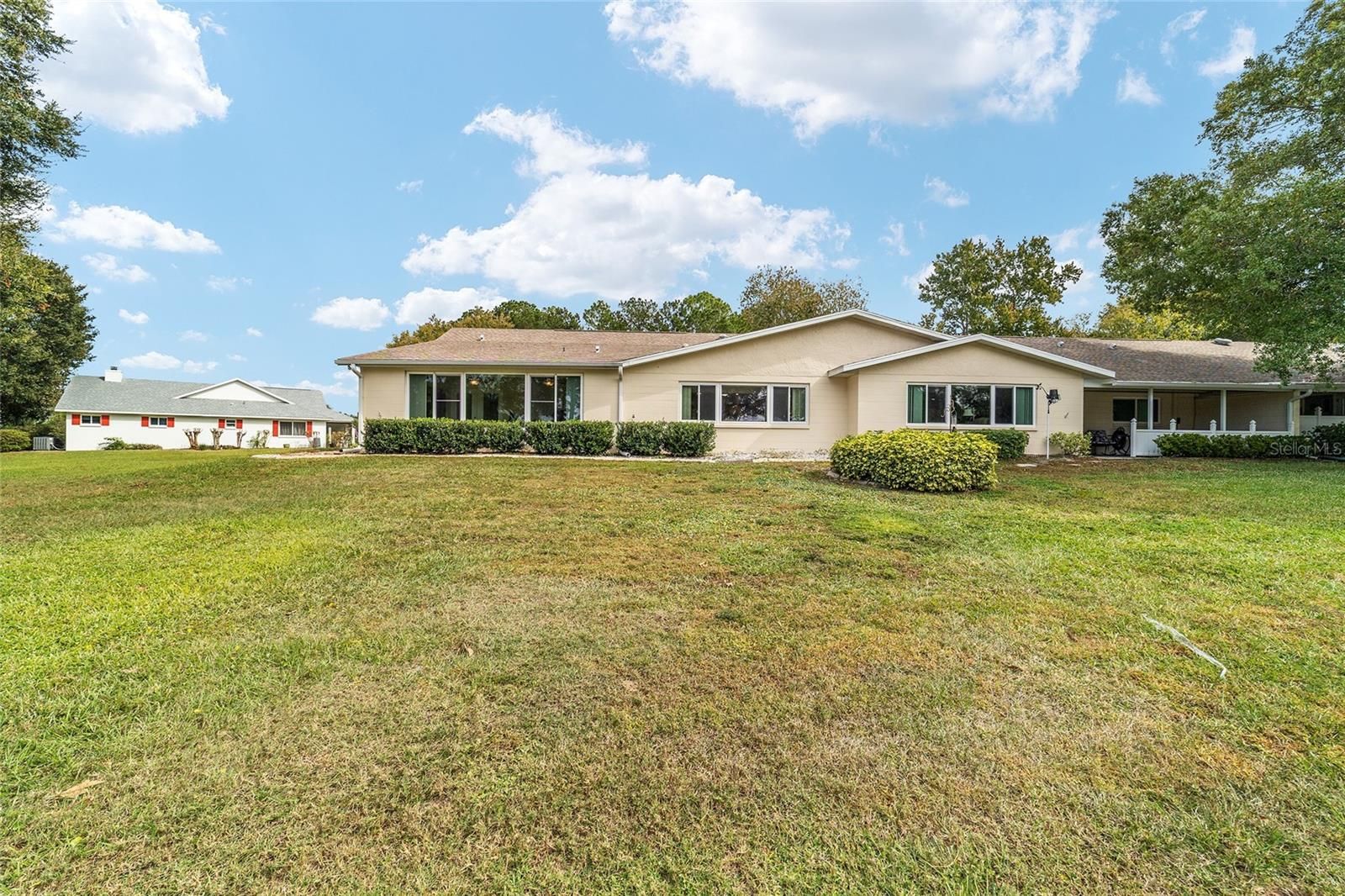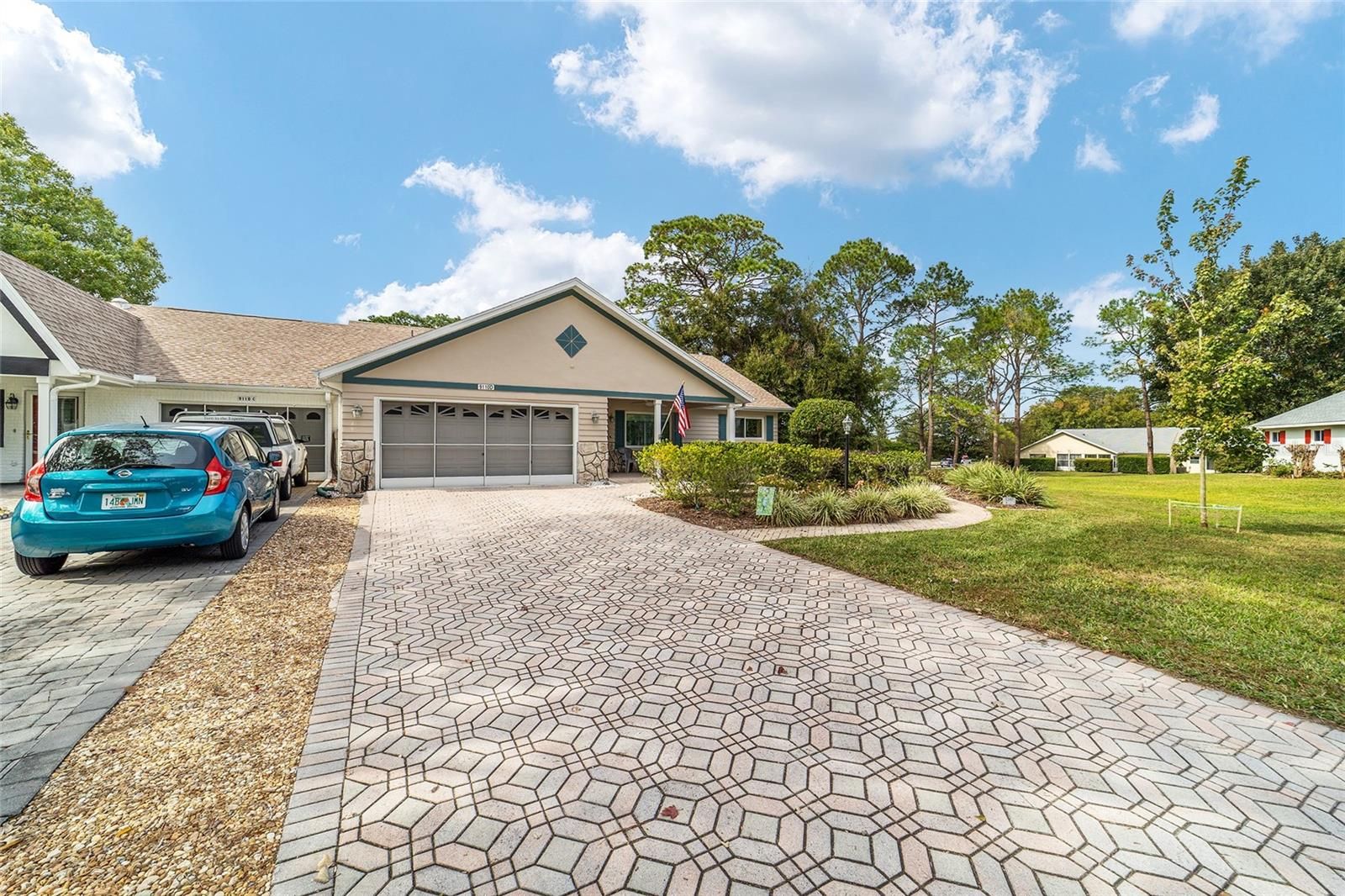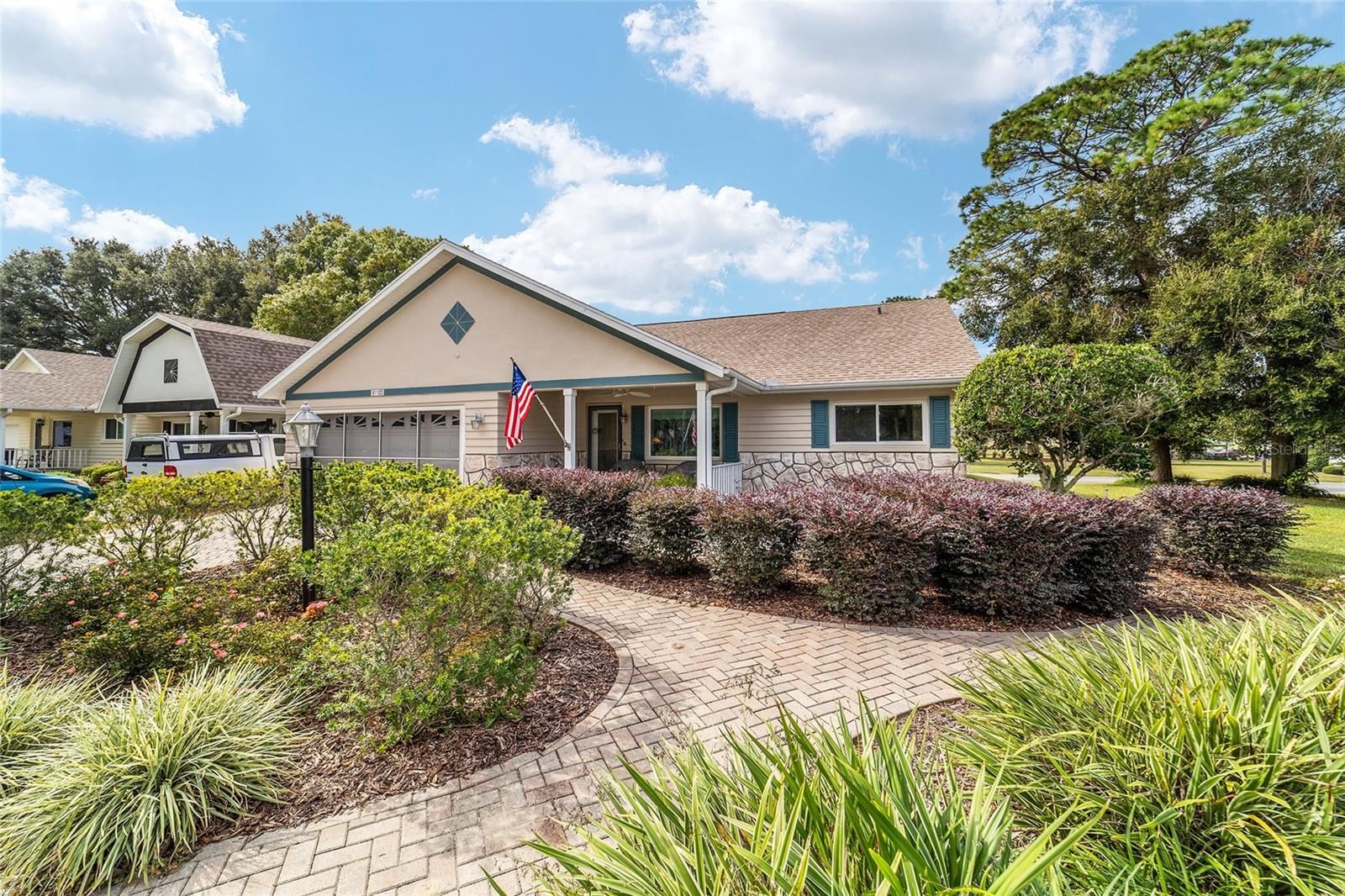 PRIVATE LOT: This beautifully updated DOUBLE Expanded Bostonian offers 2 bedrooms, 2 bathrooms, 2 car garage and a versatile flex room off the primary suite, accessible through elegant French doors. The flex space provides endless possibilities- it can serve as a private office, man cave, enclosed lanai, or craft room. The home showcases new luxury vinyl plank flooring throughout, an updated kitchen, and stylishly renovated bathrooms. The kitchen features newer cabinets, solid surface countertops, stainless steel appliances including a brand-new KitchenAid refrigerator- plus a generous center island, pantry, and abundant storage. It seamlessly overlooks an expanded great room with built in bookshelves, creating an ideal setting for entertaining or relaxing. Both bathrooms have been tastefully updated with upgraded tile, new vanities, and modern shower enclosures. The guest bathroom features a therapeutic walk-in spa for added comfort. Additional updates include a newer roof(), windows(), water softener, and HVAC system(), ensuring peace of mind and energy efficiency. This desirable end unit offers exceptional privacy with no rear or front neighbors and overlooks a serene, park-like setting from the front porch. Curb appeal is top notch from the paver driveway and porch to the raised landscape beds. This thoughtfully enhanced home combines style, comfort, and privacy in one inviting package. On Top of the World in Ocala's premier 55+ golf community offering world-class amenities and golf cart access to shopping, dining, entertainment, health, and beauty.