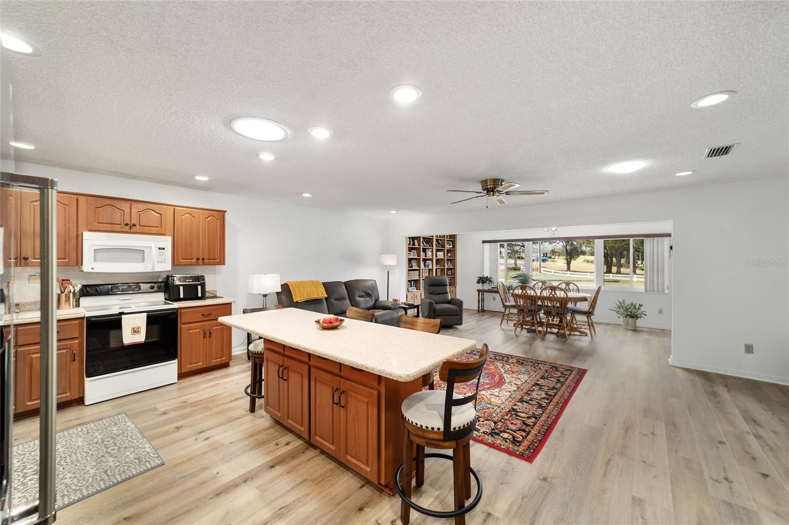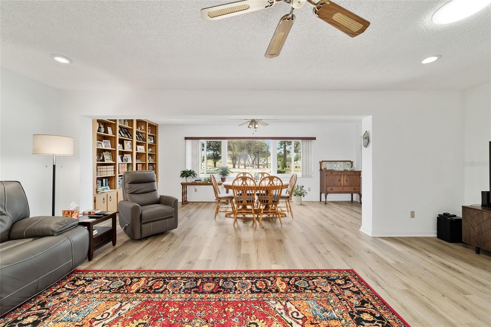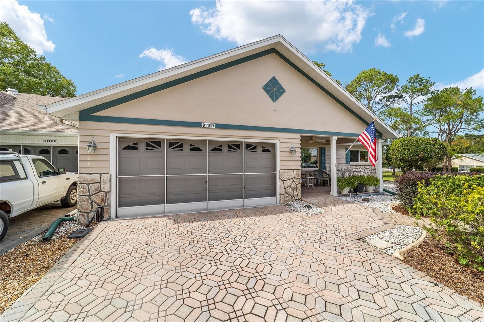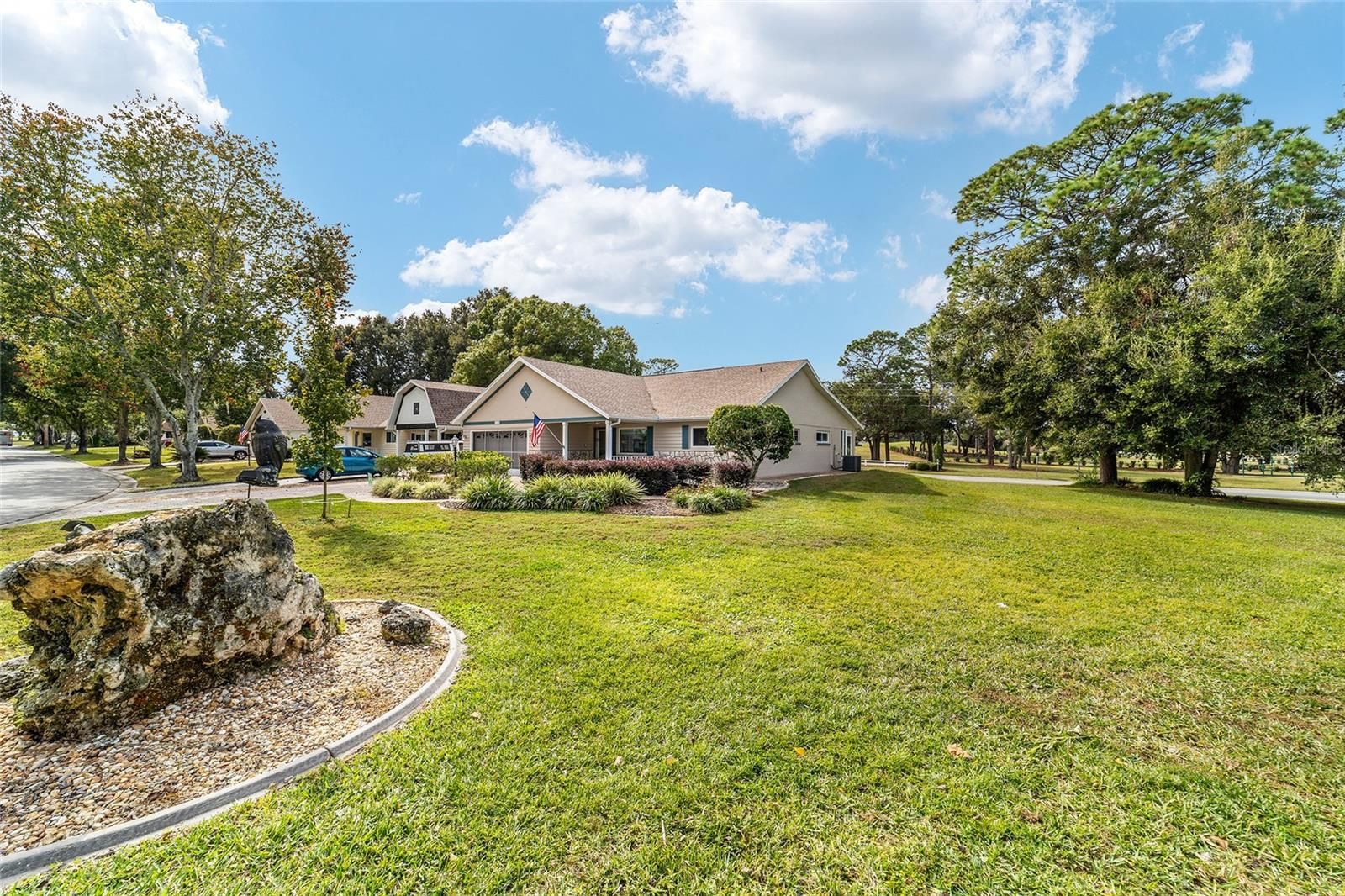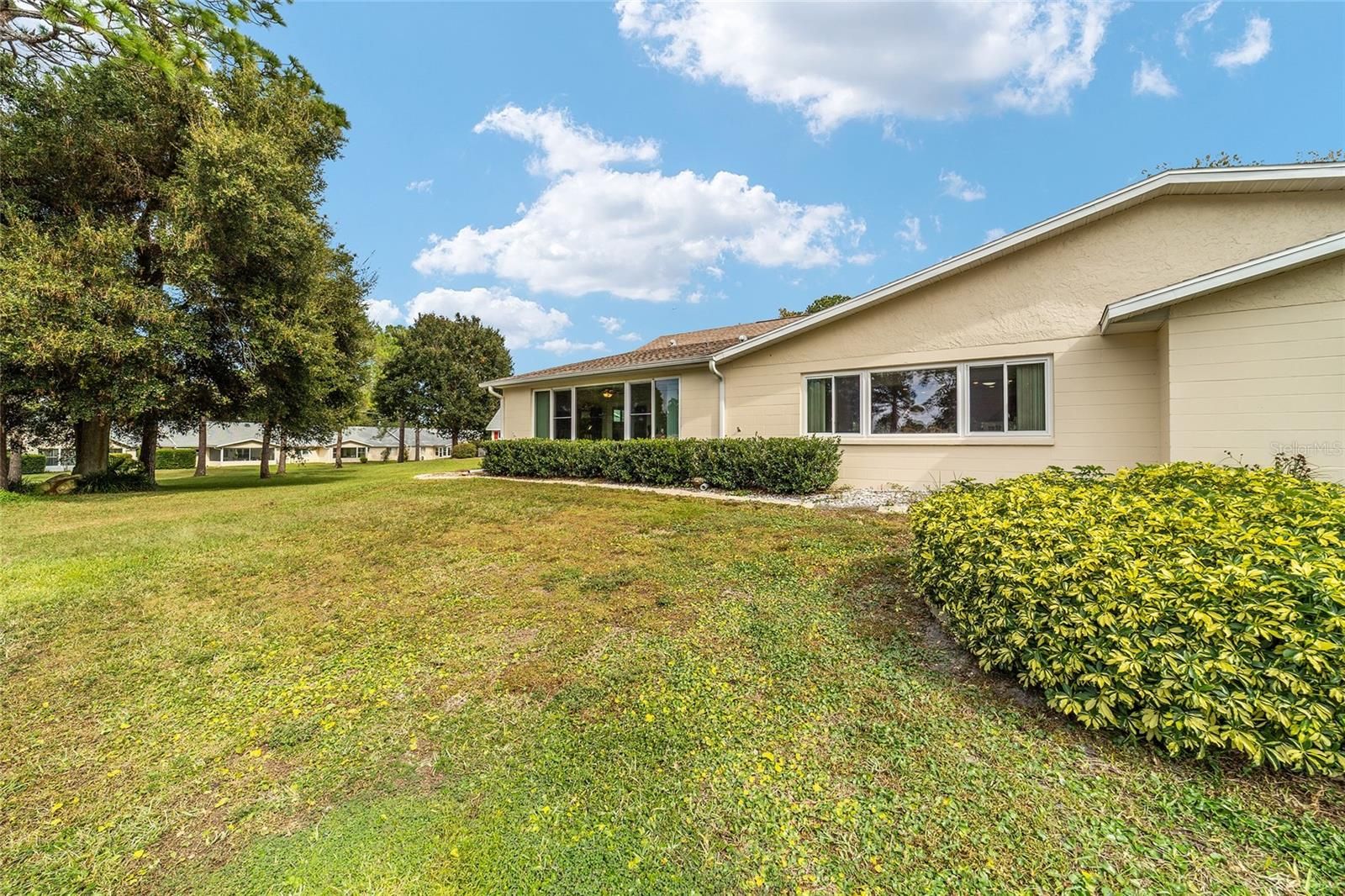 PRIVATE LOT: This beautifully updated DOUBLE Expanded Bostonian offers 2 bedrooms, 2 bathrooms, 2 car garage and a versatile flex room off the primary suite, accessible through elegant French doors. The flex space provides endless possibilities- it can serve as a private office, man cave, enclosed lanai, or craft room. The home showcases new luxury vinyl plank flooring throughout, an updated kitchen, and stylishly renovated bathrooms. The kitchen features newer cabinets, solid surface countertops, stainless steel appliances including a brand-new KitchenAid refrigerator- plus a generous center island, pantry, and abundant storage. It seamlessly overlooks an expanded great room with built in bookshelves, creating an ideal setting for entertaining or relaxing. Both bathrooms have been tastefully updated with upgraded tile, new vanities, and modern shower enclosures. The guest bathroom features a therapeutic walk-in spa for added comfort. Additional updates include a newer roof(), windows(), water softener, and HVAC system(), ensuring peace of mind and energy efficiency. This desirable end unit offers exceptional privacy with no rear or front neighbors and overlooks a serene, park-like setting from the front porch. Curb appeal is top notch from the paver driveway and porch to the raised landscape beds. This thoughtfully enhanced home combines style, comfort, and privacy in one inviting package. On Top of the World in Ocala's premier 55+ golf community offering world-class amenities and golf cart access to shopping, dining, entertainment, health, and beauty.