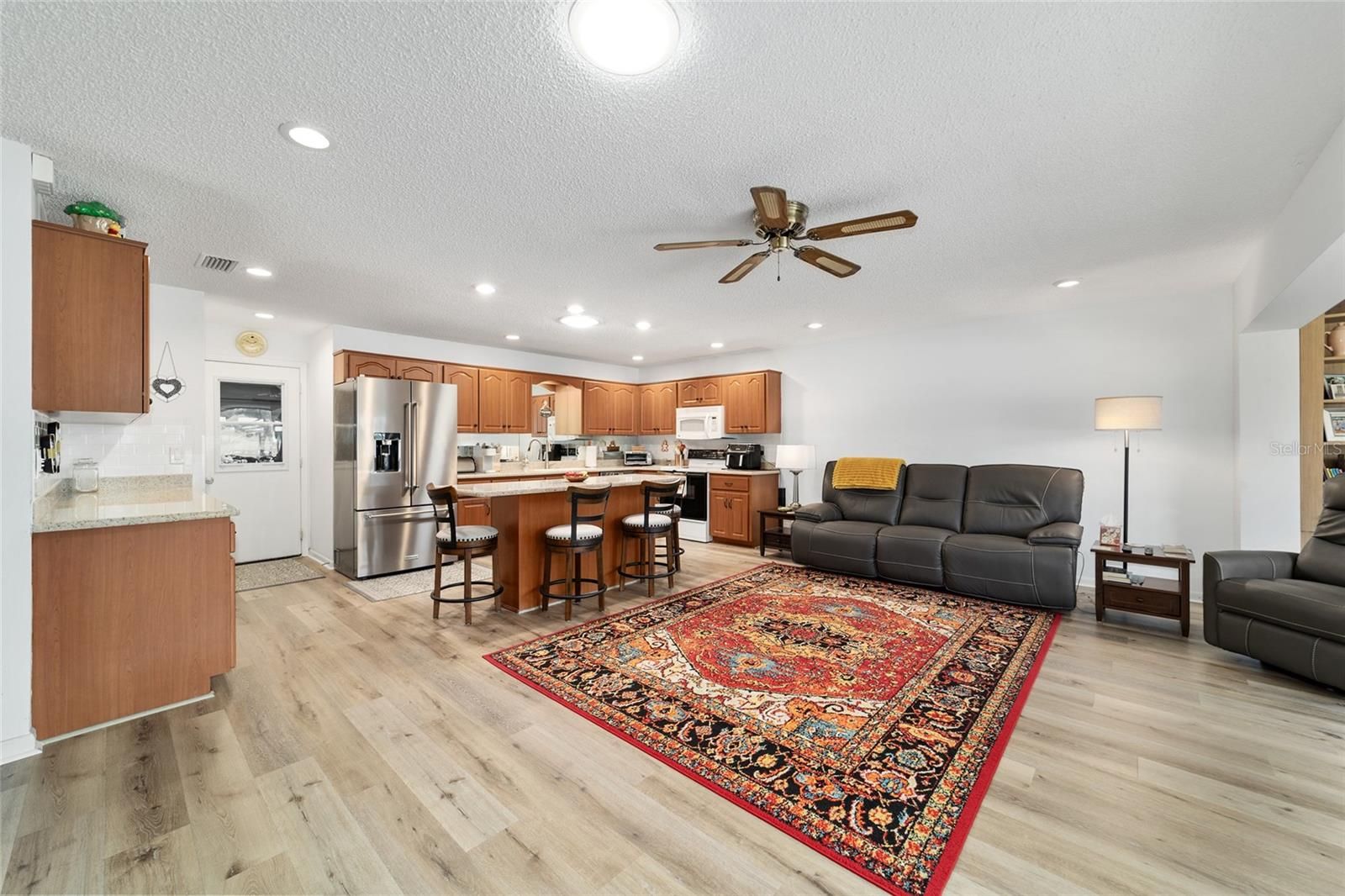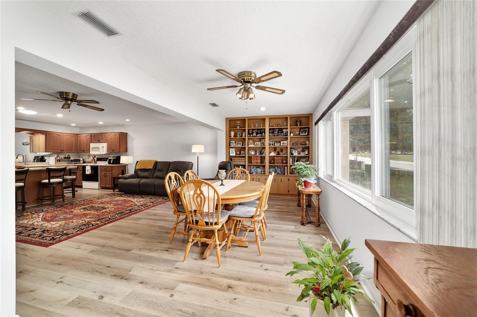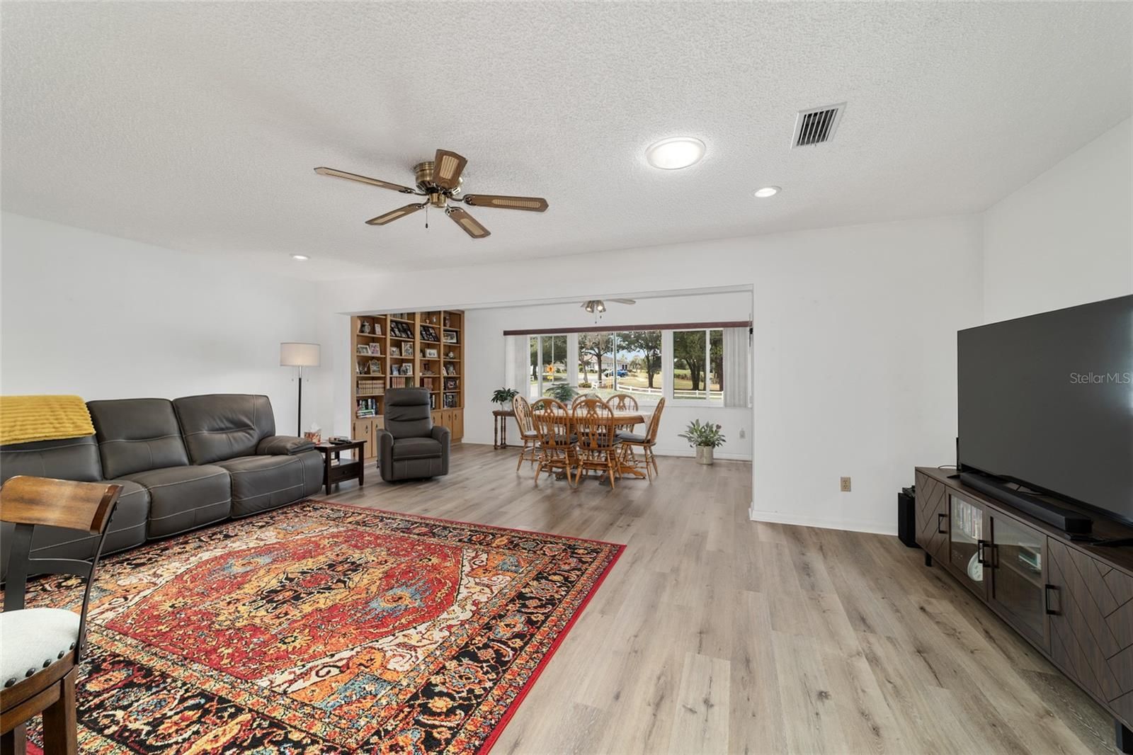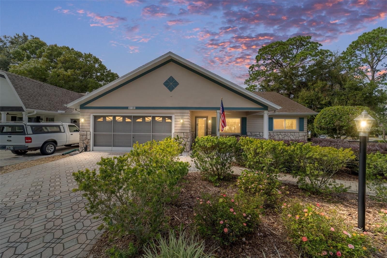 PRIVATE LOT: This beautifully updated DOUBLE Expanded Bostonian offers 2 bedrooms, 2 bathrooms, 2 car garage and a versatile flex room off the primary suite, accessible through elegant French doors. The flex space provides endless possibilities- it can serve as a private office, man cave, enclosed lanai, or craft room. The home showcases new luxury vinyl plank flooring throughout, an updated kitchen, and stylishly renovated bathrooms. The kitchen features newer cabinets, solid surface countertops, stainless steel appliances including a brand-new KitchenAid refrigerator- plus a generous center island, pantry, and abundant storage. It seamlessly overlooks an expanded great room with built in bookshelves, creating an ideal setting for entertaining or relaxing. Both bathrooms have been tastefully updated with upgraded tile, new vanities, and modern shower enclosures. The guest bathroom features a therapeutic walk-in spa for added comfort. Additional updates include a newer roof(), windows(), water softener, and HVAC system(), ensuring peace of mind and energy efficiency. This desirable end unit offers exceptional privacy with no rear or front neighbors and overlooks a serene, park-like setting from the front porch. Curb appeal is top notch from the paver driveway and porch to the raised landscape beds. This thoughtfully enhanced home combines style, comfort, and privacy in one inviting package. On Top of the World in Ocala's premier 55+ golf community offering world-class amenities and golf cart access to shopping, dining, entertainment, health, and beauty.