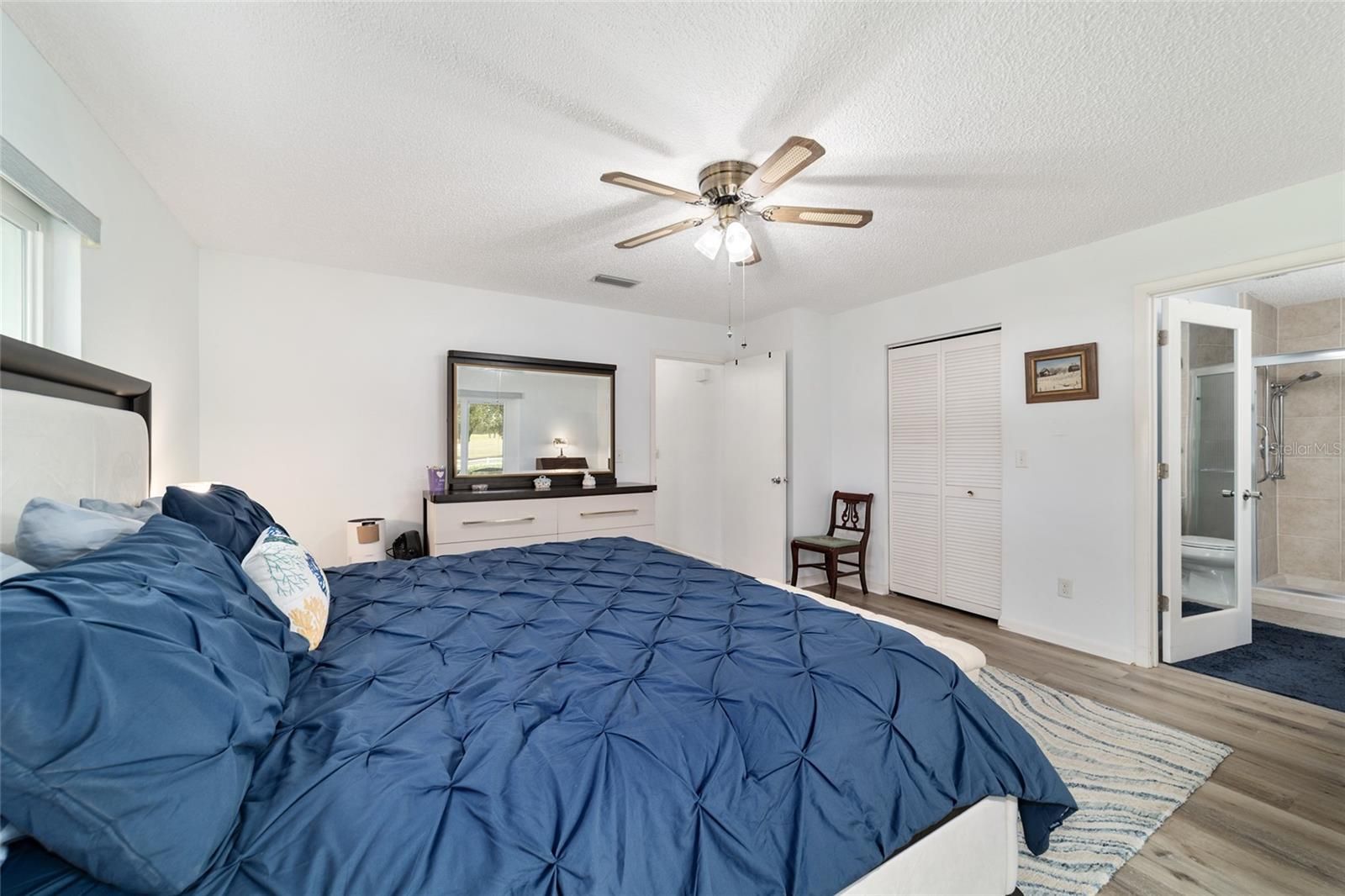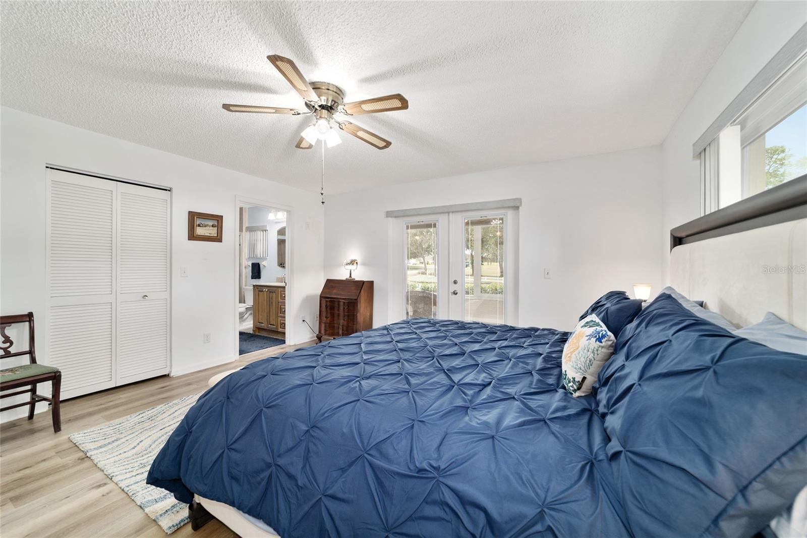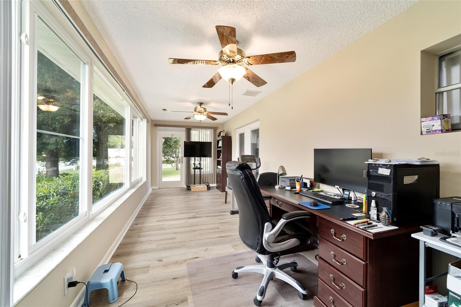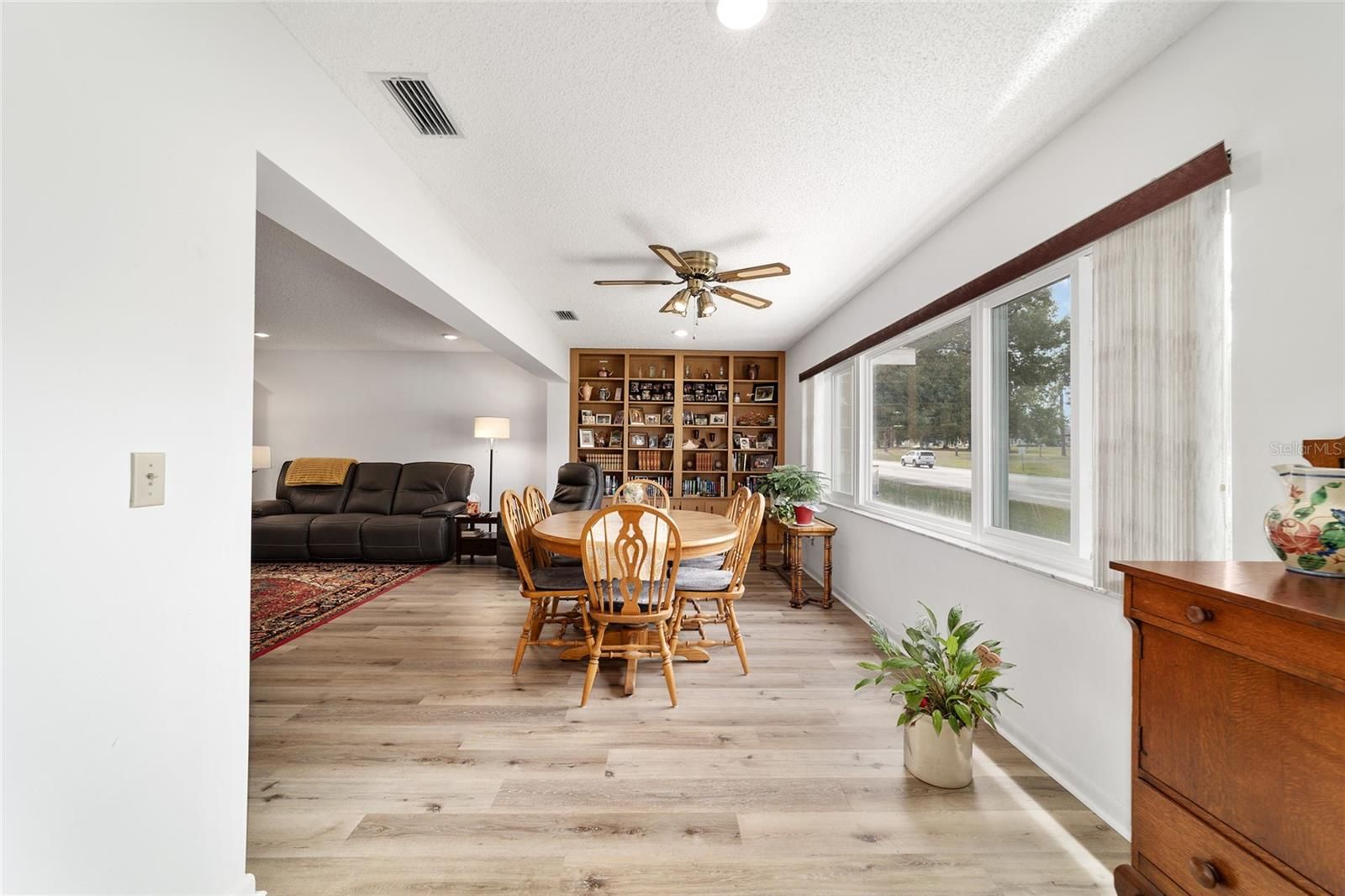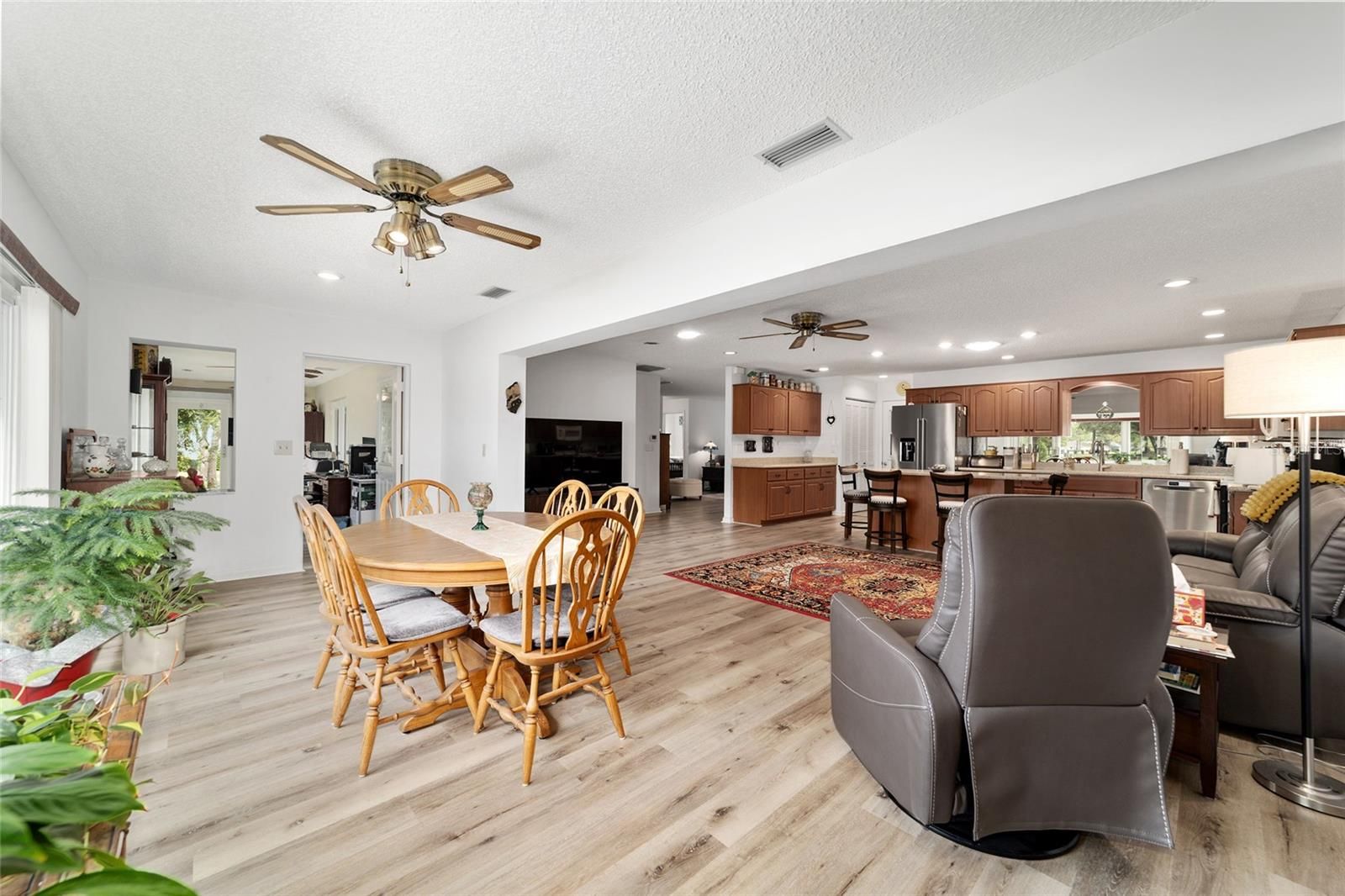 PRIVATE LOT: This beautifully updated DOUBLE Expanded Bostonian offers 2 bedrooms, 2 bathrooms, 2 car garage and a versatile flex room off the primary suite, accessible through elegant French doors. The flex space provides endless possibilities- it can serve as a private office, man cave, enclosed lanai, or craft room. The home showcases new luxury vinyl plank flooring throughout, an updated kitchen, and stylishly renovated bathrooms. The kitchen features newer cabinets, solid surface countertops, stainless steel appliances including a brand-new KitchenAid refrigerator- plus a generous center island, pantry, and abundant storage. It seamlessly overlooks an expanded great room with built in bookshelves, creating an ideal setting for entertaining or relaxing. Both bathrooms have been tastefully updated with upgraded tile, new vanities, and modern shower enclosures. The guest bathroom features a therapeutic walk-in spa for added comfort. Additional updates include a newer roof(), windows(), water softener, and HVAC system(), ensuring peace of mind and energy efficiency. This desirable end unit offers exceptional privacy with no rear or front neighbors and overlooks a serene, park-like setting from the front porch. Curb appeal is top notch from the paver driveway and porch to the raised landscape beds. This thoughtfully enhanced home combines style, comfort, and privacy in one inviting package. On Top of the World in Ocala's premier 55+ golf community offering world-class amenities and golf cart access to shopping, dining, entertainment, health, and beauty.