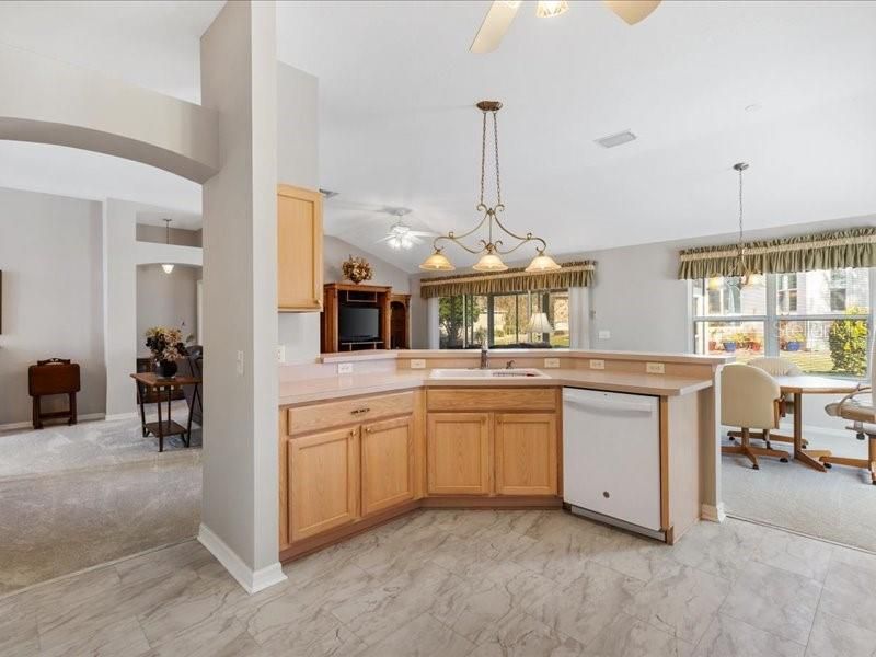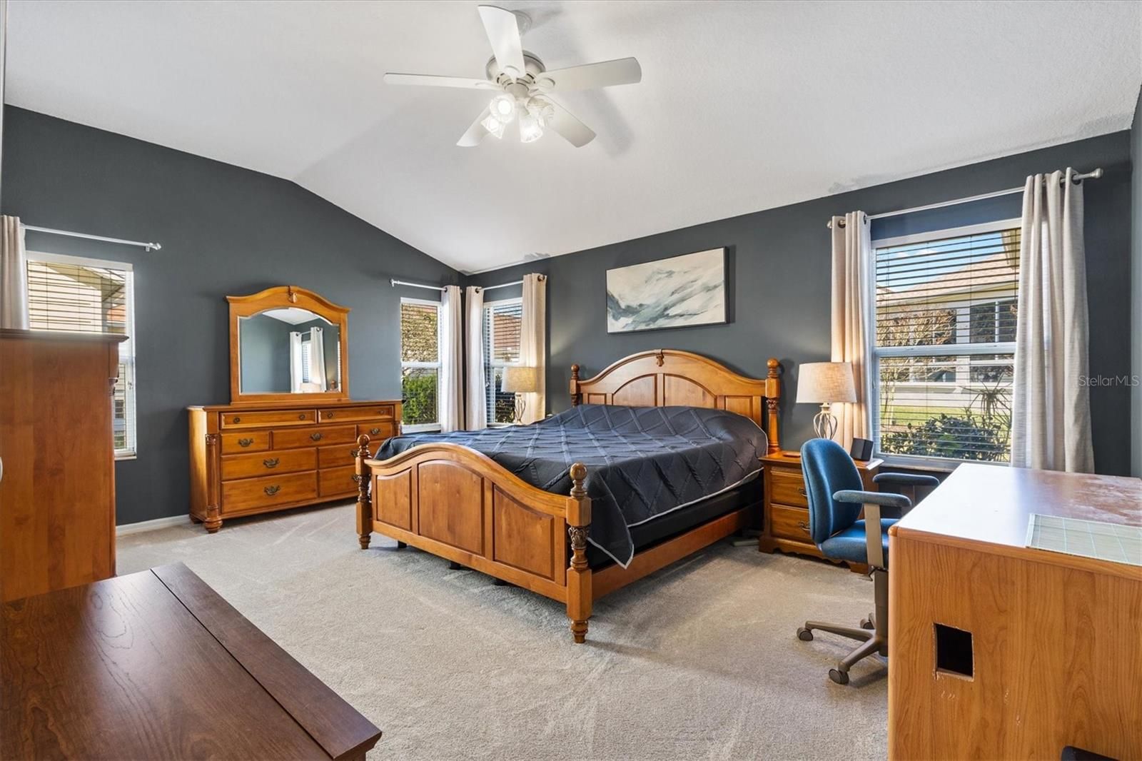 - Ceiling Fan(s), High Ceilings, Kitchen/Family Room Combo, Living/Dining Room, Open Floorplan, Main Level Primary, Solid-Wood Cabinets, Thermostat, Walk-In Closet(s)