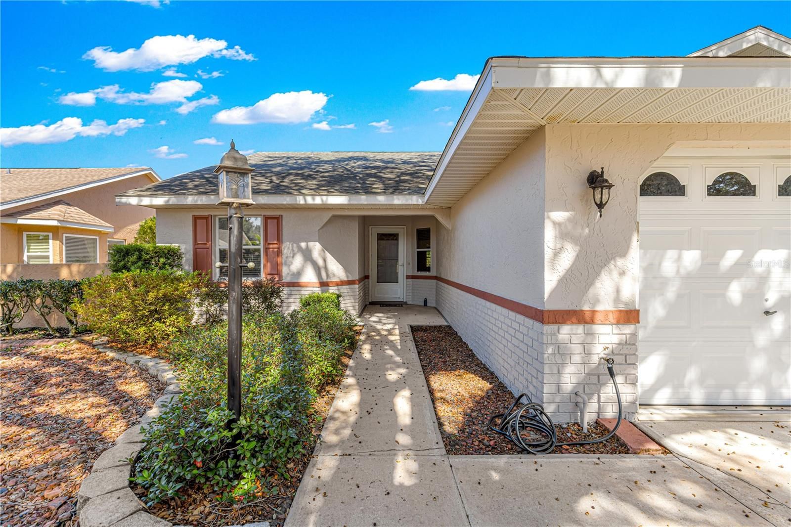 INCREDIBLE PRICE FOR LARGE SQUARE FOOTAGE & GOLF COURSE LIVING > Spacious Washington Model PRIVATE Courtyard Home with 1777 sq. ft. of heated space (2295 under roof) is in the Williamsburg Neighborhood of the Premiere 55+ Gated, Golf Community of On Top of the World. Roof 2015 & HVAC 2023 & FRESHLY PAINTED EXTERIOR. This 2-bedroom, 2 bath, 2-car garage home with vaulted ceilings and massive Great Room is just waiting for a new owner to make it theirs with tons of potential! Step inside into a small foyer. The kitchen is immediately to the right with table space, granite counters, and pantry. The guest bedroom, bath with tub and tile surround, linen and other storage space is immediately inside the front door to the left providing a true split bedroom plan. The great room encompasses the living room, dining room, and Florida room all now open space living! Entrance to the private courtyard that runs the length of the home on the right is via the Florida room and garage side door. Enjoy golf course views from the courtyard – perfect for outside entertaining! The primary bedroom is in the back left of the home for privacy. An ensuite bath has a double vanity, step-in shower, a linen closet, AND walk-in closet! The washer and dryer are in the garage. Notice that the yard has Xeriscape landscaping, saving irrigation water costs! The monthly HOA fee includes basic cable, roof repair, exterior painting every seven years, exterior maintenance and insurance, landscaping, trash, 24/7 guarded gates and all the amenities that OTOW has to offer; three pools (2 outside & 1 inside), two state of the art fitness centers, pickleball courts (COVERED & UNCOVERED), billiards, archery range, corn hole, bocce ball, tennis, shuffleboard, horse shoes, remote control flying field and race cars, 175+ clubs, woodworking shop (extra fee), library, and much, much more! A golf cart community with access to three shopping centers. The home is being sold “AS IS.”