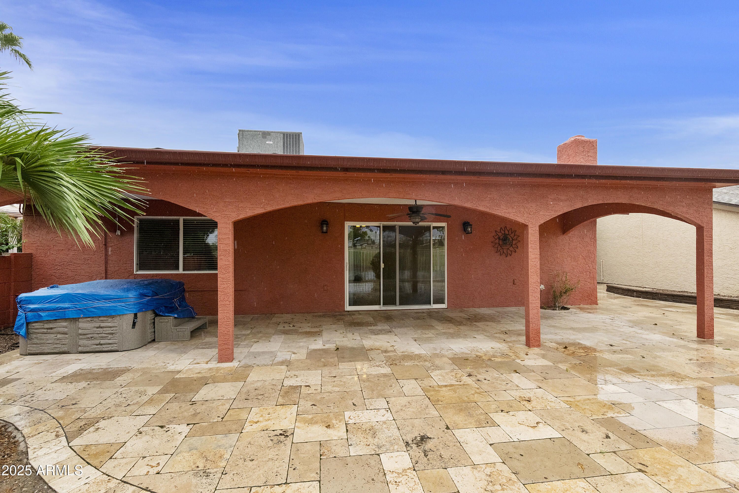 Golf course treasure! Must have 2BR, 2BA PLUS den/office home in the fun active adult community of Sun Lakes Country Club. Towering, vaulted ceilings in the great room with 20' tile flooring, corner fireplace and sliders to the covered, extended travertine patio overlooking the 18th green with a hot tub for those relaxing evenings in this great setting. Split primary suite w/updated walk-in shower, dual sinks & vaulted ceilings. Large spare bedroom w/tons of closet space and an updated spare bath right outside the door. Den/office is also huge and could easily be converted to a third bedroom. Efficient kitchen boasts shaker cabinets, granite counters, SS appliances and a cute breakfast area. Exterior recently painted. This one is truly move-in ready. Start enjoying the countless amenities of Sun Lakes Country Club with golf, tennis, pickleball, pools, restaurants, and so many clubs.