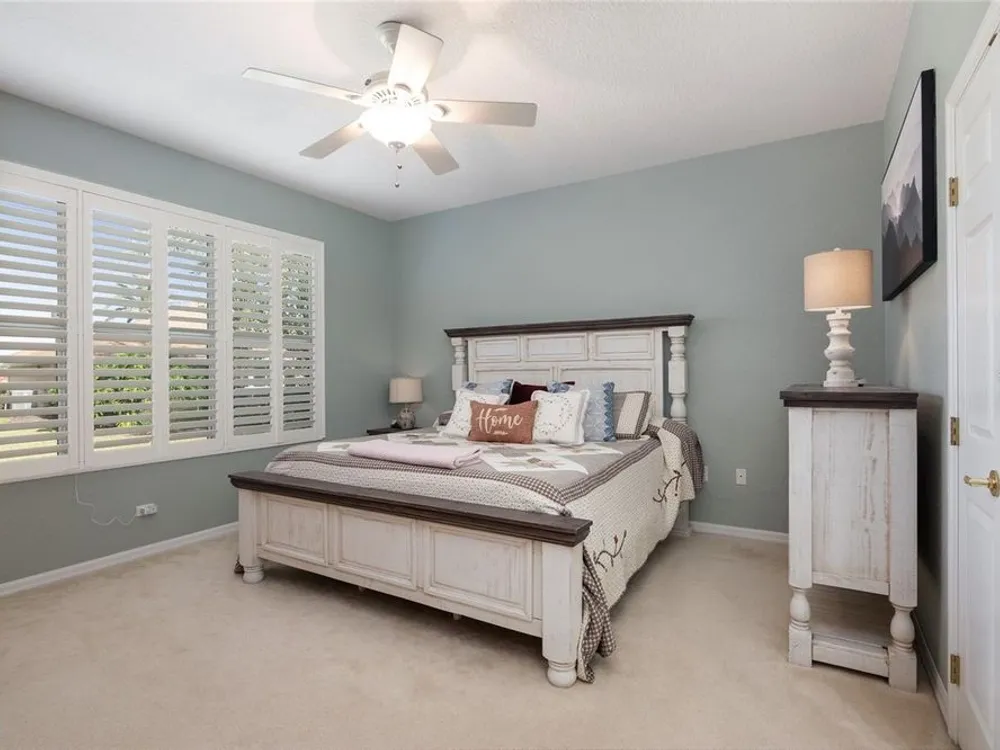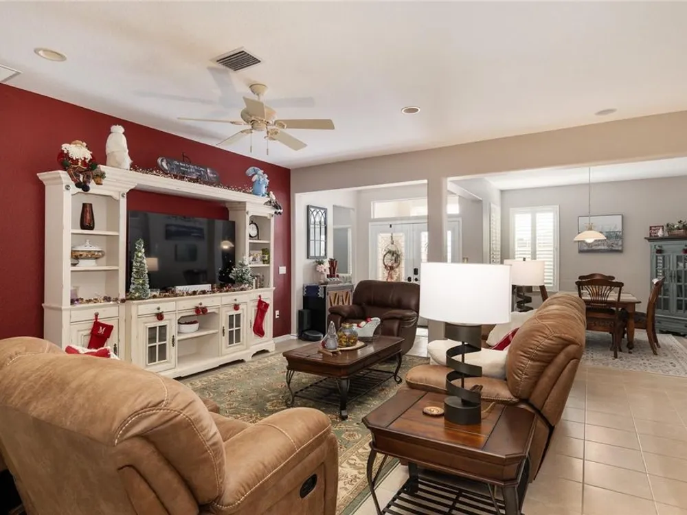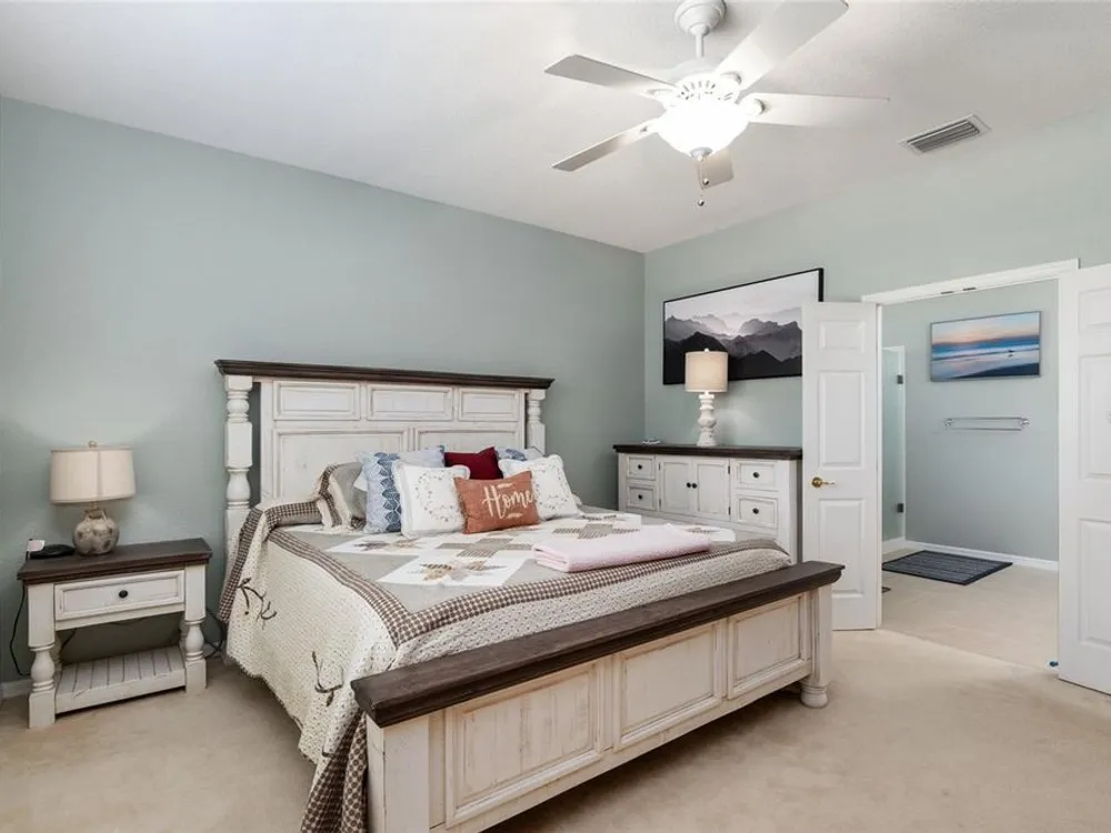 - Ceiling Fan(s), Crown Molding, Eat-in Kitchen, High Ceilings, In-Wall Pest Control, Kitchen/Family Room Combo, Living/Dining Room, Open Floorplan, Main Level Primary, Solid-Wood Cabinets, Stone Counters, Thermostat, Walk-In Closet(s)