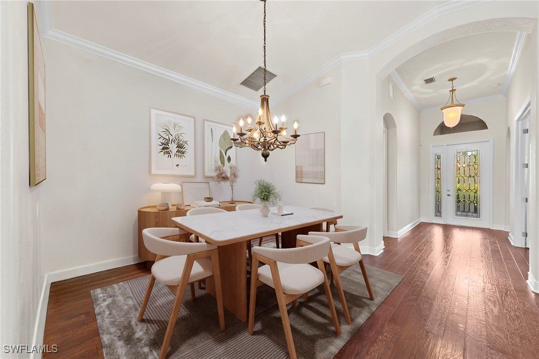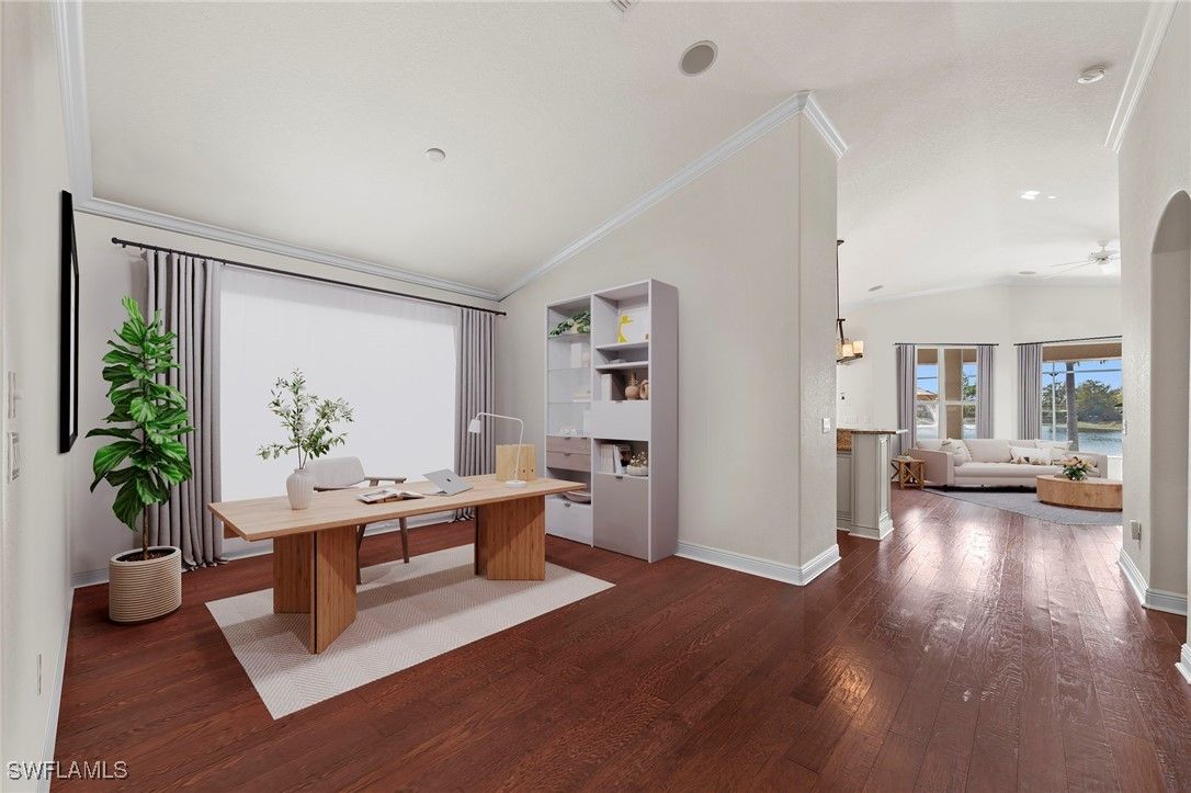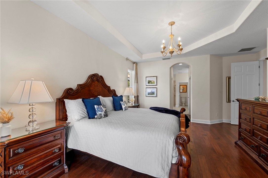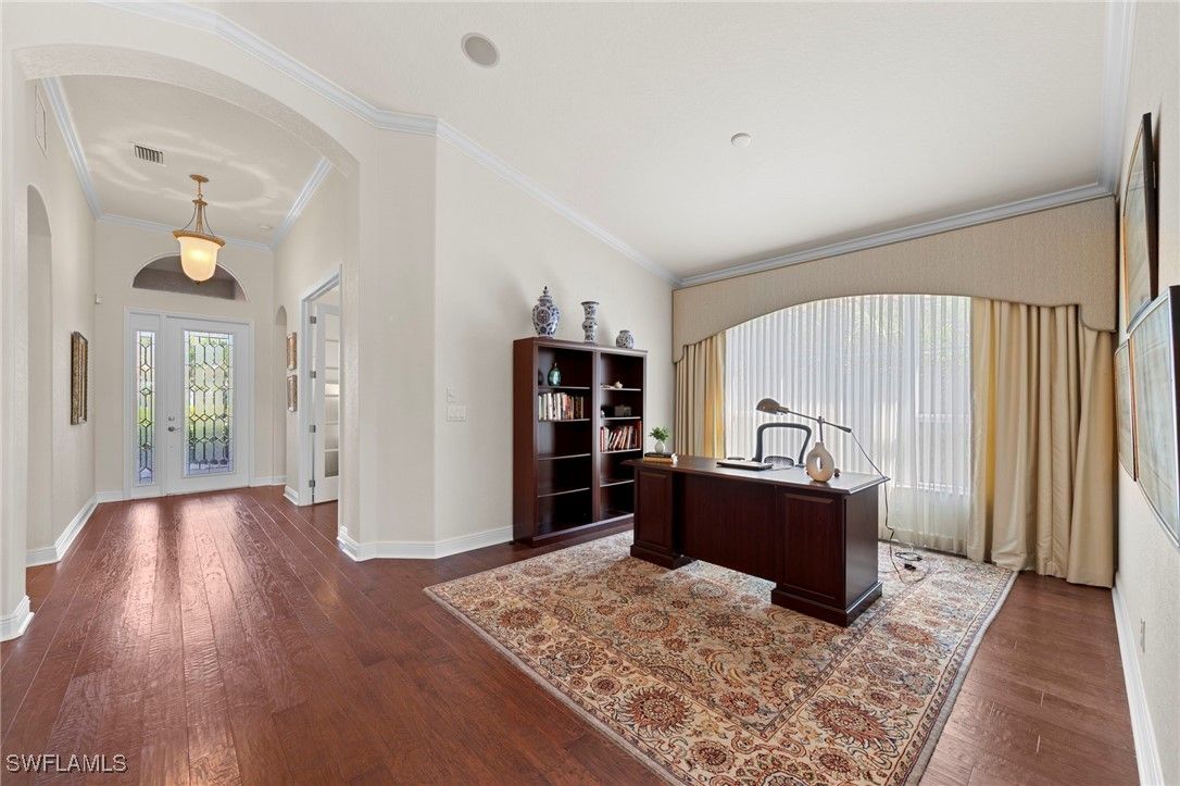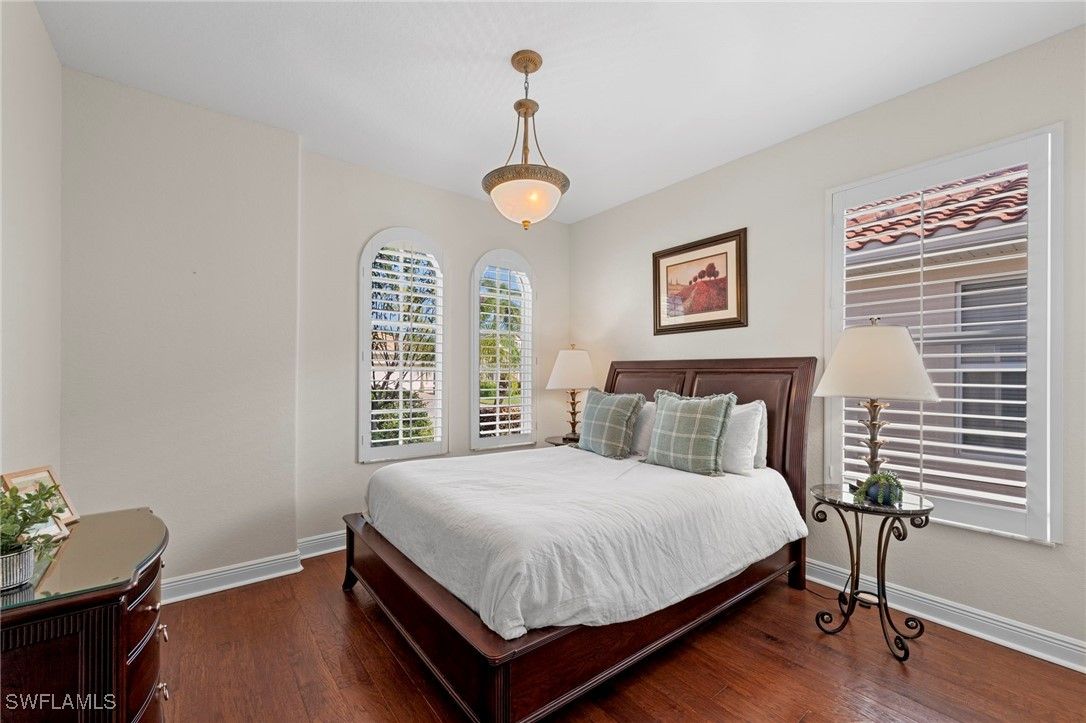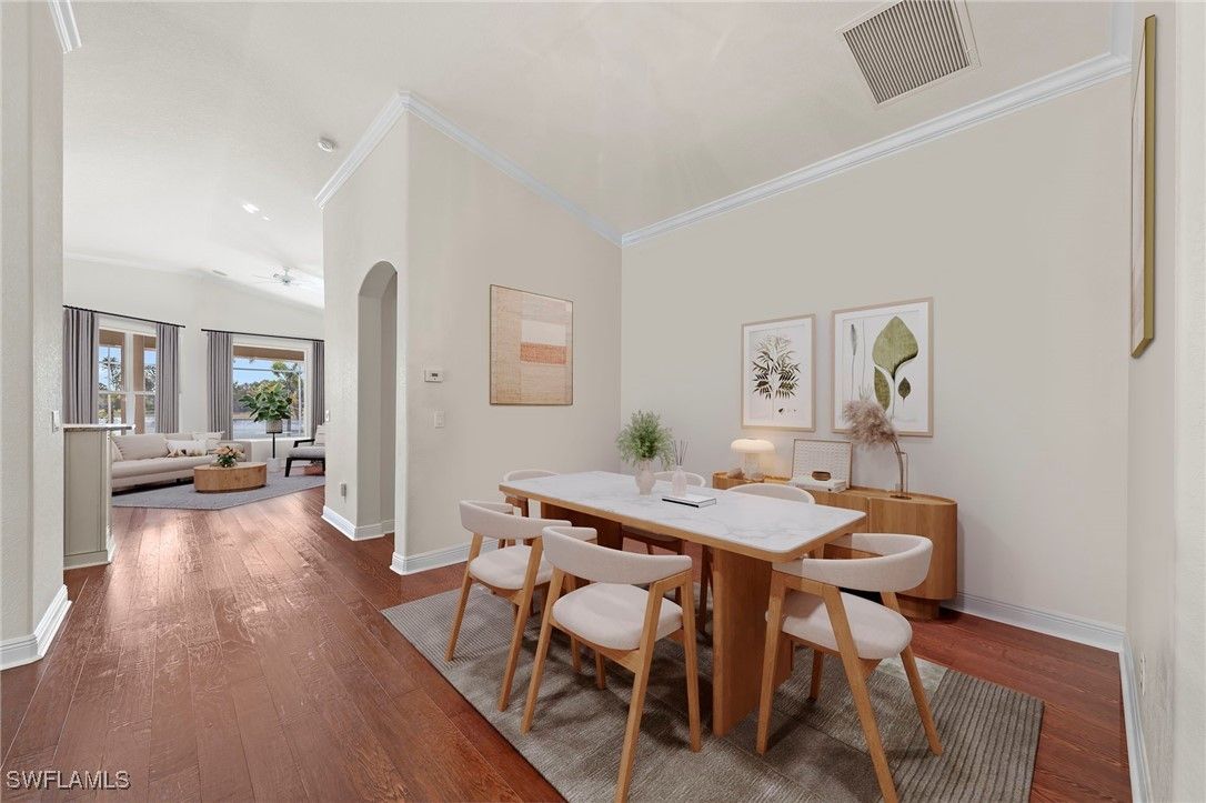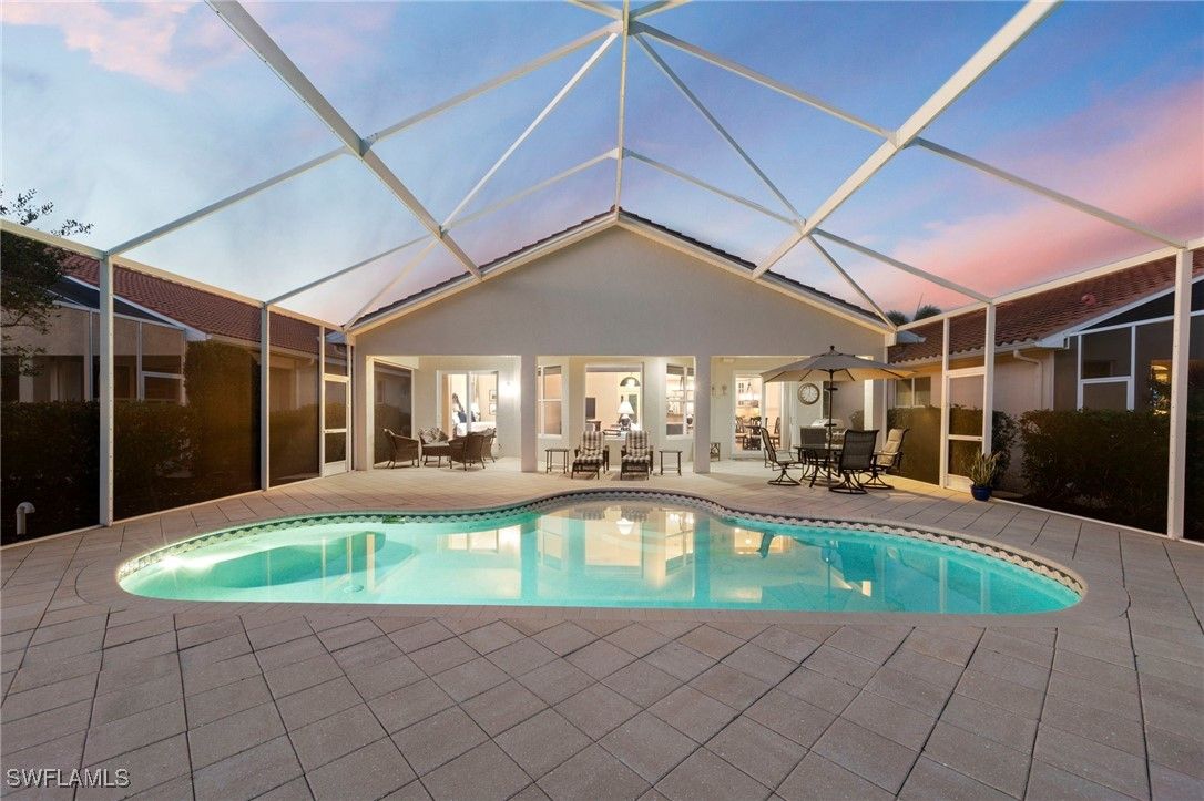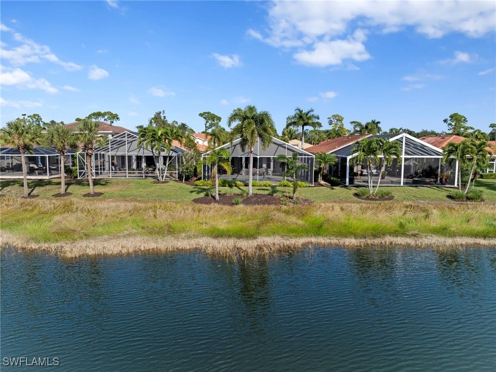 Experience refined Southwest Florida living at 9127 Astonia Way, a beautifully maintained Toll Brothers San Rio model, offering one of the most impressive lake views in The Reserve at Estero. Positioned on a premium homesite with southern rear exposure, the home captures expansive water views and exceptional natural light throughout the day. Notable upgrades include:impact-resistant windows, a new roof (2021), new A/C (2022), new pool pump (2019), new gas pool heater (2026), and new water heater (2019), offering comfort and peace of mind. Furnishings are negotiable for a potential turnkey purchase. The open-concept floor plan features high ceilings, vaulted living spaces, and seamless indoor-outdoor flow. Warm wood flooring runs throughout, creating a beautiful contrast to the light cabinetry and neutral paint palette. A flex room with French doors offers versatility as a home office or bedroom, while formal dining and additional living areas provide comfortable spaces for everyday living and entertaining. The island kitchen is well-appointed with upgraded cabinetry, granite countertops, tile backsplash, stainless steel appliances, pendant lighting, and a breakfast nook overlooking the lake. The primary suite offers direct lanai access and a well-designed bath with dual walk-in closets, dual vanities, a private water closet, and a fully tiled walk-in shower. The expanded covered lanai—one of the largest outdoor living spaces in The Reserve at Estero—is ideal for entertaining, dining outdoors, or enjoying the peaceful lakefront setting. The home also features natural gas, supporting efficient appliances and pool heating. Ideally located west of I-75 in Flood Zone X, The Reserve at Estero offers guard-gated security, a clubhouse, fitness center, resort-style pool and spa, tennis, pickleball, basketball courts, and an active social calendar—just minutes from Coconut Point, RSW Airport, and Gulf beaches. **Some photos in this listing have been virtually staged to illustrate the potential use and layout of the space. Furnishings and décor shown are for illustrative purposes only and are not included in the sale.**