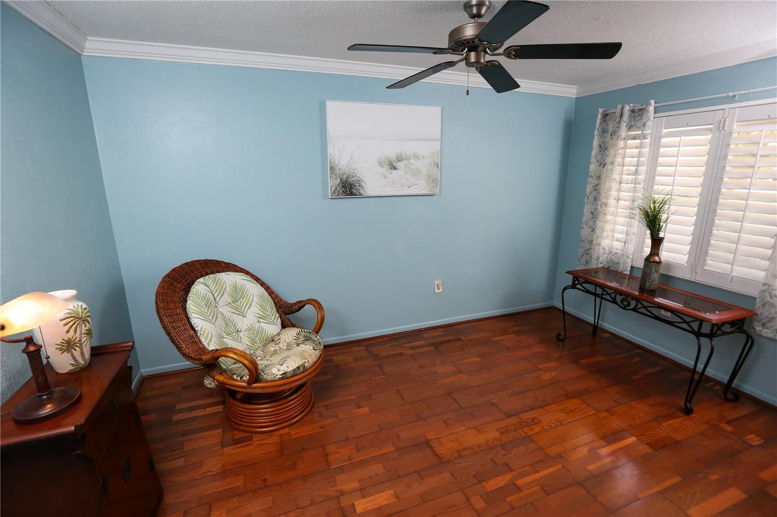 - Ceiling Fan(s), Crown Molding, Living/Dining Room, Main Level Primary, Solid Surface Counters, Solid-Wood Cabinets, Split Bedrooms, Window Treatments