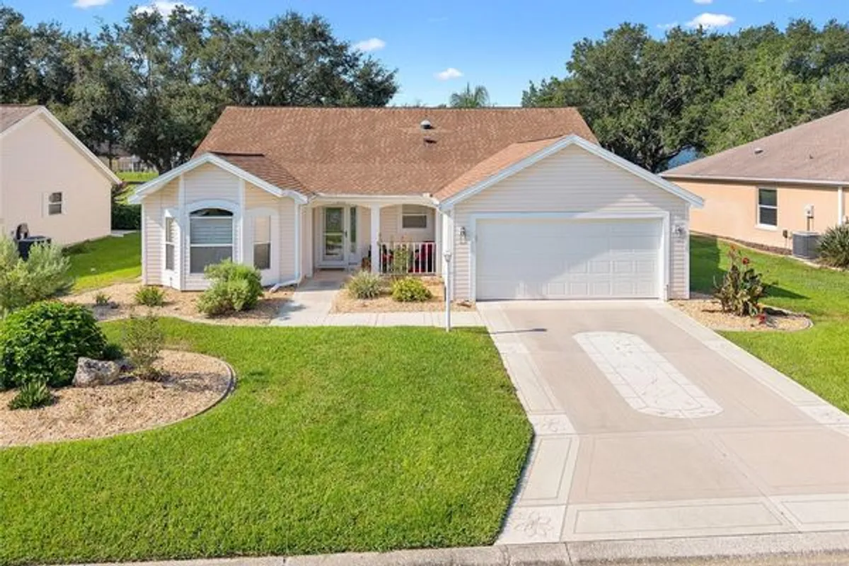 Looking for a home on the GOLF COURSE? SUNRISES, SERENITY and BIRDS AWAIT!NO BOND! Welcome home to this enhanced Cypress (Vera Cruz) model, OVERLOOKING the 8th green of the par 3 on the Hacienda Hills Lakes CHAMPIONSHIP GOLF COURSE. PARTIALLY FURNISHED- NO BOND~ NEW ROOF 2020 ~ NEW HVAC 2022 ~ DEEP GARAGE 24 and 1/2 FEET.... Luxury Vinyl Plank – NO CARPET. NEW garage door and opener, NEW front storm door. Stainless Appliances - PLANTATION SHUTTERS throughout. New whole house water filtration system. Solar tubes keep everything LIGHT and BRIGHT. Soft close cabinets in the kitchen where you'll find 2 additional rows of cabinetry for extra storage. QUARTZ countertops and cabinet pull-outs round out the kitchen upgrades. The primary owner suite has 2 walk-in closets - bathroom has plentiful cabinets, luxurious jetted tub along with a shower and double vanity with plenty of counter space and lots of natural lighting. The den overlooks the golf course with a custom closet organizer. Enter the rear lanai through leaded glass door - covered lanai with volume ceilings and cricket gutters drainage with an open screen area to enjoy the beautiful scenery and occasional good shot. The laundry room is inside and features a crafts table or desk. Outside, you'll find pleasing landscaping with lush green grass, Florida palms and a beautiful view of the golf course. Your new home is in THE VILLAGE of Hacienda South nestled between Spanish Springs and Lake Sumter Landing. The Multimodal path is right behind the home giving you easy access to walking, jogging, bird watching, bike riding and golf cart touring as well as access to town squares and all the recreational offerings. This home is close to medical services, restaurants, and two different squares for shopping, dining and nightly entertainment, all by golf cart. Coming in just under 2000 sq/ft, this home has been meticulously maintained and is ready for you to begin your new adventure in The Villages.