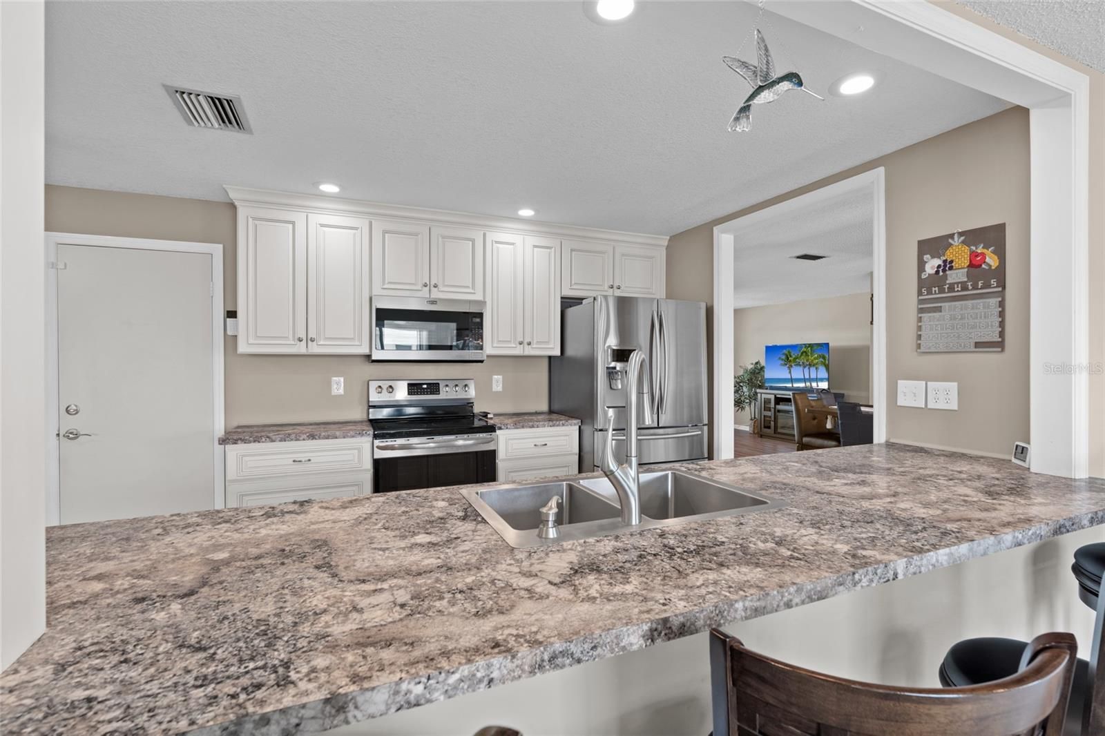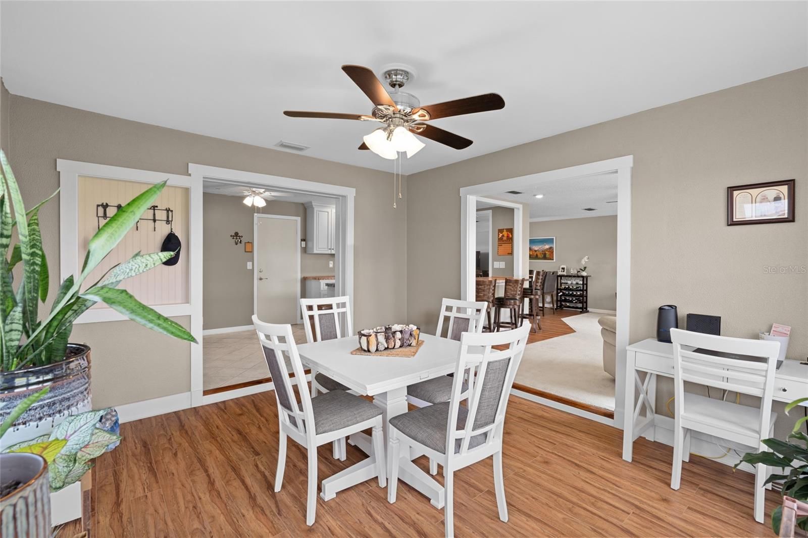 From the moment you arrive, you will fall in love with the charm of this meticulously maintained home. Nestled in the premier active golf community of Mainlands this property is the perfect combination of condo living in a home. When you enter the door you will be greeted with an open and bright floor plan with beautiful plank flooring. The spacious living room is great for reading a book ,catching up on your favorite show or entertaining your family and friends. The updated kitchen will not disappoint and is ready for the chef in the family to cook some great meals. The kitchen boasts many updates like stainless steel appliances, recessed lighting, 2 extra large pantries that are on both sides of a roll out island with even more storage. The pass thru has a larger opening to keep with the open concept and a counter bar for entertaining. Also has a bonus room off the kitchen that can be used for an office, reading nook, dining area and more. Both bathrooms have been recently updated. The primary bedroom has a walk-in closet and en-suite. Other features of this immaculate home are updated windows, hurricane in front and double pane throughout, windows have the fabric hurricane protection, reinforced and insulated garage door, ample storage throughout, 2 car garage HVAC 2018 and more. This active 55+ community has many socials, heated pool, clubhouse, shuffleboard, golf sidewalks and is pet friendly. Located near shopping, dining, medical facilities and the beautiful Gulf beaches. Are you ready for maintenance free living the Florida way. Do not miss out on owning your own little piece of paradise.