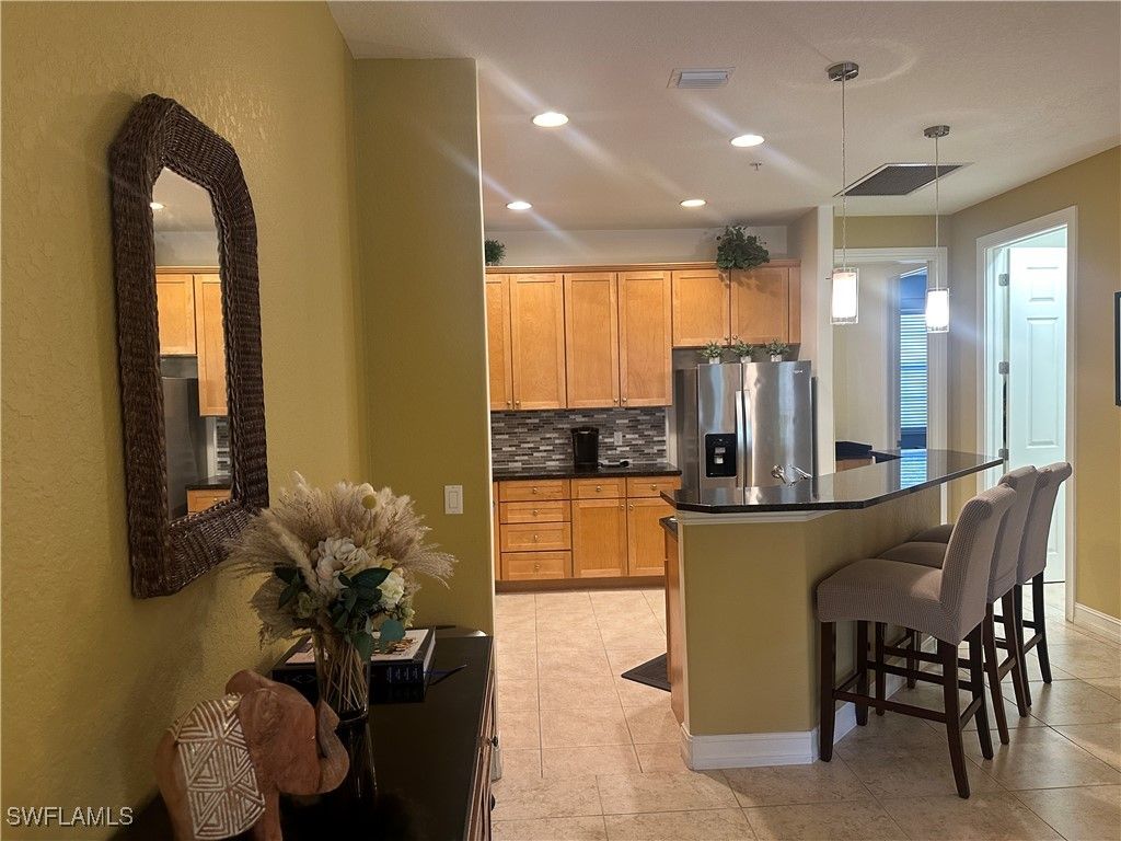 REDUCED & PRICED TO SELL NOW! BEST VALUE IN OLE W/ OVER 1770 SF LIVING SPACE W/ 3 SPACIOUS BEDROOMS & HUGE OPEN LIVING SPACE! BRAND NEW A/C! Balcony overlooks beautiful tropical green space w/ song birds, beautiful foliage, palm trees & bunnies in the grass. THIS UNIT IS A KEEPER! All living space is on the second floor from the vestibule entry (lower level) which has storage under the staircase and hallway leading to the 2-car attached garage + EXTRA STORAGE SHELVING. Garage has keyless entry. Upgrades in this unit include BRAND NEW LUXE CORETEC durable flooring in main living spaces & primary ensuite that is easy to walk on and comfortable in bare feet, as opposed to the hard tile with grout that requires constant cleaning. GRANITE COUNTERS in kitchen complete with a raised BAR SEATING AREA is handy! BRAND NEW CUSTOM GLASS-TILE BACKSPLASH in kitchen, There is also a computer hutch/desk area between the two guest bedrooms which comes in handy if you need to access movie times, locations of great restaurants, print out your boarding passes if you are traveling on vacation, etc. The unit boasts WELL-BUILT IMPACT RESISTANT FRENCH DOORS & WINDOWS, newer FANS and LIGHTING, NEW custom SHOWER DOOR in the guest bathroom. Start LIVING THE OLE LIFESTYLE W/ BEAUTIFUL PUBLIC GOLF COURSES, MOVIE THEATRE, GYM, and RESTAURANTS! This particular Ole Unit is located VERY CLOSE to all the shops and restaurants in "RESTAURANT ROW" with all your favorites like Starbucks, Chipotle, Texas Roadhouse, Jersey Mike's Cheesesteaks, Carrabba's, Outback Steakhouse, Brooke's Burgers, Pollo Tropicale, Five Guys, Palumbo's Pizza, Publix, Fresh Market, Hoot's, Burger Fi, and many other new restaurants and shops including new shops at the intersection that includes PetSmart, ULTA makeup, Marshall's, Wendy's, Walmart, ALDI supermarket and many more! No need to walk miles to get to all of these great restaurants. 5-10 minute walk just to get to the primary restaurants that everyone loves! This particular unit is almost a "stone's throw away from the Community Pool, Movie Theatre, Restaurant near the elaborate community swimming pool and exercise area! Conveniently located just 10 miles to 5th Avenue S. in Olde Naples, and several miles to Marco Island's two public beaches that have sugar soft white sand. Amazing shelling on Tigertail Beach. Catch a ride on the Key West Express boat and explore the local area. Take a guided kayak tour or a boating cruise just south near Isles of Capri. You'll find more restaurants on the water, and definitely it's worth the trip to Marco Island, to reminisce about the Snook Inn that has been renovated and open to the public. The family has loved this unit very much and loved all the amenities that Ole offered. Location was perfect and a straight shot to either Marco Island or downtown 5th Avenue in Naples. There is so much to do on Marco Island and South Naples, that you will probably beg your family to extend their vacation!