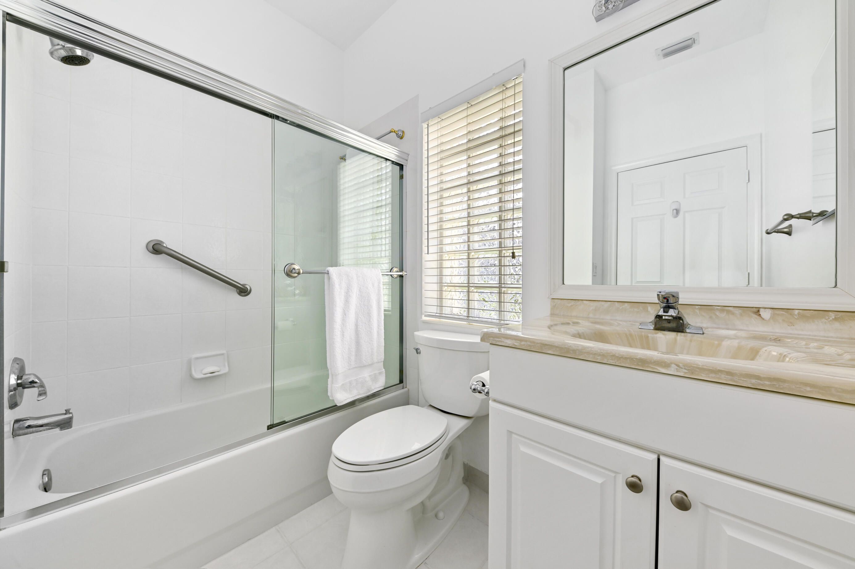 Beautifully UPDATED Move in Ready, One Story, Single Family Home. EXTERIOR NEWLY PAINTED. Just under 1700 all tiled square feet in this pristine, Split plan 2 Bedroom PLUS Large Den, 2 bath, 2+ car garage home. Open floor plan with modern knockdown textured ceilings throughout. Large spectacular eat in kitchen with white quartz countertops, marble backsplash, stainless steel appliances and pull out storage. Huge primary bedroom with walk in closet. Spacious en-suite custom designed remodeled bathroom has frameless glass shower, soaking tub, dual sinks, quartz countertop and separate toilet. Private backyard with mature trees and screened lanai. Hurricane impact sliding doors/windows and convenient accordion shutters. Main living area features high ceilings and plantation shutters allowing lots of natural bright light. Separate laundry room. Coordinating brushed nickel finishes, lighting, accents and ceiling fans throughout. Driveway, walkways, front and back screened porches all have brick pavers. Oversize garage has speckled epoxy finish floor, insulated attic with storage and utility sink. Landscaped exterior includes poured concrete edging and drainage gutters. Tree lined streets, sidewalks, underground utilities, streetlights. The resort style clubhouse has 3 pools (walking resistance, adult and family), lighted tennis and pickleball courts, fitness center and just about every luxury amenity imaginable. In addition to the clubhouse, the HOA covers 24/7 manned security gate, high speed internet, premium cable channels, ADT alarm, land line telephone, reserve funds, landscape maintenance and much more. Baywinds 55+ Community is perfectly located, meticulously maintained, superbly managed and has a quality reputation within Palm Beach County.