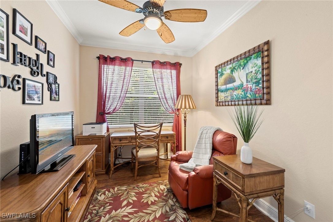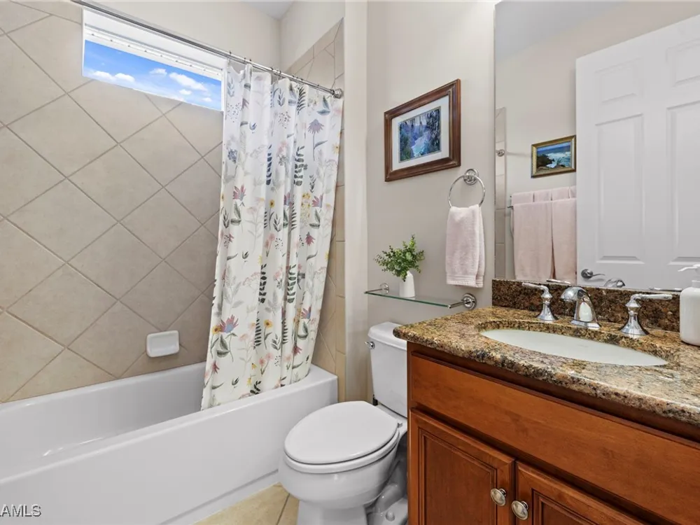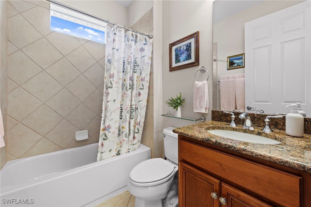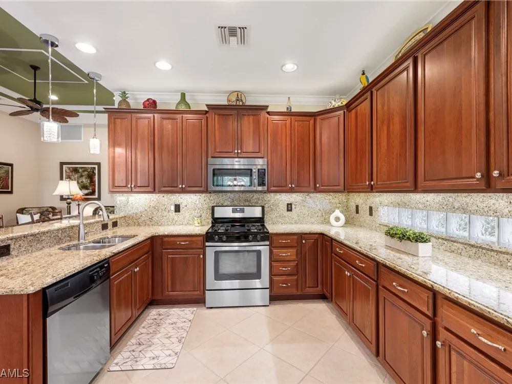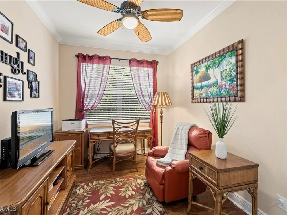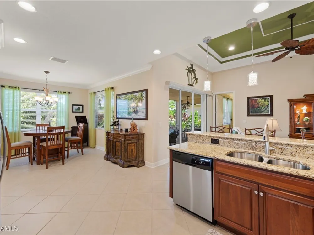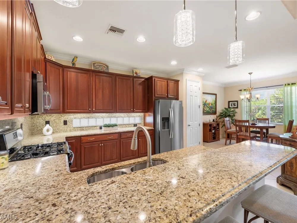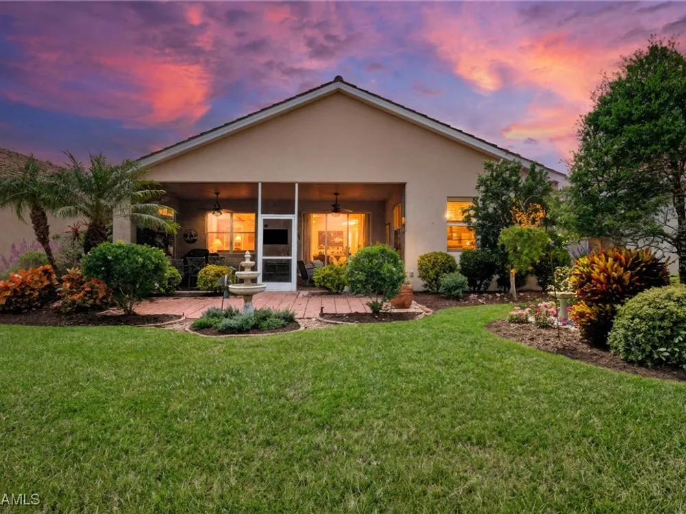 Situated in the desirable Reserve at Estero, this 3-bedroom plus den, 2-bath Dolce Model offers a perfect blend of comfort and style. Surrounded by beautifully manicured landscaping, the residence makes a lasting first impression. At the heart of the home, the large open kitchen features granite countertops, a breakfast bar, and a spacious pantry—ideal for both everyday living and entertaining. Tile flooring flows through the main living areas, creating a light and airy feel, while hardwood floors add warmth and character to the bedrooms and den. The versatile den provides the perfect space for a home office, library, or media room. Highlights include volume ceilings in the great room, an oversized dining area off the kitchen, and an extended 2-car garage for added storage or workspace. Step outside to a private lanai framed by lush greenery—a tranquil retreat for morning coffee or evening gatherings. The Reserve at Estero is a gated, natural gas community offering resort-style amenities including a clubhouse, fitness center, pool and spa, tennis, and pickleball—all just minutes from shopping, dining, and Southwest Florida’s beaches.