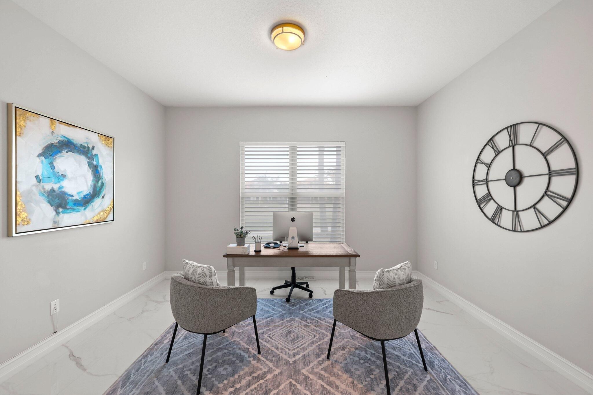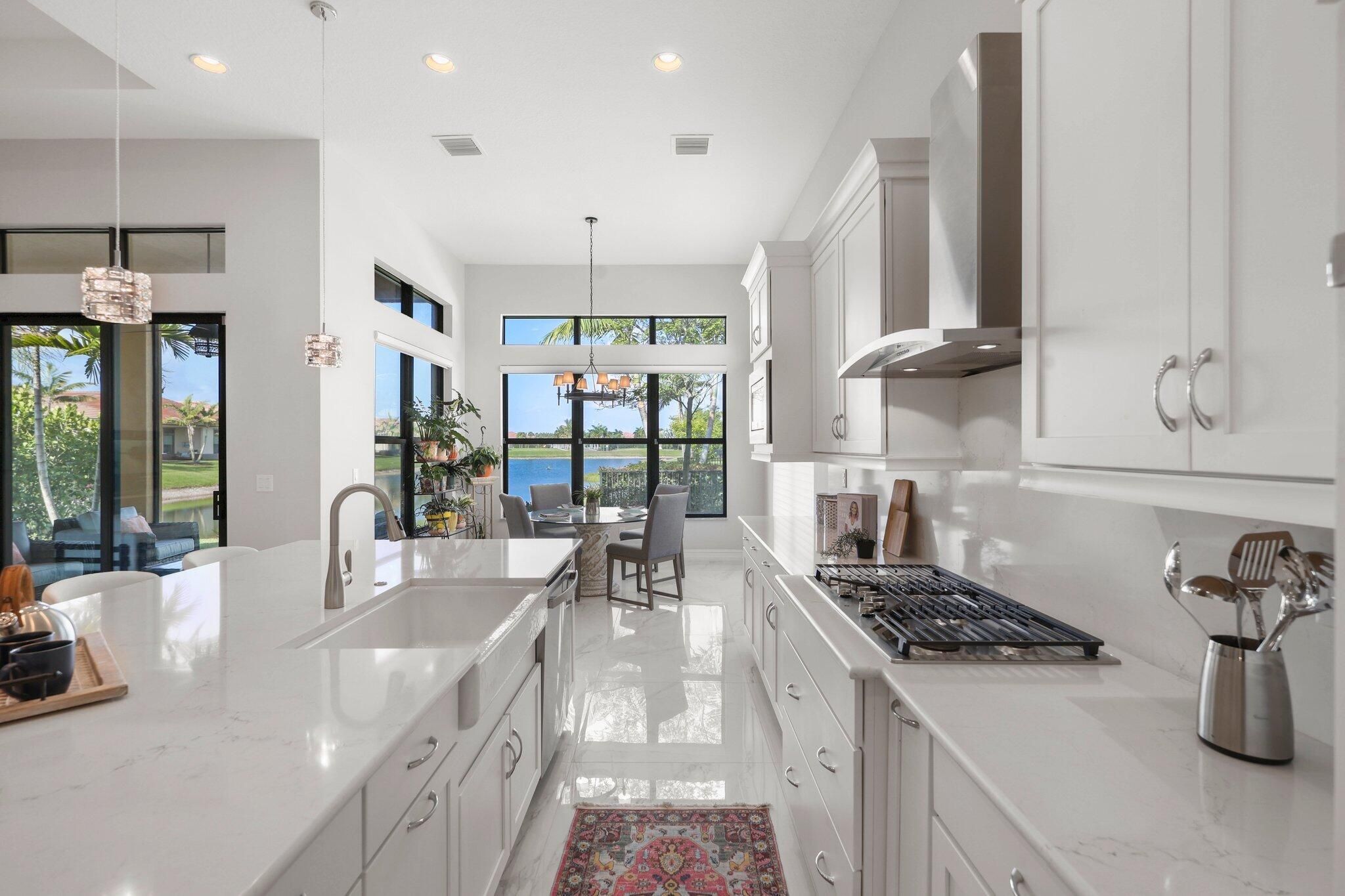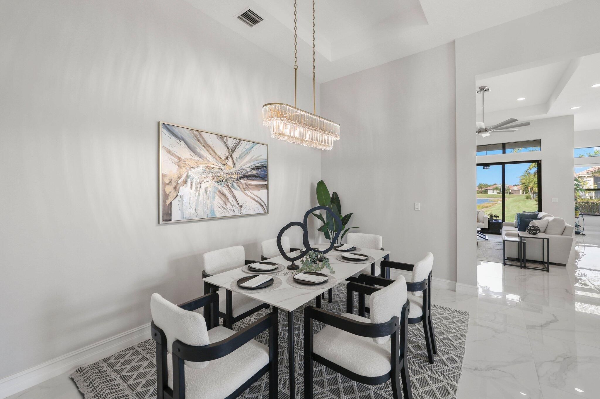 Welcome to 9149 Leon Circle East in Four Seasons at Parkland, where modern elegance meets serene waterfront living. This beautifully designed home offers 2 bedrooms, an Office / Den, 3 bathrooms, and 2,607 square feet of open-concept living space. Enjoy stunning long-range water views, complemented by sleek 36-inch white and gray marble-look porcelain flooring throughout. The light-filled breakfast area and gourmet kitchen create the perfect setting for both everyday living and entertaining. Situated on a private end lot with lush green space, the screened-in lanai provides a peaceful retreat overlooking the water and charming fountain. Located on a 6,124-square-foot lot, this home offers the ideal blend of comfort, style, and privacy.