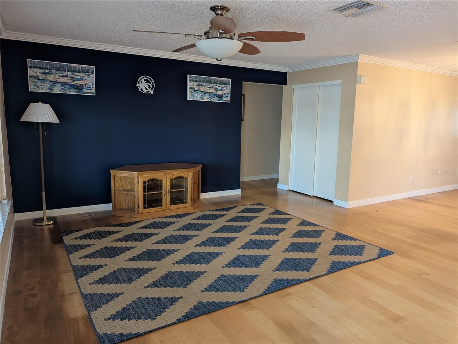 - Built-in Features, Ceiling Fan(s), Crown Molding, Living/Dining Room, Open Floorplan, Main Level Primary, Solid-Wood Cabinets, Stone Counters, Thermostat, Walk-In Closet(s), Window Treatments