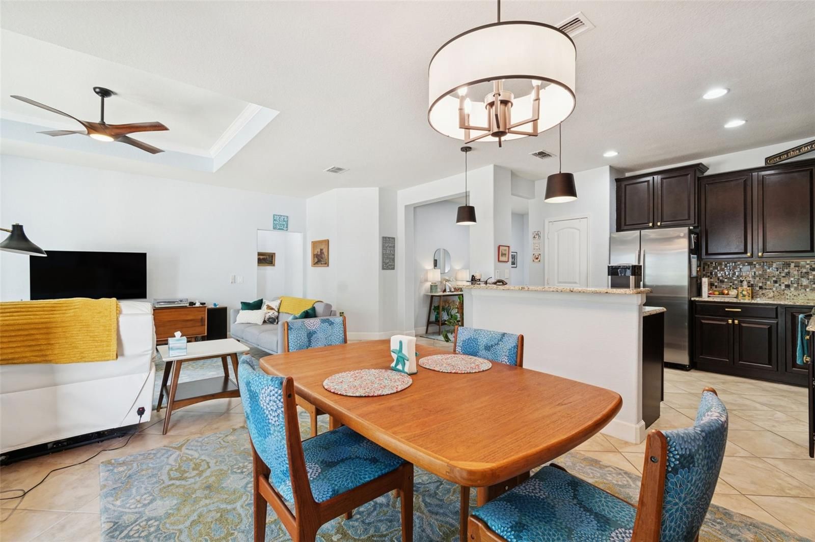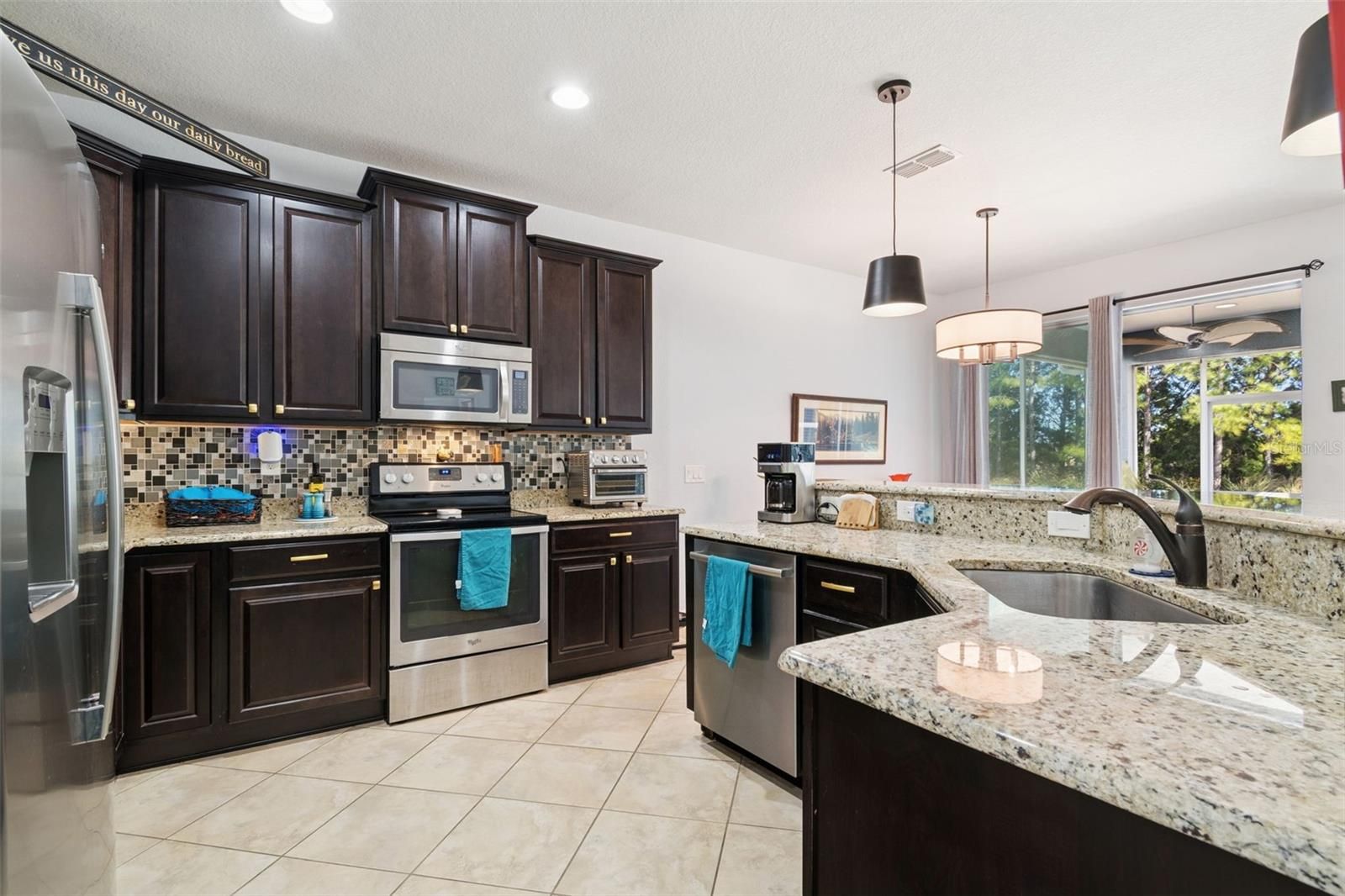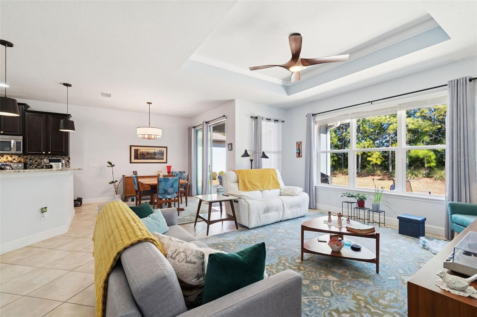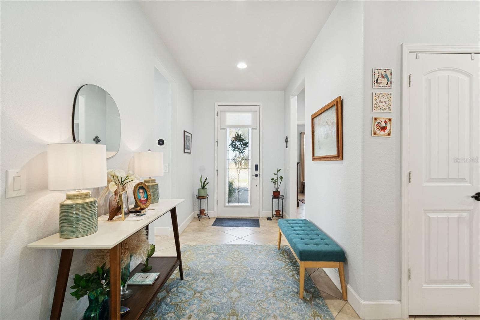 Welcome to this well-maintained 2-bedroom, 2-bath home plus a flex room offering over 1,600 square feet of thoughtfully designed living space in the desirable 55+ guard-gated Stone Creek community. This home features tile flooring throughout, a welcoming entry with a coat closet, and a dedicated laundry room with washer and dryer included. The fully equipped kitchen includes all appliances and flows seamlessly into the main living areas, making it ideal for everyday living and entertaining. The spacious primary suite offers a walk-in closet, dual sinks, and a walk-in shower. Feature a privacy lot, nicely landscaped yard with both a screened front entry and a covered, screened-in back lanai complete with a ceiling fan—perfect for year-round relaxation. Additional highlights include rain gutters, upgraded garage lighting, an extra-long two-car garage, interior paint completed in 2022, and a new HVAC system installed in 2022. Stone Creek offers resort-style living with 24-hour guarded security, pickleball and tennis courts, a clubhouse, fitness center, and pool