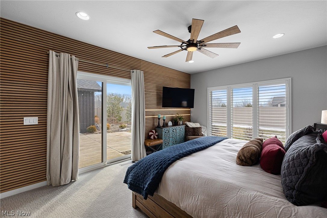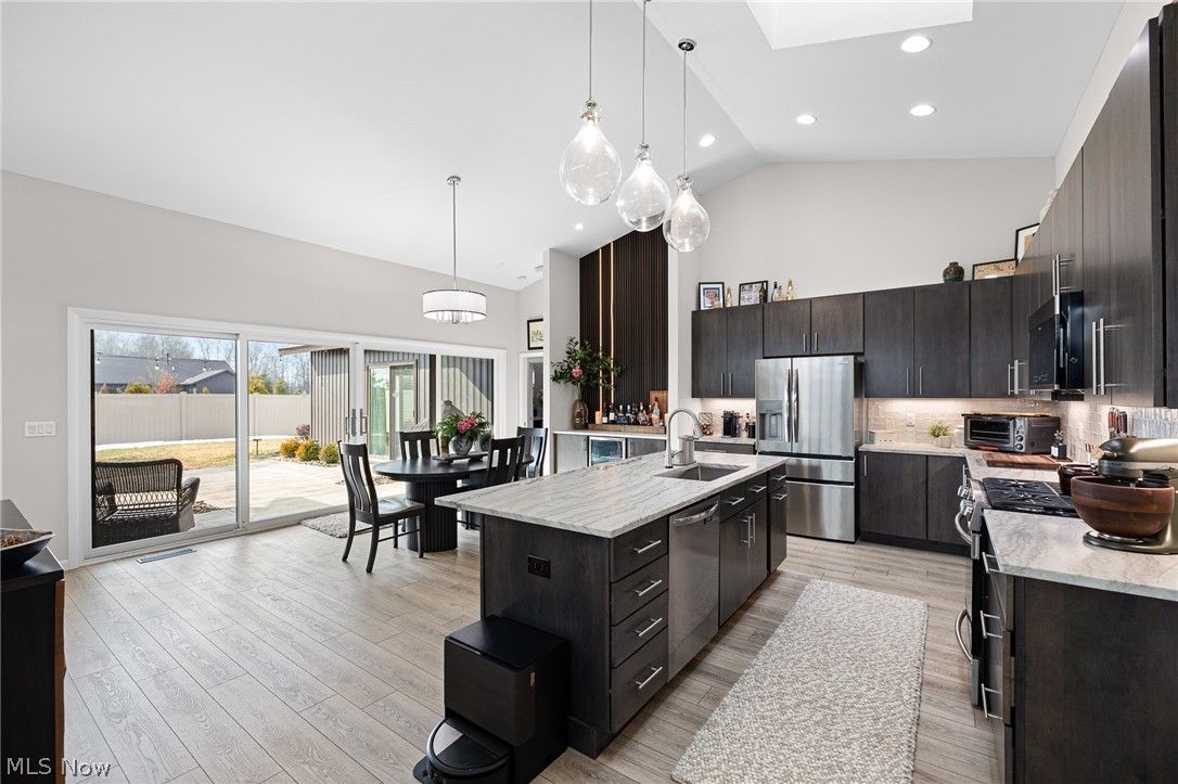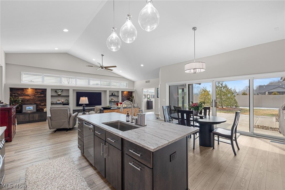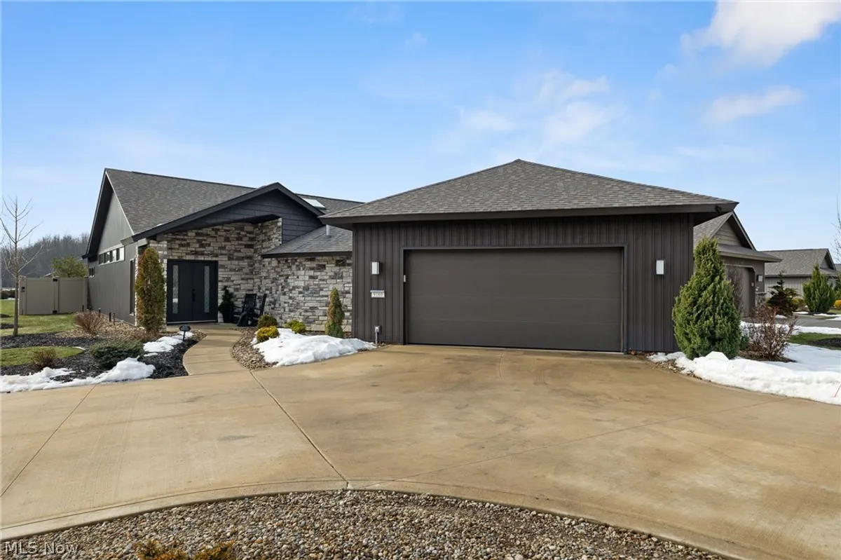 Welcome to refined ranch living in the highly sought-after Ridgefield community of North Ridgeville. Built by Bob Schmitt Homes and meticulously maintained, this residence offers a rare opportunity to own one of the newest homes in the neighborhood now that the builder is no longer constructing here. Designed with both comfort and elegance in mind, the open floor plan showcases soaring cathedral ceilings spanning the great room, kitchen, dining area, and entry, creating a bright and spacious atmosphere. The kitchen serves as the heart of the home, featuring a large center island, upgraded cabinetry, solid surface countertops, stylish backsplash, wine refrigerator, walk-in pantry, and skylight—perfect for everyday living and entertaining. Thoughtful updates include new light fixtures and ceiling fans, custom plantation shutters, and wood accent enhancements to the entertainment center. The primary suite offers a private retreat with a spacious walk-in closet, beautifully tiled glass shower, and professionally installed noise-canceling accent wall for added comfort. Outdoor living is equally inviting with covered front and rear patios, the rear enhanced by skylights and a newly added private fence for added seclusion. The garage stands out with a 10-foot ceiling, finished flooring, hot and cold water, floor drain, overhead storage access, and service door to a second patio. Additional highlights include a sprinkler system, tankless water heater, and oversized turnaround driveway. The cluster home maintenance fee covers landscaping and snow removal for low-maintenance living. Residents enjoy access to a clubhouse, fitness center, Olympic-size pool, and children’s pool, all conveniently located near shopping, dining, parks, and major routes. This move-in-ready home delivers the quality, upgrades, and feel of new construction without the wait.