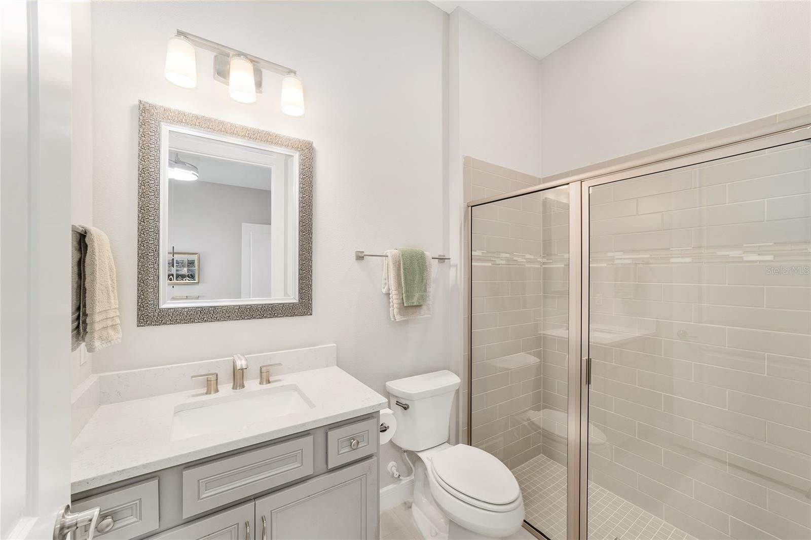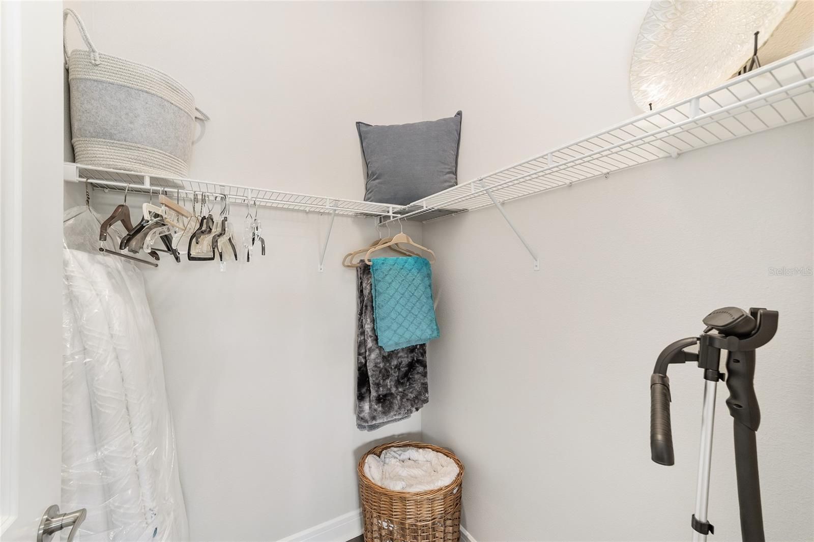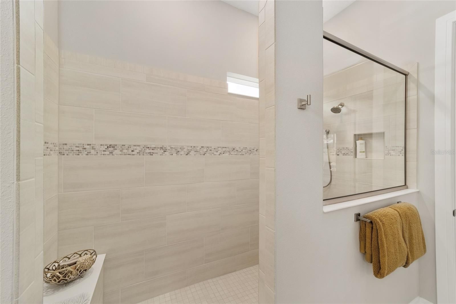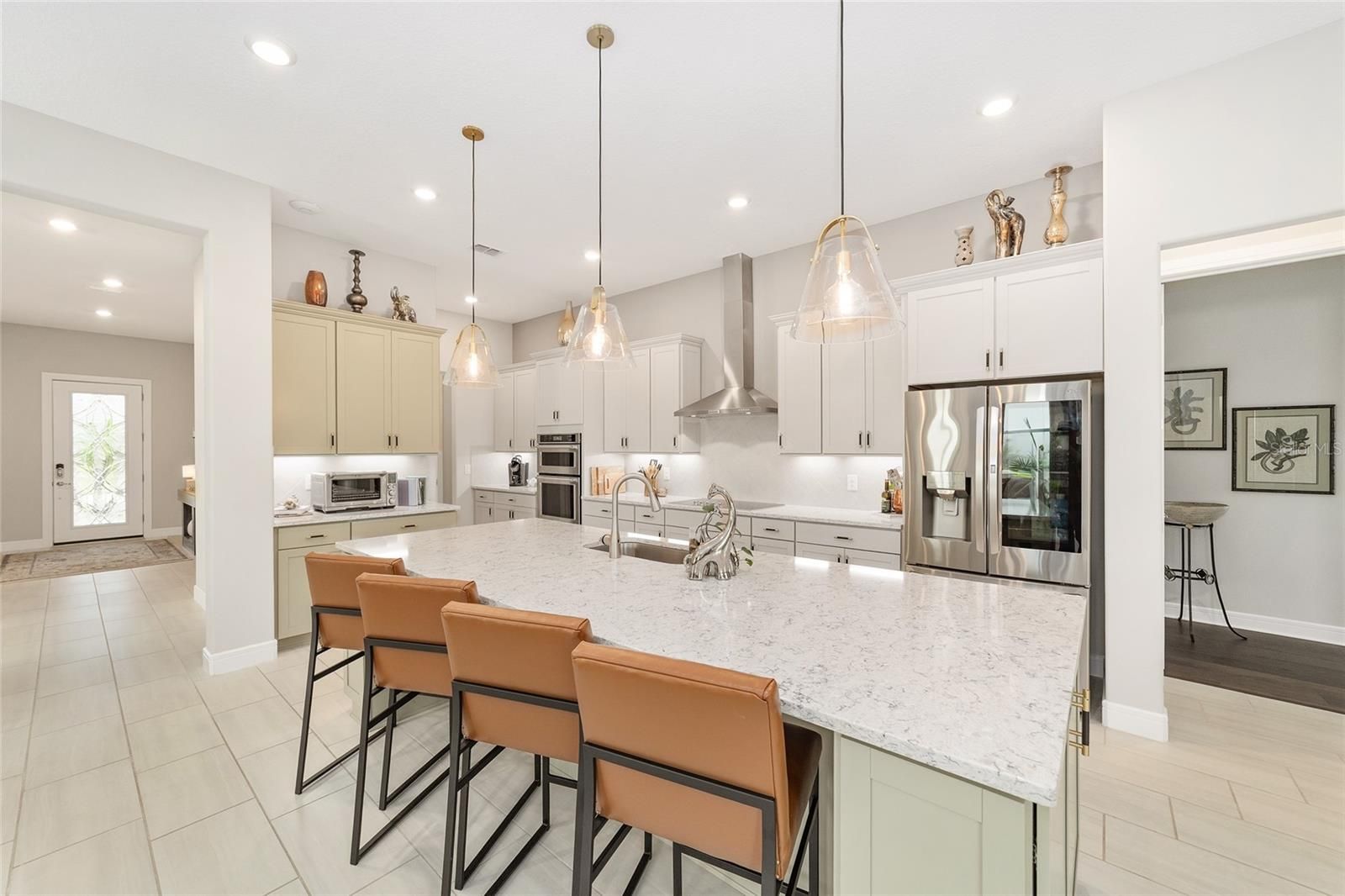 Welcome to a meticulously crafted Renown model home, offering a balance of luxury, comfort and efficiency in the sought-after, 55-plus community of Del Webb Stone Creek. This three-bedroom, 3.5-bath residence, spanning 2,808 square feet of living space, is a showcase of modern living and thoughtful design. From the moment you enter, a striking paver driveway and Florida-friendly low-maintenance landscaping sets the tone for the elegance that awaits. Go inside and discover a home designed for effortless living. The open-concept layout features a grand gathering room with a tray ceiling and crown molding. Offset floor tile flows seamlessly through the main living areas and baths. The enclosed flex/den space offers the versatility to be a home office or cozy reading nook. Sophisticated touches throughout the home include rounded drywall corners, a custom stone built-in fireplace/entertainment wall, and custom window treatments. The heart of the home is the kitchen, which features upgraded quartz countertops, a built-in KitchenAid cooktop/oven and convection microwave, touchless kitchen faucet, and a counter-depth LG ThinQ French Door refrigerator, creating a space that is beautiful and highly functional. The luxurious owner's suite is a retreat boasting custom-built closets in the bedroom. Go in the bath into a spacious Roman walk-in shower with dual handheld showerheads and stunning granite countertops. Outdoor living is enhanced by an extended screened-in lanai complete with a privacy wall and mounted TV, offering a serene space to sip your morning coffee or enjoy the sunrise and nature. The home's design allows for a unique pass-through laundry room from the garage to the auxiliary closet and primary bath, offering an incredibly practical feature for an active lifestyle. The garage includes a custom built-in storage system. Del Webb Stone Creek is more than a community, it’s an experience. Enjoy a wide array of amenities, including a championship golf course, a multipurpose path for walking and biking, and a relaxing and inviting atmosphere. Whether you’re booking your calendar full of activities or snuggling in with a good book, this home and community have everything you're looking for.