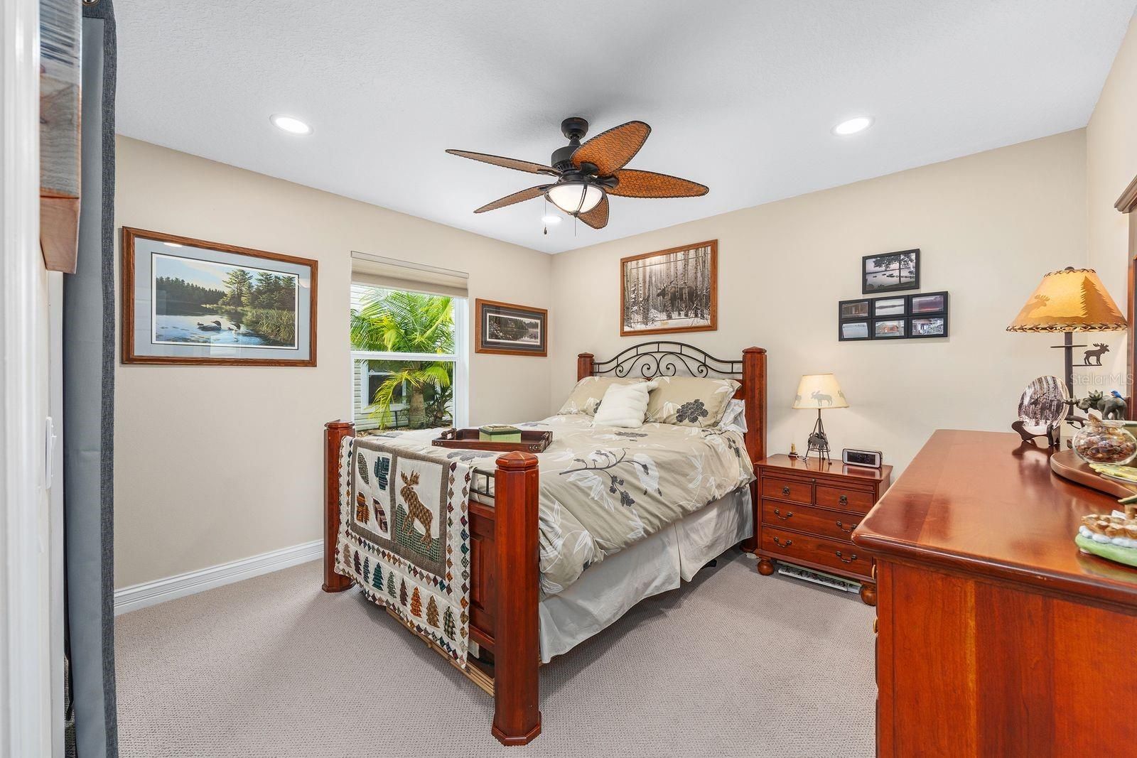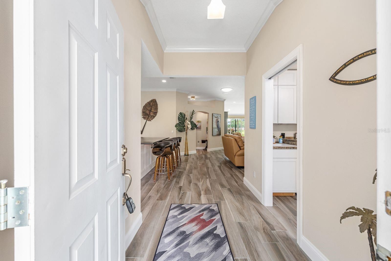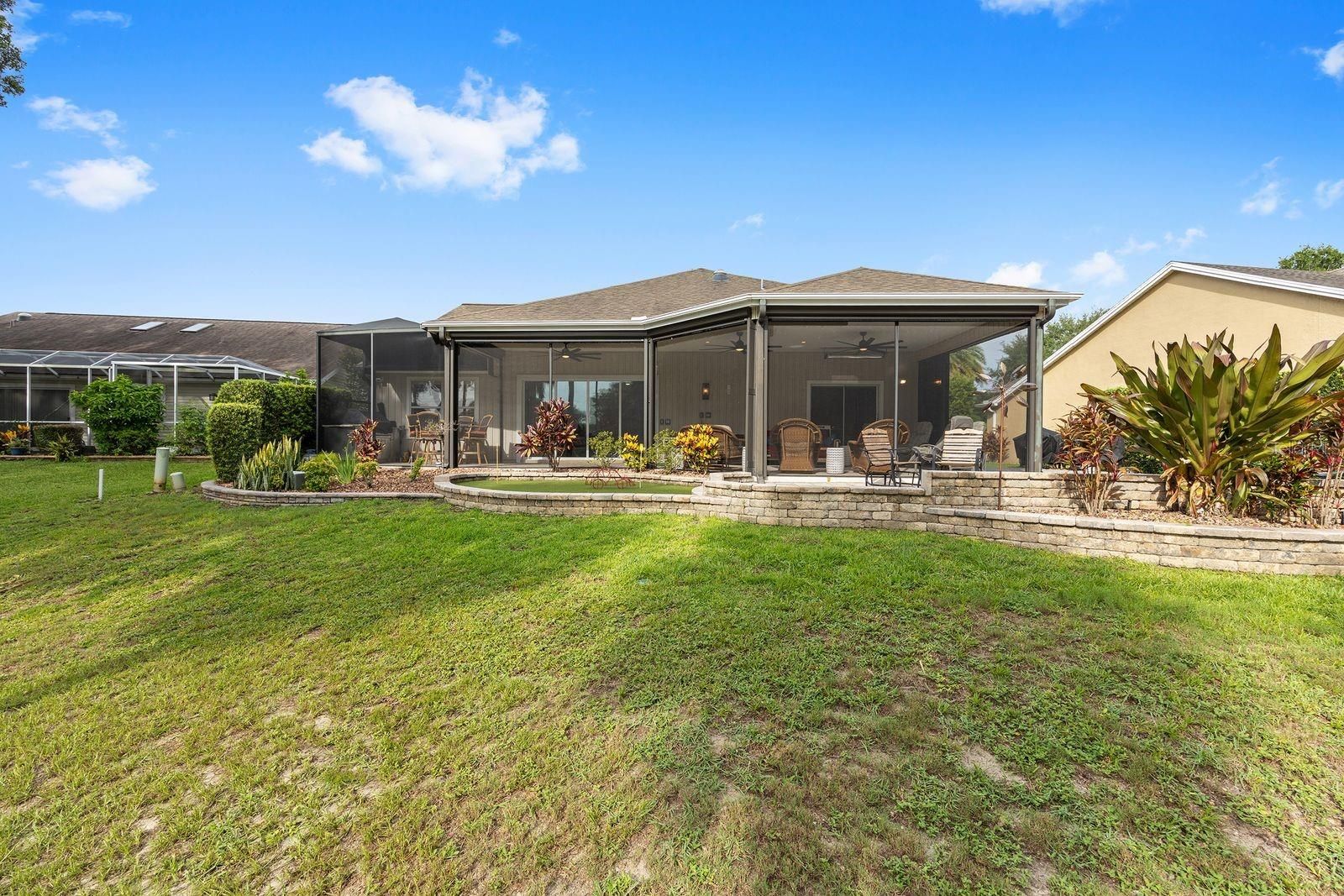 Beautifully Remodeled and Redesigned golf front home with superb updates and upgrades throughout the interior and exterior. This is not a cookie-cutter home. Dare to be different! This is the fabulous home you have been waiting for. From the curb you see the mature landscaping and the expansive paver driveway and walkway to the front door. Don't miss looking inside this home. Your eyes are immediately drawn to the beautiful and serene golf course view of the full #7 fairway of the Hacienda Lakes Course through the extra height 4 panel stacking sliding glass door. A view you can't resist! Progressing past the entryway, you are greeted by the spacious living room with dry bar hosting 2-drawer refrigerator, pull-out shelves in the cabinets, storage for all your glasses and beverage accessories. To the left is recently redesigned and remodeled eat-in kitchen with all Pull out drawers and soft close doors as well as LED lighted cabinets. An incredible kitchen island, top-tier appliances including Electrolux Icon 32' Freezer and 32” Refrigerator w/custom double vent, GE Monogram Cafe' doors convection oven and GE Monogram induction cooktop with Wolf power ventilator/light. The kitchen island countertop is custom powder coated metal from Arkansas and hosts an abundance of storage with pull out drawers. There is a separate coffee bar with water hook-up for your convenience. Entering the Primary bedroom enjoy 10 ft high closet storage with double hanging and additional shelves for storage. The Primary bathroom has double sinks with storage tower between them. Custom large glass enclosure shower. Enjoy the privacy of a split floor plan with the guest bedrooms across the living room. Guest bedroom 1 has a closet. Guest bedroom 2 has a space for a closet or could be converted into a large work space w plantation shutters. The oversized interior laundry room has plenty of space for storage and large laundry sink. The garage is an extra deep 2 car garage with an additional 3rd stall golf cart garage/shop space. Want outdoor living? How about outdoor living with Twin Eagles ceiling mounted electric radiant heaters for the cool nights, additional power sunscreens over the entire lanai. Visitors will enjoy the putting green and outdoor patio space or just relaxing with their favorite beverage while watching the golfers on the green. Stunning sunrise view with a variety of pine, palm, and oak trees. Close proximity to the multi modal path available on the other side of the golf course. Click on the virtual tour link for a walk through look.
