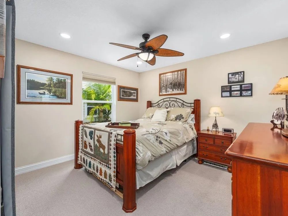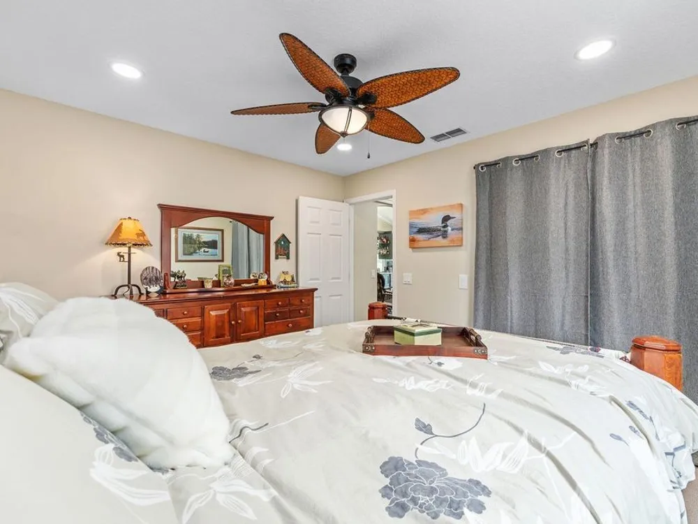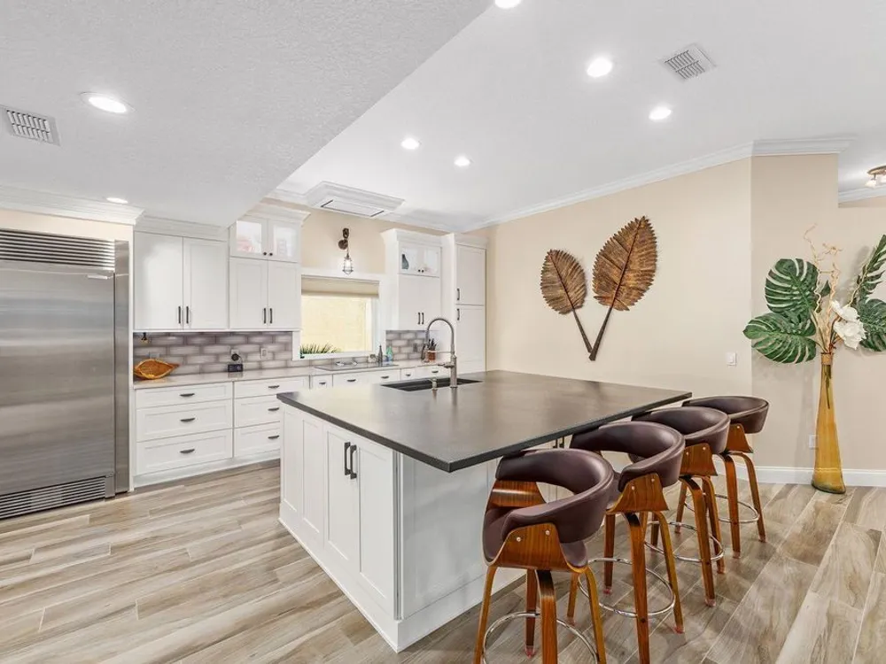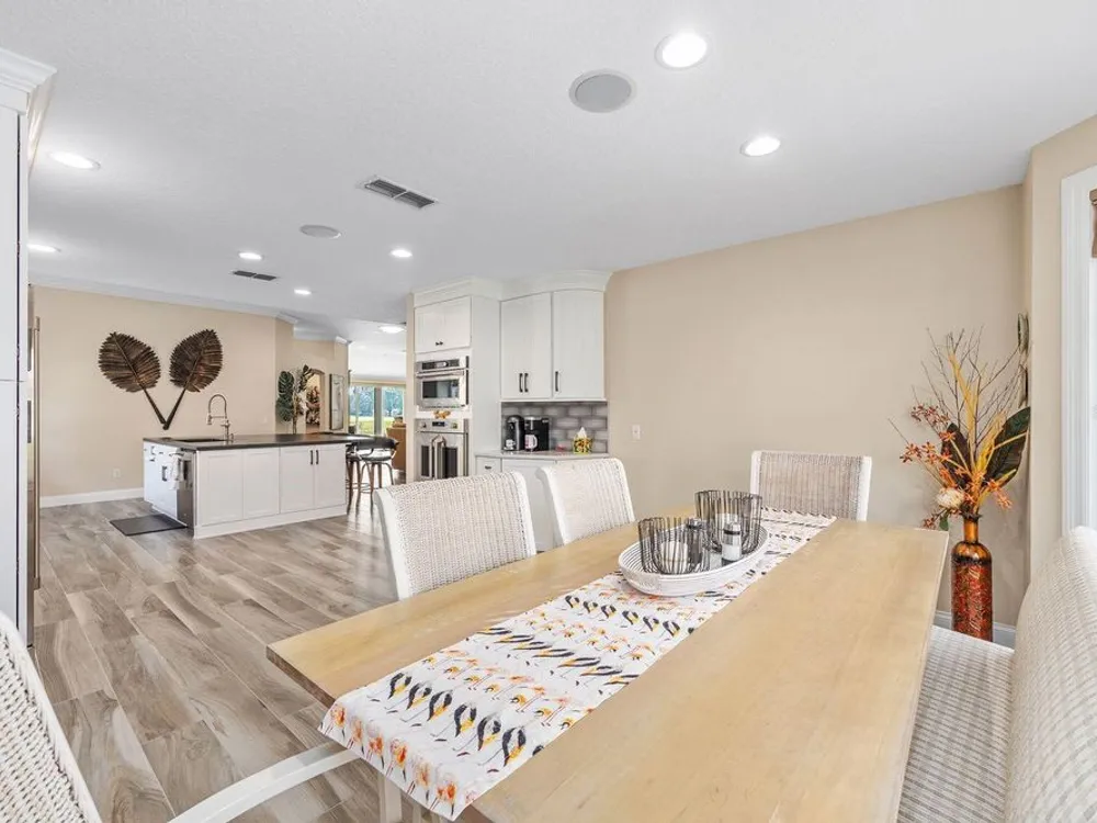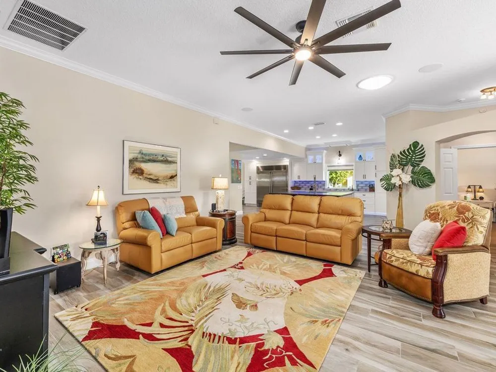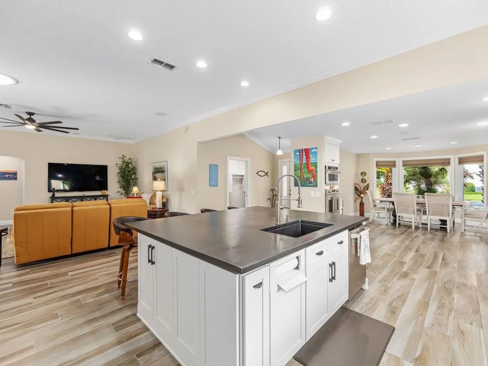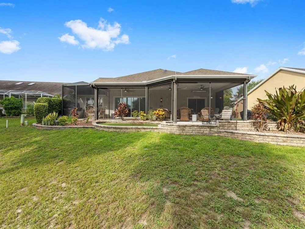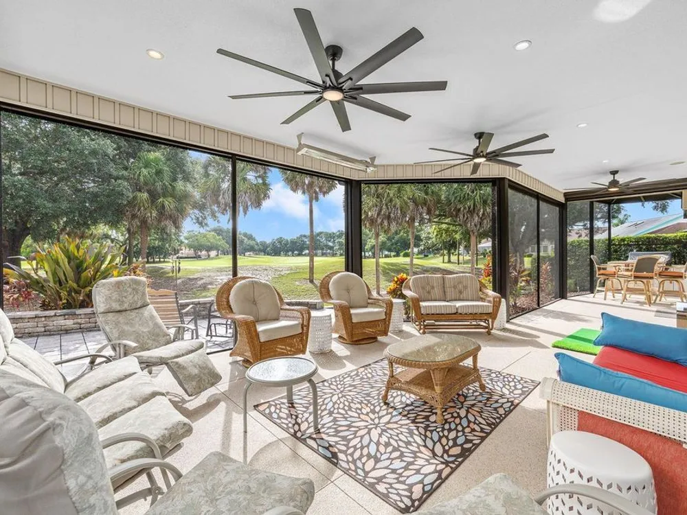 Beautifully Remodeled and Redesigned golf front home with superb updates and upgrades throughout the interior and exterior. This is not a cookie-cutter home. Dare to be different! Room for a pool. This is the dream home you have been waiting for. From the curb you see the mature landscaping and the expansive paver driveway and walkway to the front door. Don't miss looking inside this home. Your eyes are immediately drawn to the beautiful and serene golf course view of the full #7 fairway of the Hacienda Lakes Course through the extra height 4 panel stacking sliding glass door. A view you can't resist! Progressing past the entryway, you are greeted by the spacious living room with dry bar hosting 2-drawer refrigerator, pull-out shelves in the cabinets, storage for all your glasses and beverage accessories. To the left is recently redesigned and remodeled eat-in kitchen with all Pull out drawers and soft close doors as well as LED lighted cabinets. An incredible kitchen island, top-tier appliances including Electrolux Icon 32' Freezer and 32” Refrigerator w/custom double vent, GE Monogram Cafe' doors convection oven and GE Monogram induction cooktop with Wolf power ventilator/light. The kitchen island countertop is custom powder coated metal from Arkansas and hosts an abundance of storage with pull out drawers. There is a separate coffee bar with water hook-up for your convenience. Entering the Primary bedroom enjoy 10 ft high closet storage with double hanging and additional shelves for storage. The Primary bathroom has double sinks with storage tower between them. Custom large glass enclosure shower. Enjoy the privacy of a split floor plan with the guest bedrooms across the living room. Guest bedroom 1 has a closet. Guest bedroom 2 has a space for a closet or could be converted into a large work space w plantation shutters. The oversized interior laundry room has plenty of space for storage and large laundry sink. The garage is an extra deep 2 car garage with an additional 3rd stall golf cart garage/shop space. Want outdoor living? How about outdoor living with Twin Eagles grilling station and soft close stainless steel cabinets, Twin Eagles ceiling mounted electric radiant heaters for the cool nights, additional power sunscreens over the entire lanai. Visitors will enjoy the putting green and outdoor patio space or just relaxing with their favorite beverage while watching the golfers on the green. Stunning sunrise view with a variety of pine, palm, and oak trees. Close proximity to the multi modal path available on the other side of the golf course. Click on the virtual tour link for a walk through look.