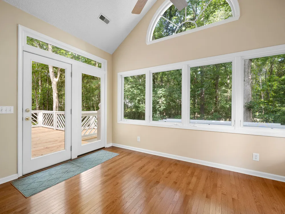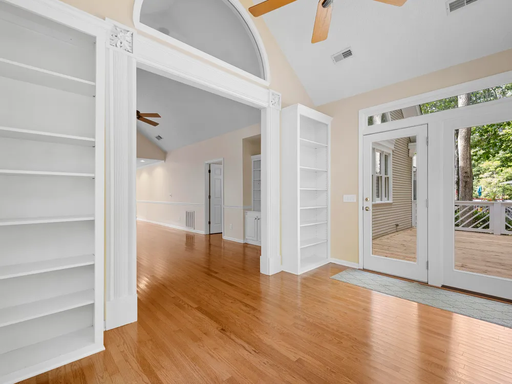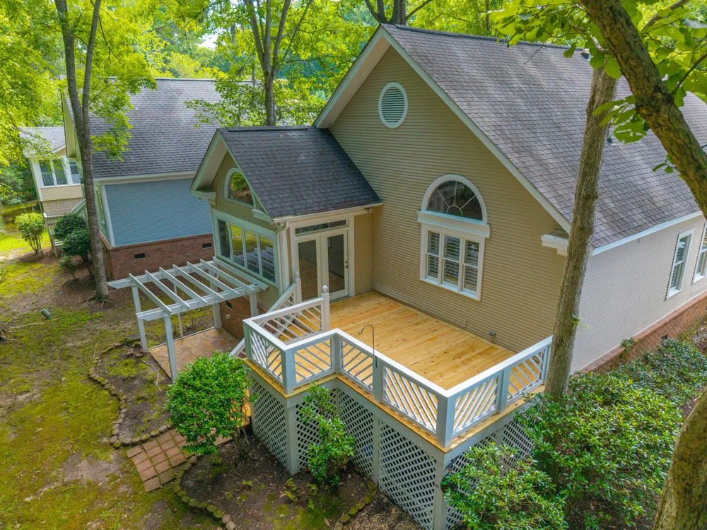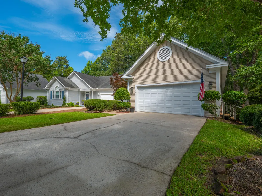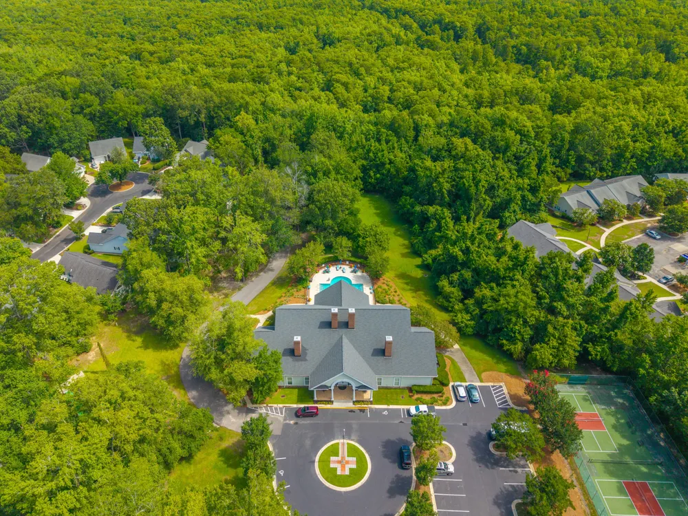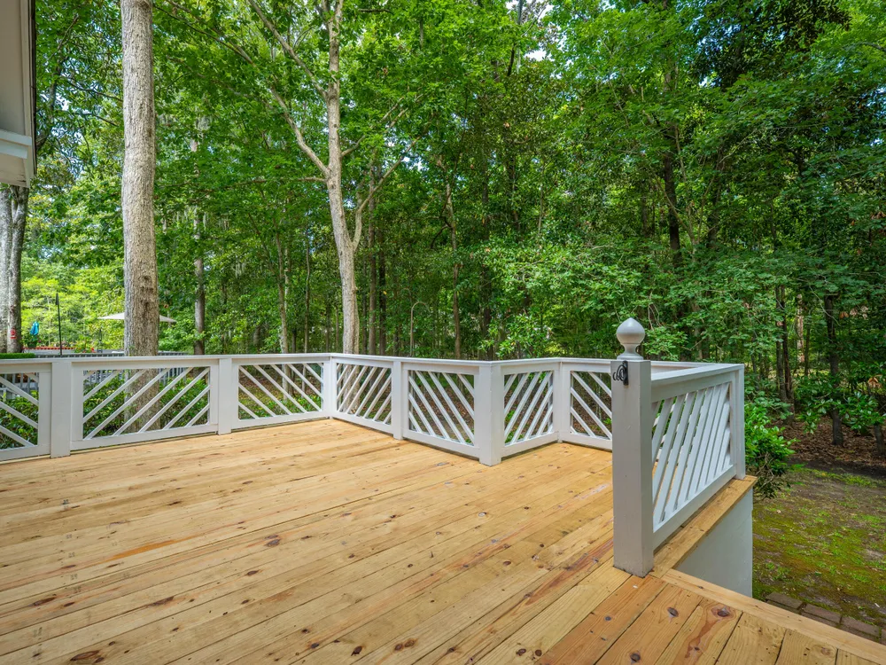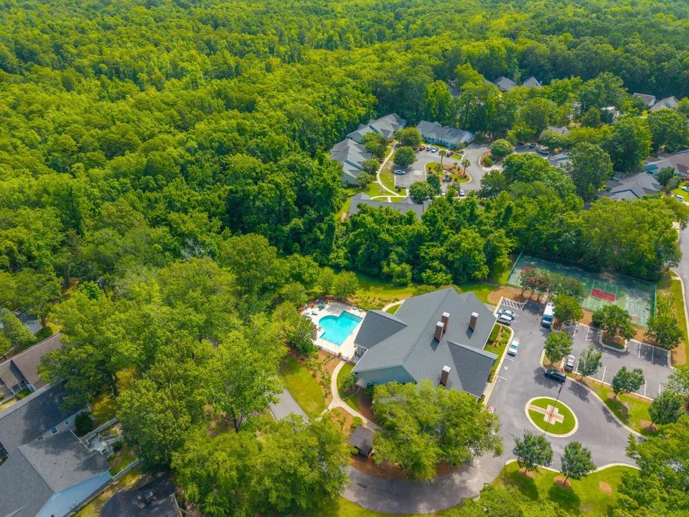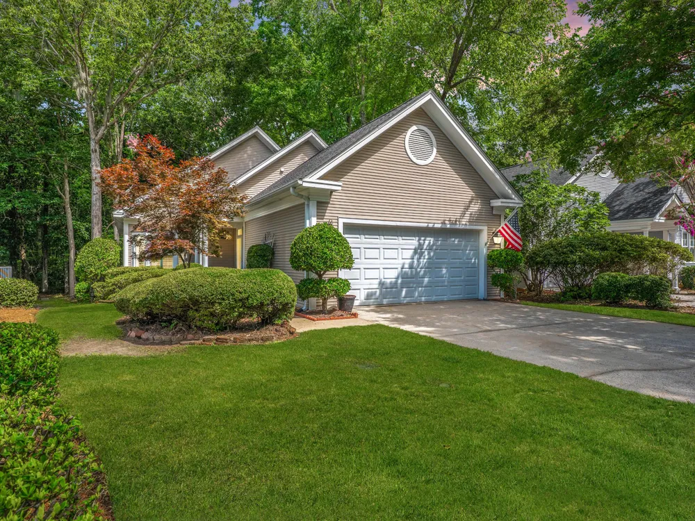 This beautiful, move-in-ready property is located in the popular gated retirement community The Elms of Charleston. Nestled on a quiet cul-de-sac, the home has been lovingly cared for and features a spacious, open floor plan welcoming in the outdoors with large windows overlooking a private wooded lot. Master bedroom features an en-suite bath and dressing area with large walk-in closet, roomy vanity and a low-threshold step-in shower. Spacious guest room adjoins a full bath with tub/shower combo. Custom built-in cabinetry in the office, den and sunroom along with gleaming wood floors and custom plantation shutters throughout. Large two-car garage with workbench and utility sink. Two rear outdoor spaces include a bluestone patio with pergola and a newly renovated, spacious deck both ofoverlook peaceful, private, wooded surroundings. Convenient to hospital, doctors' offices, restaurants and shopping. I-26 is less than 5 minutes away providing easy access in and out of the Charleston area and to Charleston International Airport. Relax and enjoy the amenities offered by The Elms, including weekly landscape service, a beautiful clubhouse with grand ballroom, catering kitchen, game room, library, gym, swimming pool, and tennis/pickleball courts. A community bus and scheduled events offer ongoing social activities in the neighborhood and across the Lowcountry. Property is vacant and easy to show.