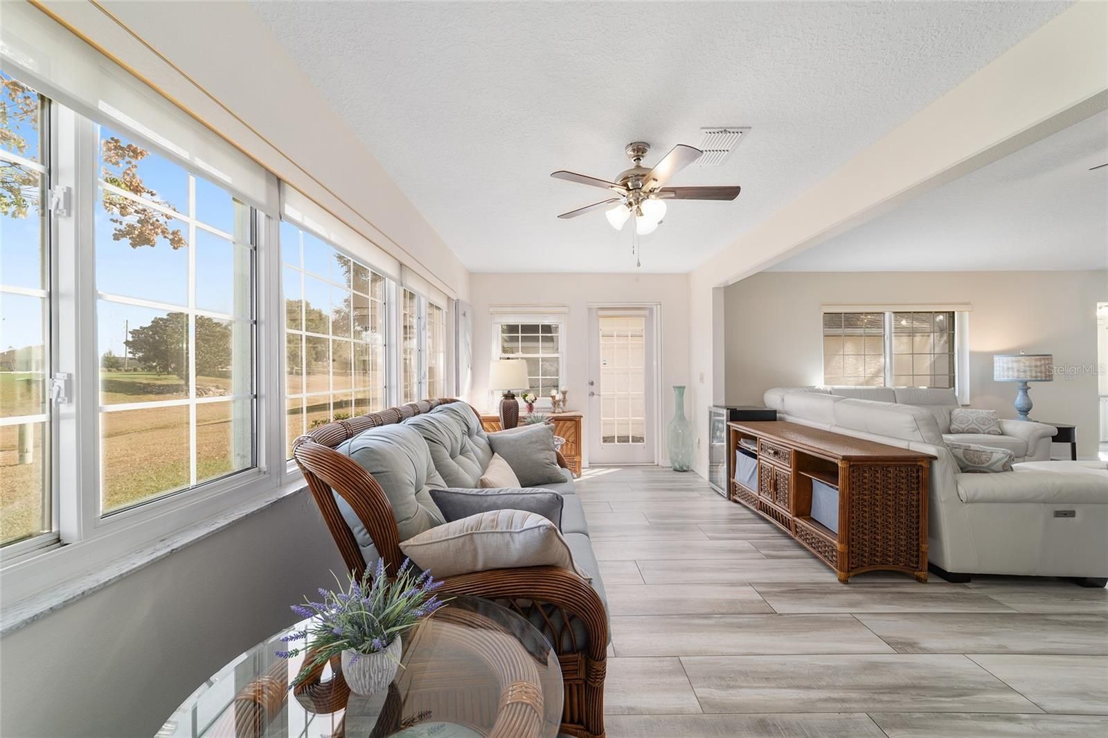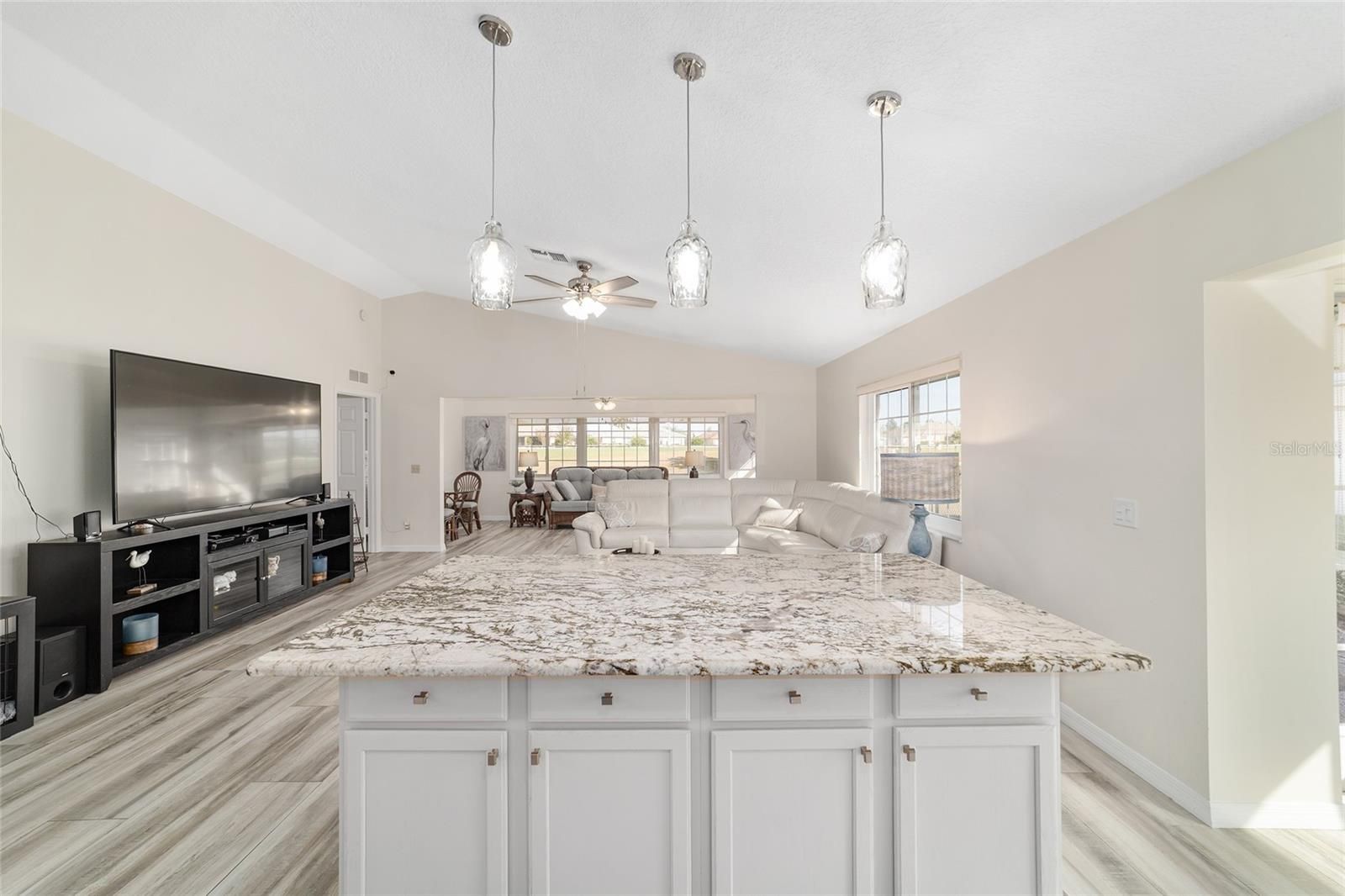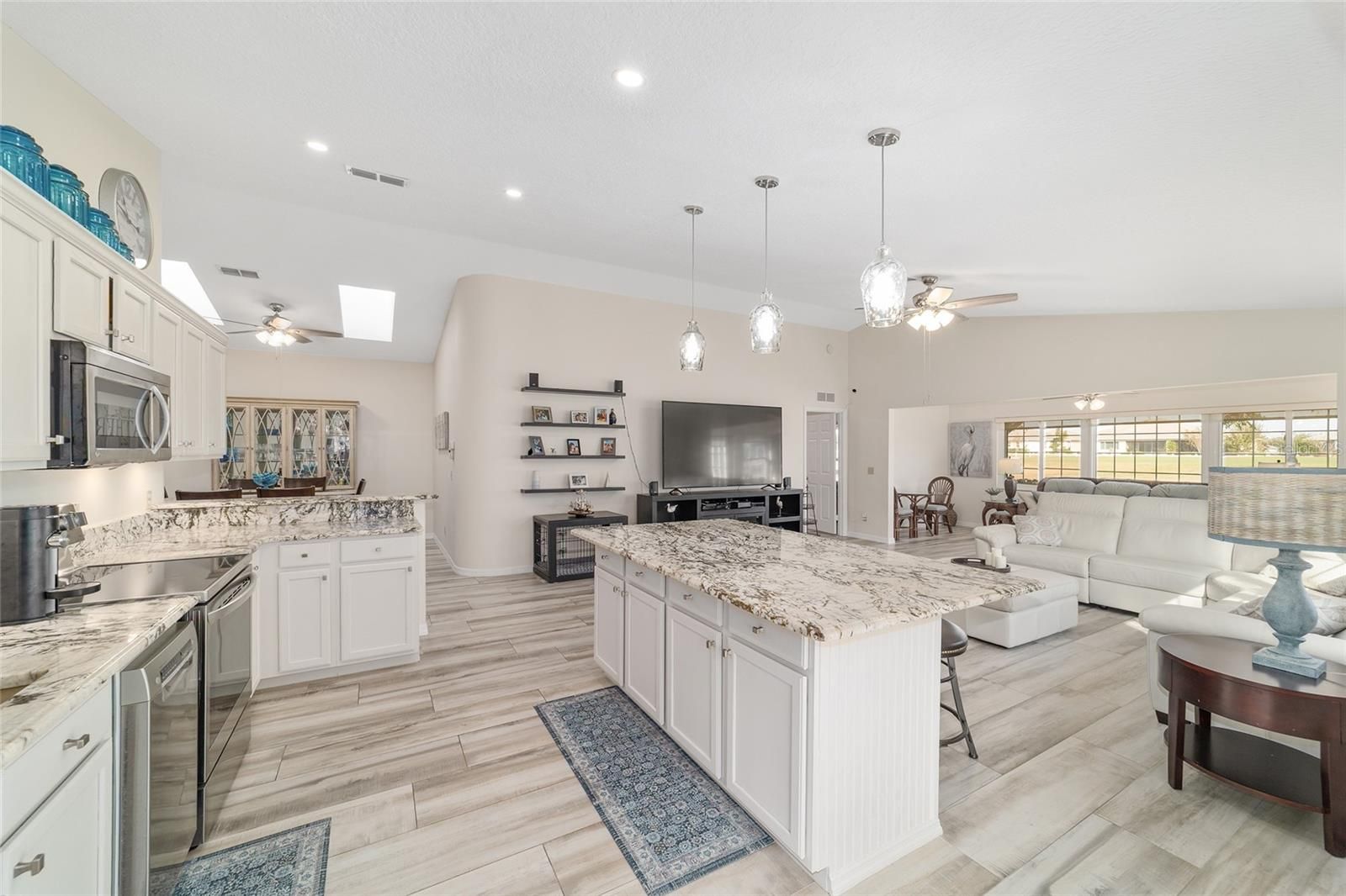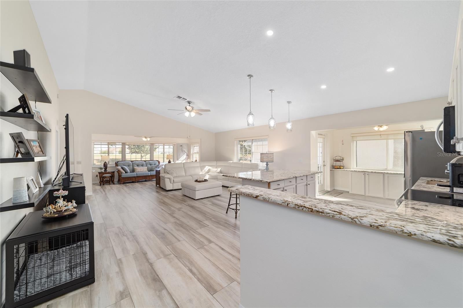 GOLF COURSE FRONT!!! Spectacular Open Concept Jefferson remodel! Stunning premium granite throughout! Views across the Tortoise and Hare golf course put you right in the game! Full build out lanae offers morning coffee while you watch the tournament from the comfort of home. Huge patio for entertaining. Dramatic master with ensuite that offers gorgeous waterfall tile walk in shower and spacious walk in closet with extra storage features. Porcelain tile throughout the home looks like wood, wears like iron. Twin size guest room with plenty of privacy. Washer dryer located inside Third bedroom shares bath, Oversize garage with man door. HVAC 2017, with UV Purification system. Roof 2014. Energy efficient Hurricane Windows with Custom Solor shades. Close to all amenities--indoor and outdoor pools, golf, pickleball, bocce, RC air park, RC car track, Circle Square Cultural Center, Master of Possibilities classes, Farmers Market, weekly craft shows--there is so much to do, you will wonder how to fit it all in!