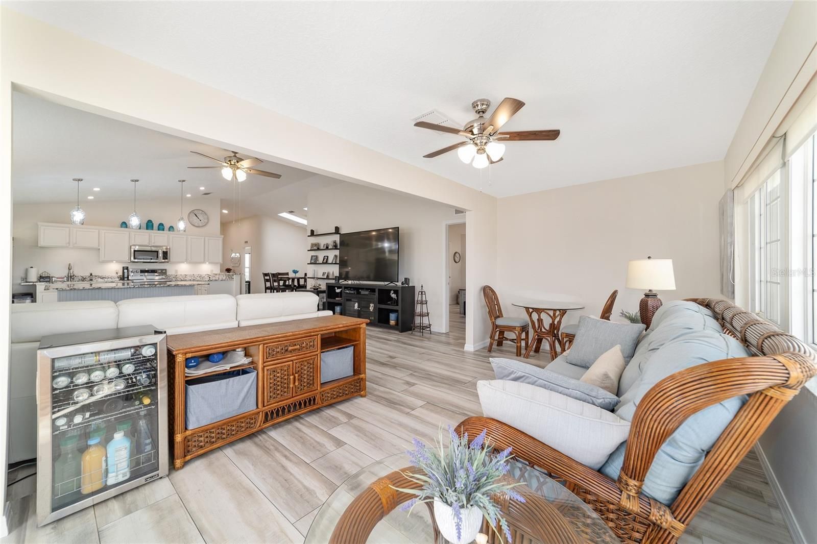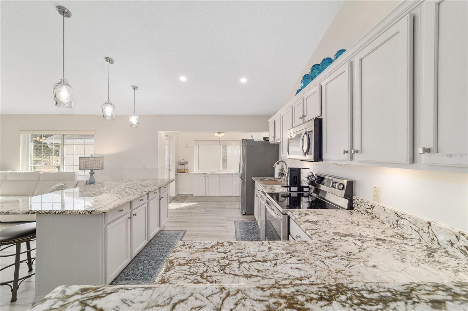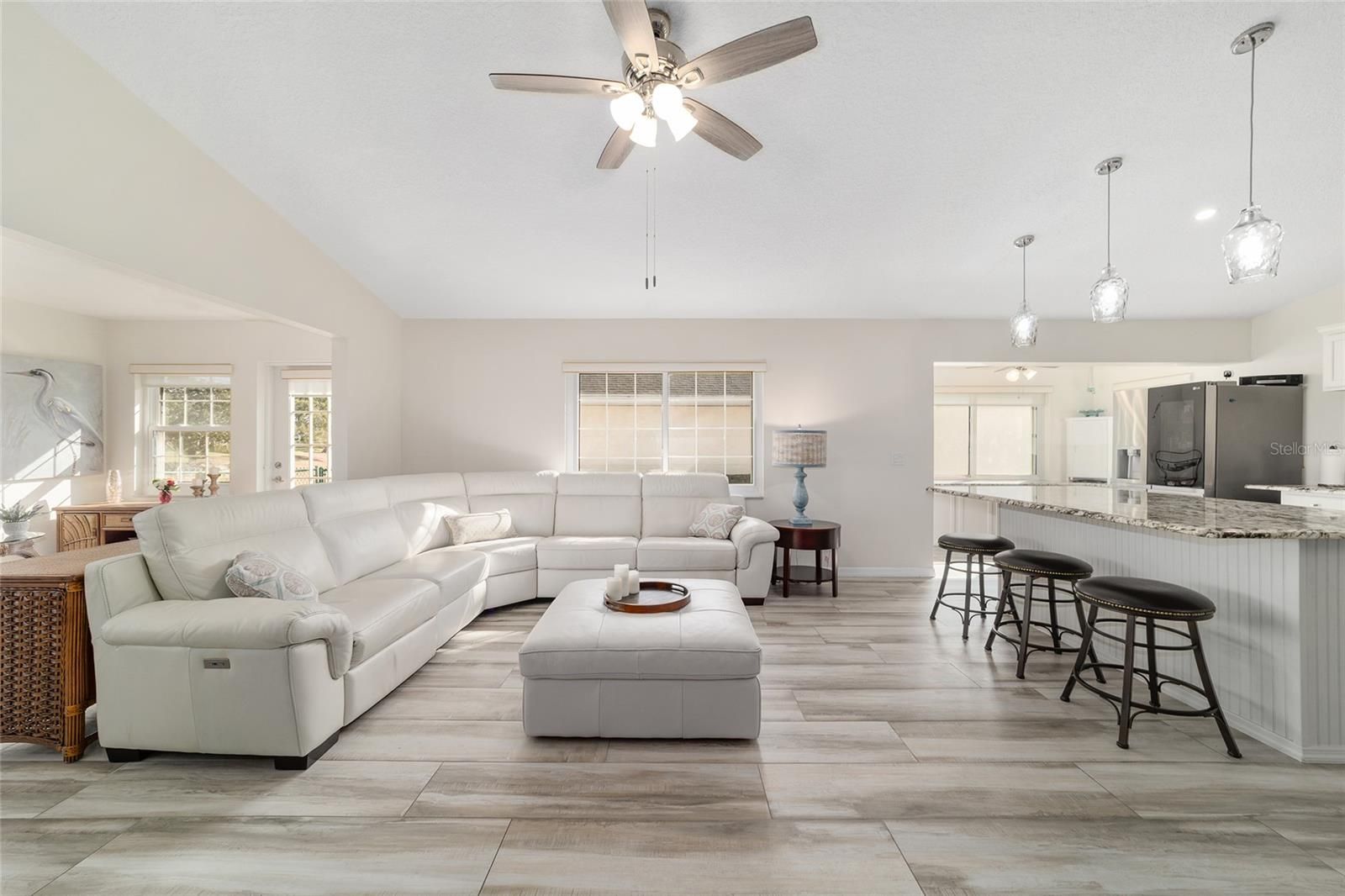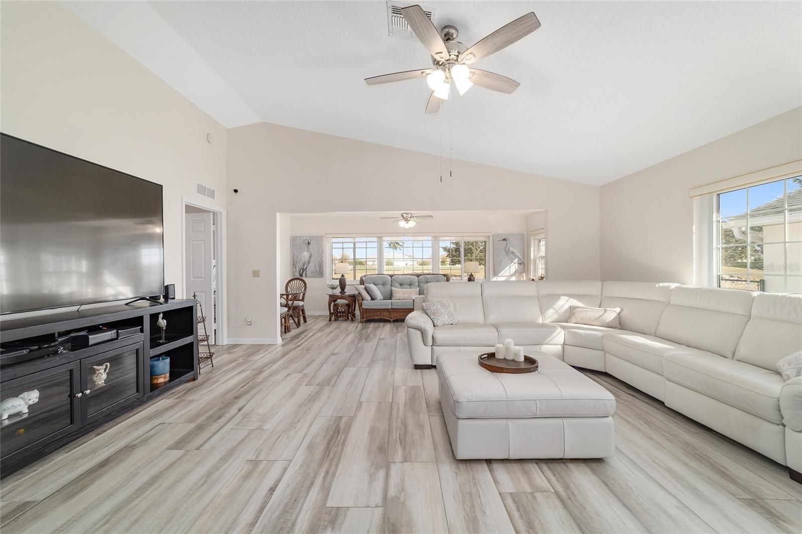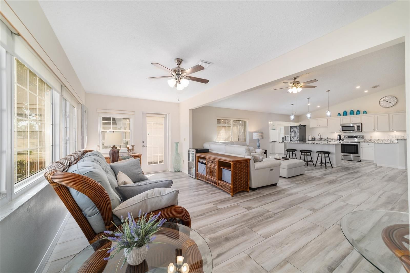 GOLF COURSE FRONT!!! Spectacular Open Concept Jefferson remodel! Stunning premium granite throughout! Views across the Tortoise and Hare golf course put you right in the game! Full build out lanae offers morning coffee while you watch the tournament from the comfort of home. Huge patio for entertaining. Dramatic master with ensuite that offers gorgeous waterfall tile walk in shower and spacious walk in closet with extra storage features. Porcelain tile throughout the home looks like wood, wears like iron. Twin size guest room with plenty of privacy. Washer dryer located inside Third bedroom shares bath, Oversize garage with man door. HVAC 2017, with UV Purification system. Roof 2014. Energy efficient Hurricane Windows with Custom Solor shades. Close to all amenities--indoor and outdoor pools, golf, pickleball, bocce, RC air park, RC car track, Circle Square Cultural Center, Master of Possibilities classes, Farmers Market, weekly craft shows--there is so much to do, you will wonder how to fit it all in!