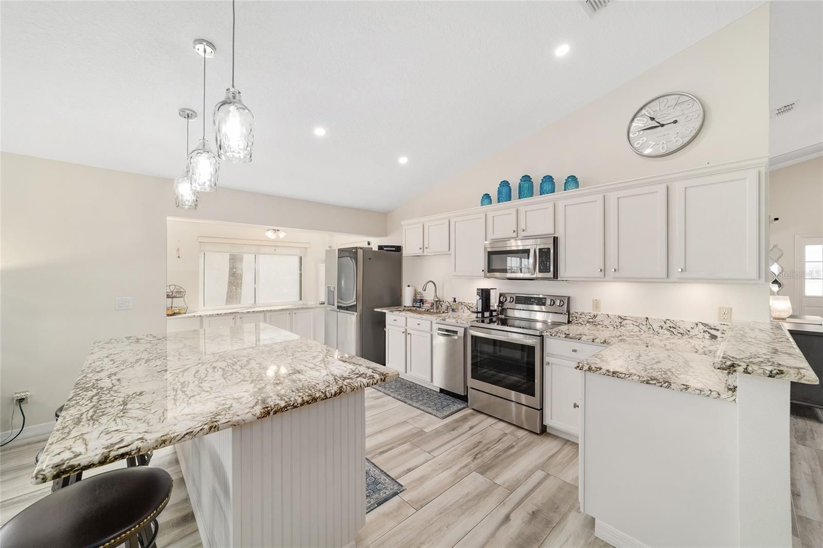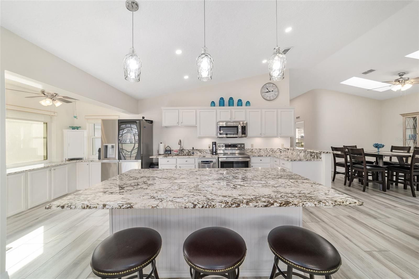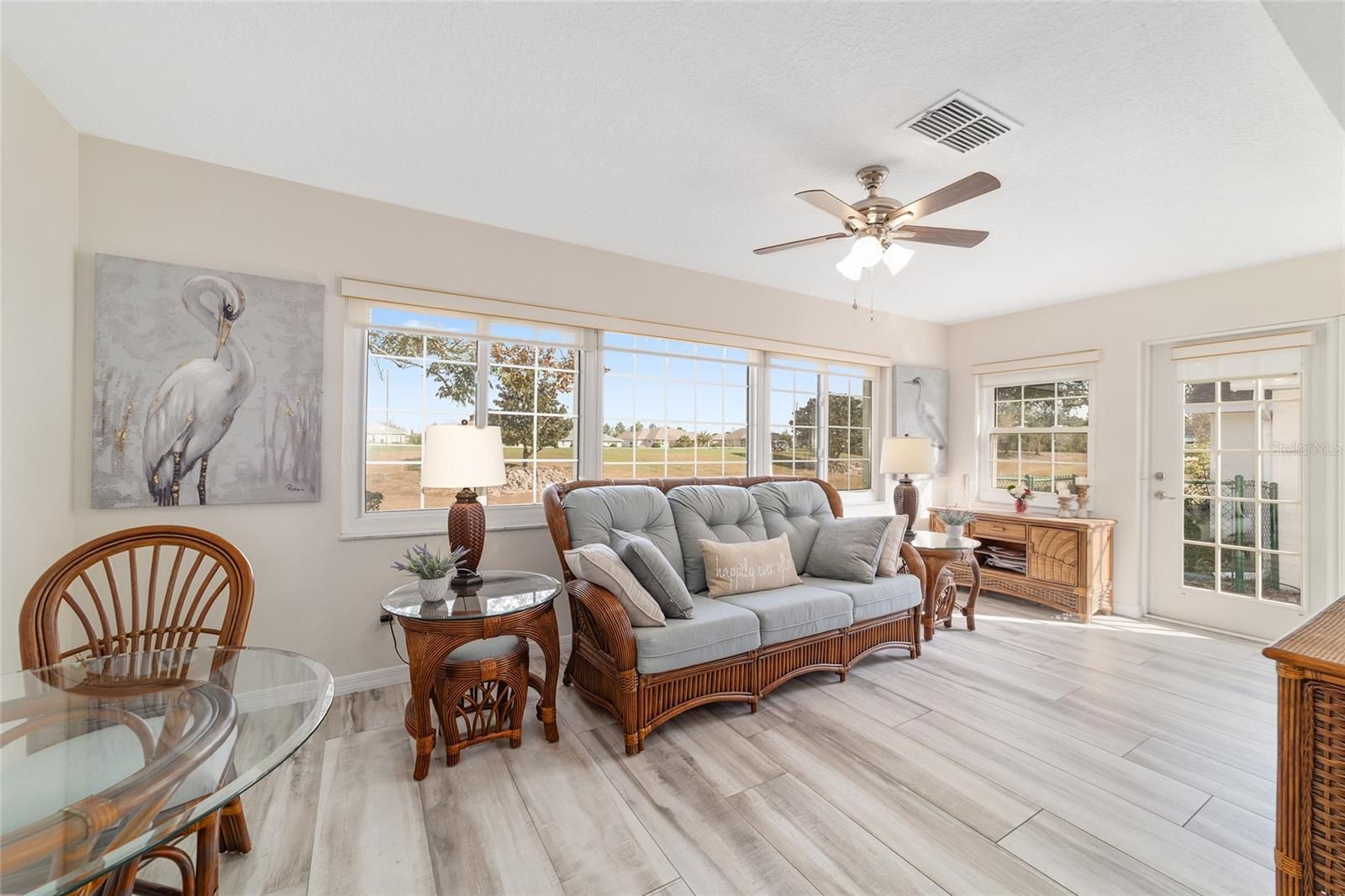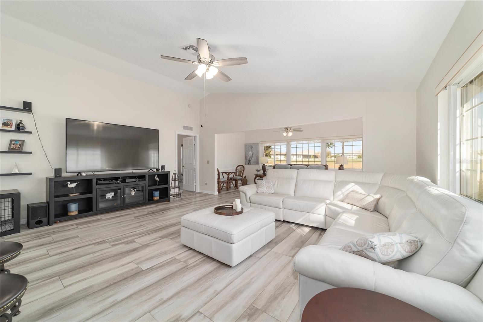 GOLF COURSE FRONT!!! Spectacular Open Concept Jefferson remodel! Stunning premium granite throughout! Views across the Tortoise and Hare golf course put you right in the game! Full build out lanae offers morning coffee while you watch the tournament from the comfort of home. Huge patio for entertaining. Dramatic master with ensuite that offers gorgeous waterfall tile walk in shower and spacious walk in closet with extra storage features. Porcelain tile throughout the home looks like wood, wears like iron. Twin size guest room with plenty of privacy. Washer dryer located inside Third bedroom shares bath, Oversize garage with man door. HVAC 2017, with UV Purification system. Roof 2014. Energy efficient Hurricane Windows with Custom Solor shades. Close to all amenities--indoor and outdoor pools, golf, pickleball, bocce, RC air park, RC car track, Circle Square Cultural Center, Master of Possibilities classes, Farmers Market, weekly craft shows--there is so much to do, you will wonder how to fit it all in!