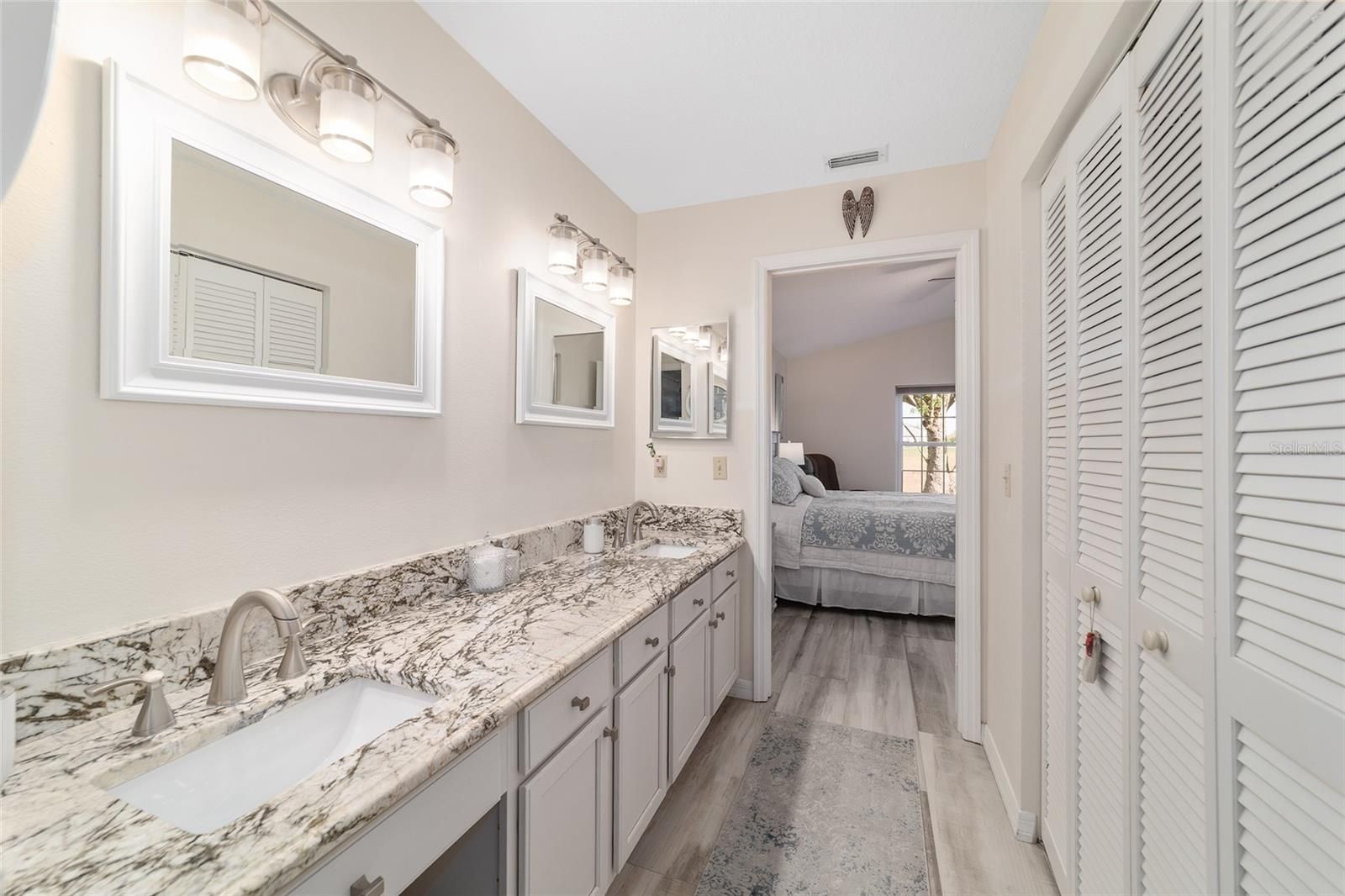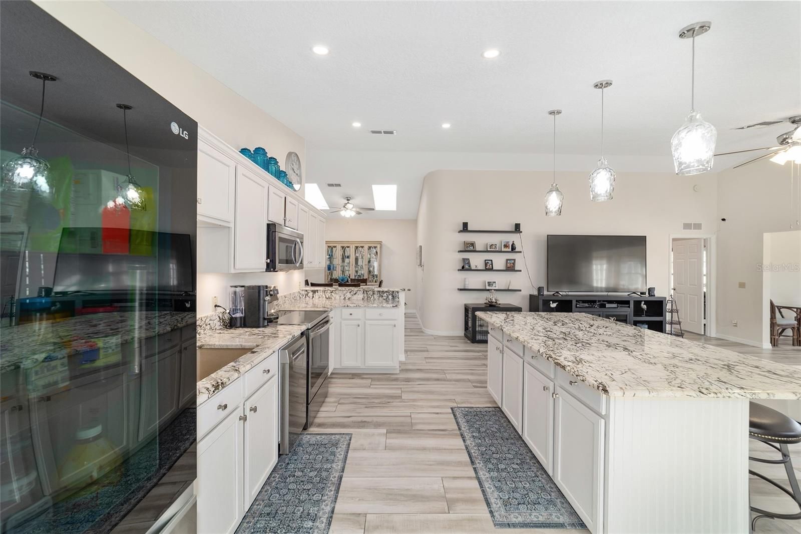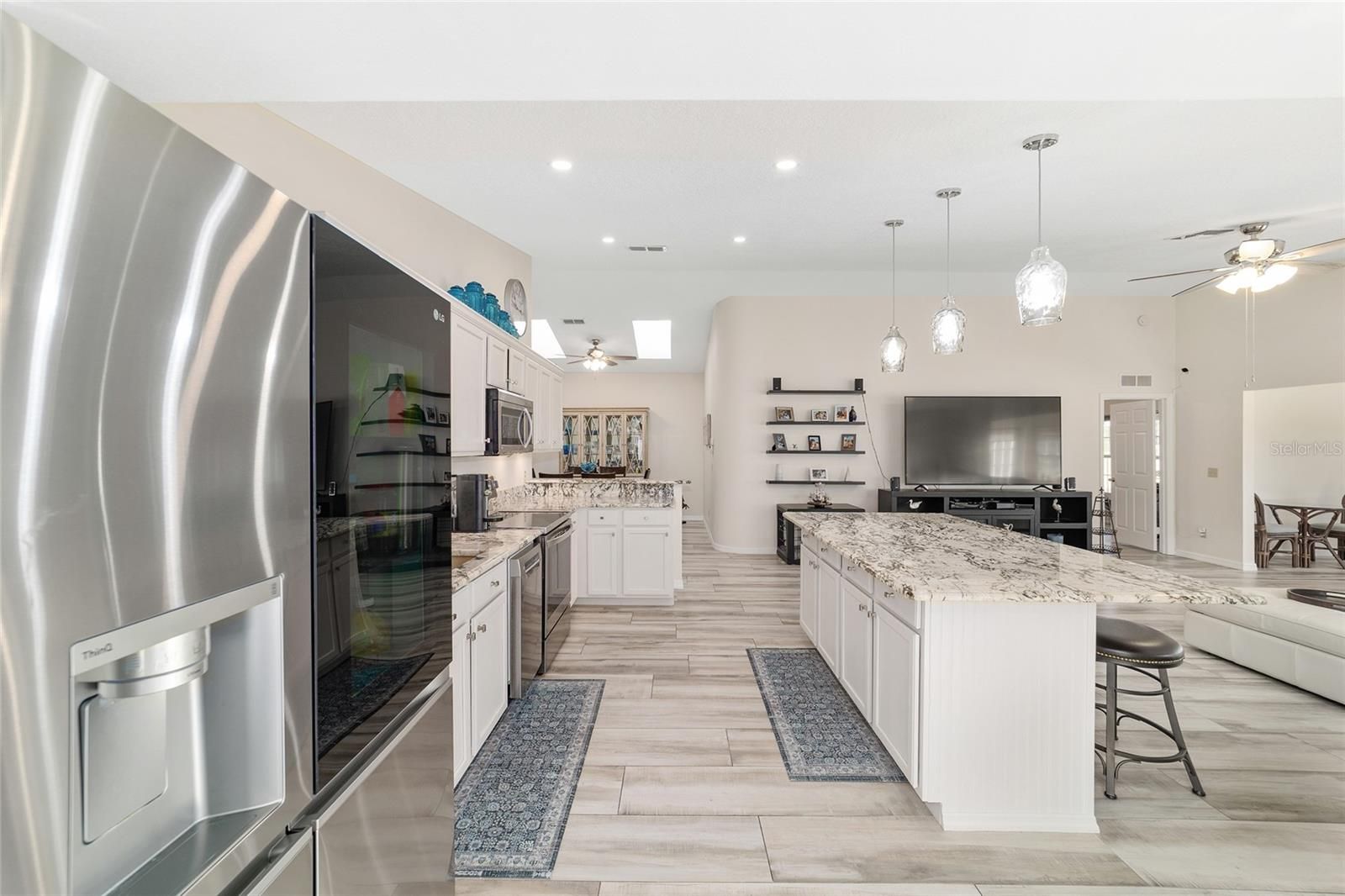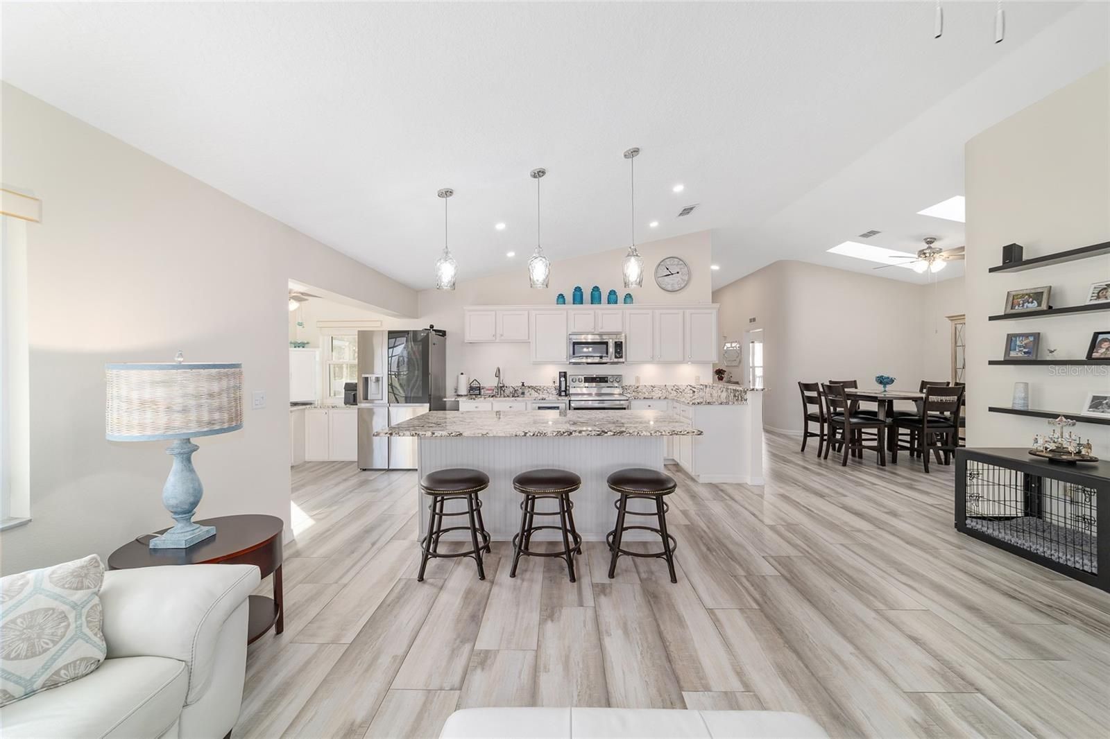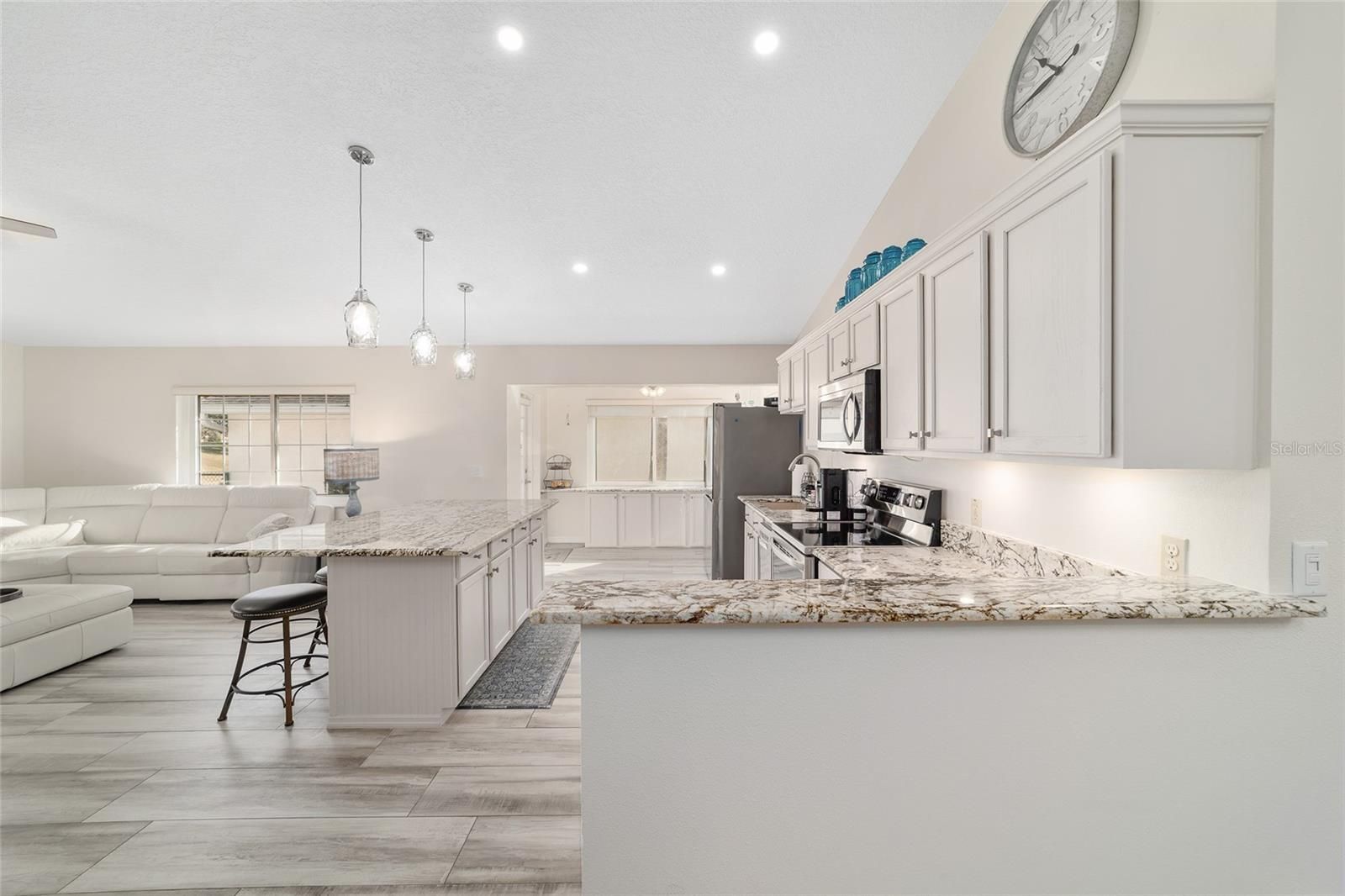 GOLF COURSE FRONT!!! Spectacular Open Concept Jefferson remodel! Stunning premium granite throughout! Views across the Tortoise and Hare golf course put you right in the game! Full build out lanae offers morning coffee while you watch the tournament from the comfort of home. Huge patio for entertaining. Dramatic master with ensuite that offers gorgeous waterfall tile walk in shower and spacious walk in closet with extra storage features. Porcelain tile throughout the home looks like wood, wears like iron. Twin size guest room with plenty of privacy. Washer dryer located inside Third bedroom shares bath, Oversize garage with man door. HVAC 2017, with UV Purification system. Roof 2014. Energy efficient Hurricane Windows with Custom Solor shades. Close to all amenities--indoor and outdoor pools, golf, pickleball, bocce, RC air park, RC car track, Circle Square Cultural Center, Master of Possibilities classes, Farmers Market, weekly craft shows--there is so much to do, you will wonder how to fit it all in!