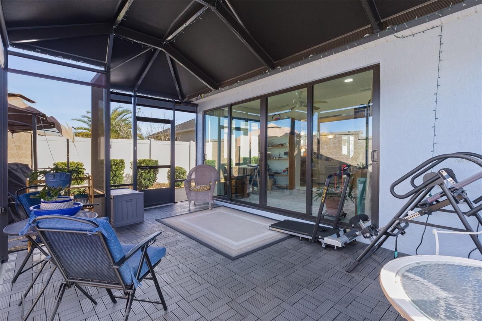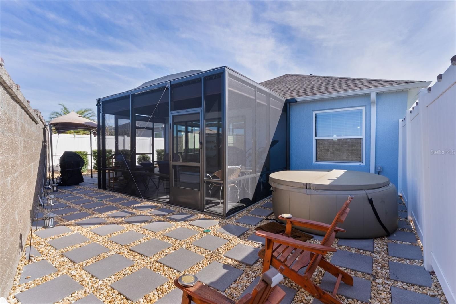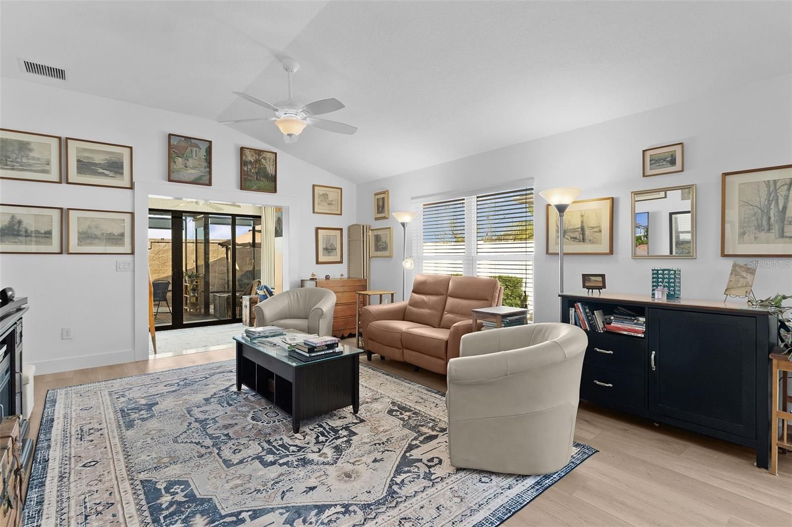 ~BUILT IN 2016~ ~14’-8”x8’-8” GLASS ENCLOSED LANAI UNDER HEAT & AIR~ ~SOLAR PANELS PAID FOR~ ~2025 HVAC~ ~2024 Hot Water Heater with Rheem Heat Pump~ Beautiful 2/2 DURHAM model Courtyard Villa in the Village of WOODBURY, PHILLIPS VILLAS! This home provides a spacious OPEN FLOOR PLAN and numerous upgrades throughout. As you enter you are greeted with HIGH VAULTED CEILINGS and LUXURY VINYL PLANK FLOORING for a bright, airy feel. The living room features a ceiling fan, and the dining area shares the same soaring ceilings. The kitchen is a showstopper with QUARTZ COUNTERTOPS and BACKSPLASH, stainless-steel appliances, recessed lighting, roll-out lower cabinets, and a CLOSET PANTRY. The primary suite boasts a TRAY CEILING, ceiling fan, WALK-IN CLOSET, and a beautiful ensuite bath with PORCELAIN TILE, a GORGEOUS TILED WALK-IN SHOWER with NEW GLASS DOORS, and tall cabinetry with QUARTZ countertops. The guest bedroom also features vaulted ceilings, a ceiling fan, and a built-in closet, while the guest bath includes a TILED WALK-IN SHOWER with NEW GLASS DOORS, porcelain tile, linen closet, and QUARTZ counters. Relax year-round in the GLASS ENCLOSED LANAI under HEAT AND AIR or open the telescoping sliders to the BIRDCAGE with COMPOSITE DECKING and BLINDS for outdoor enjoyment. The lanai features a ceiling fan and provides a seamless blend of indoor and outdoor living. The 1½-car garage includes a laundry tub, LG WASHER AND DRYER, shelving, and a SOLAR ATTIC FAN. The home has SOLAR PANELS with a 6-hour emergency battery and a POWER SURGE PROTECTOR. For your comfort, the Hot Water Heater kicks cold air back into the garage. This stunning villa combines comfort, style, and thoughtful upgrades—ready for you to move right in and enjoy The Villages lifestyle! Minutes from Mulberry Rec Center, First Responders Rec Center, Nancy Lopez Golf Course, and the Mulberry Shopping Center for shopping, restaurants and more.