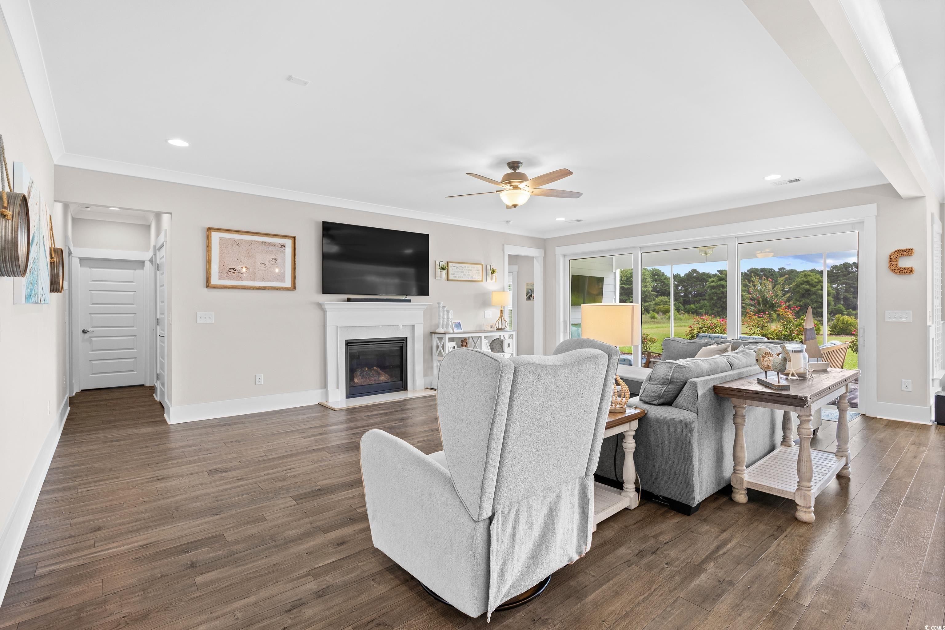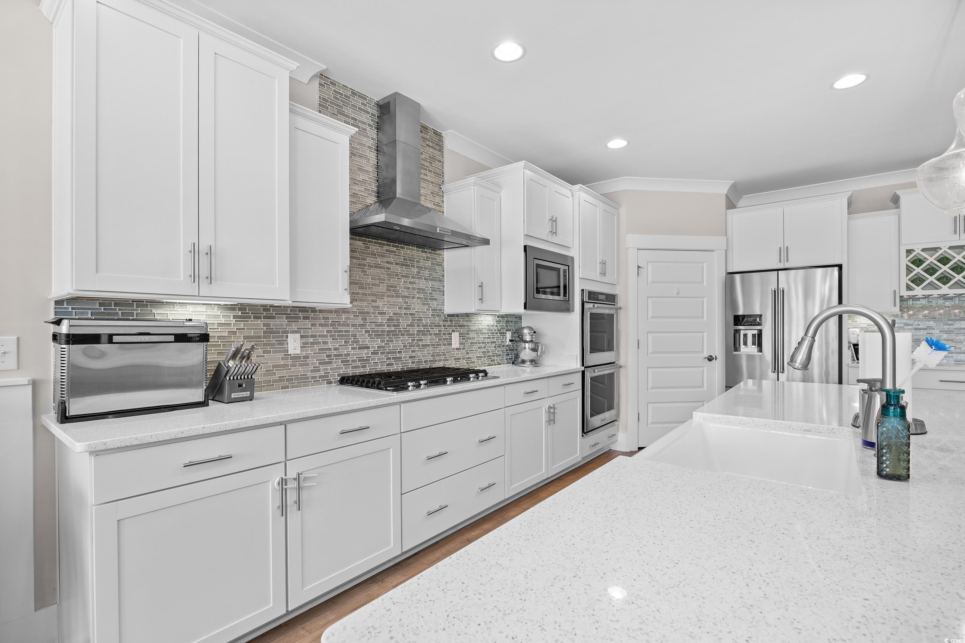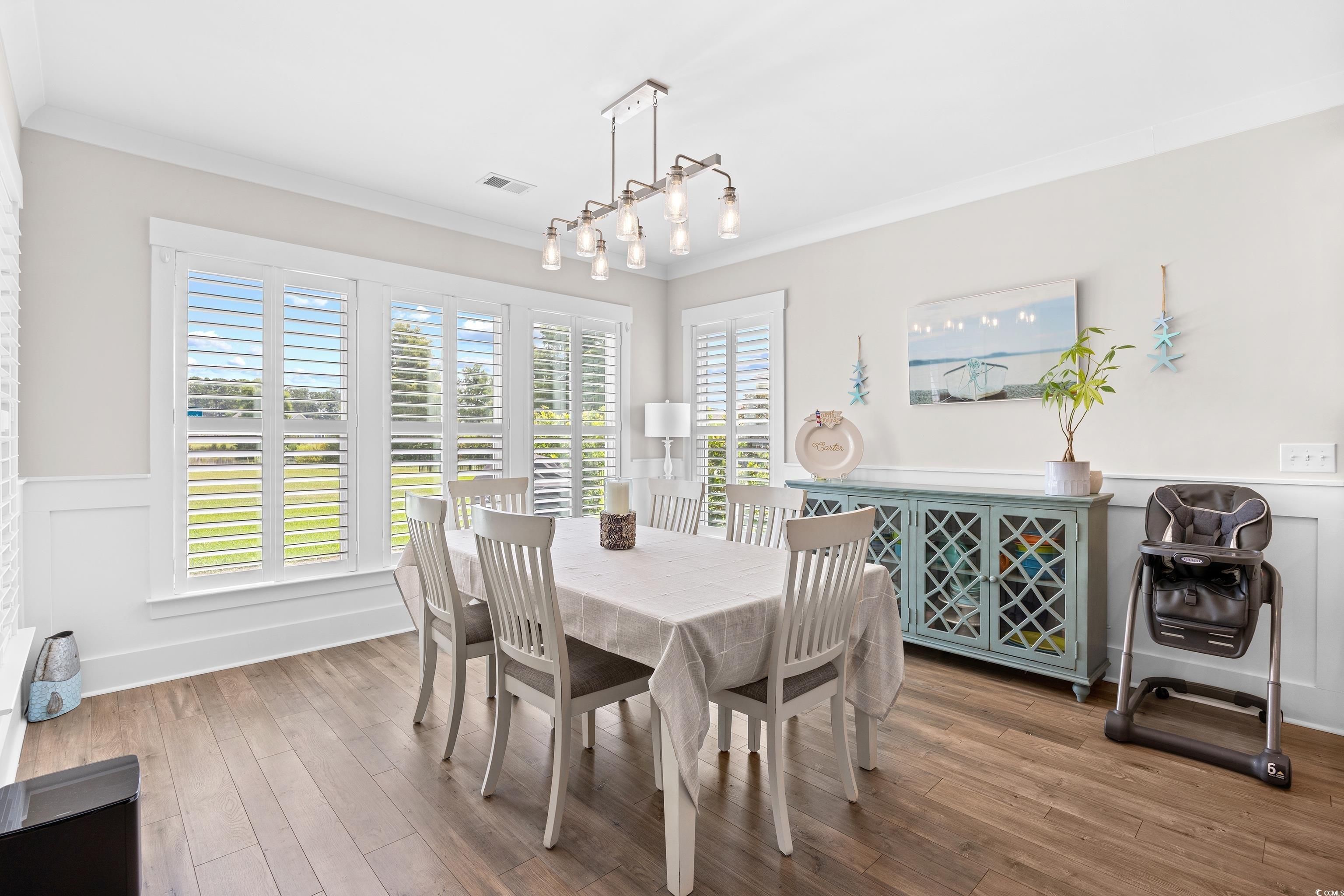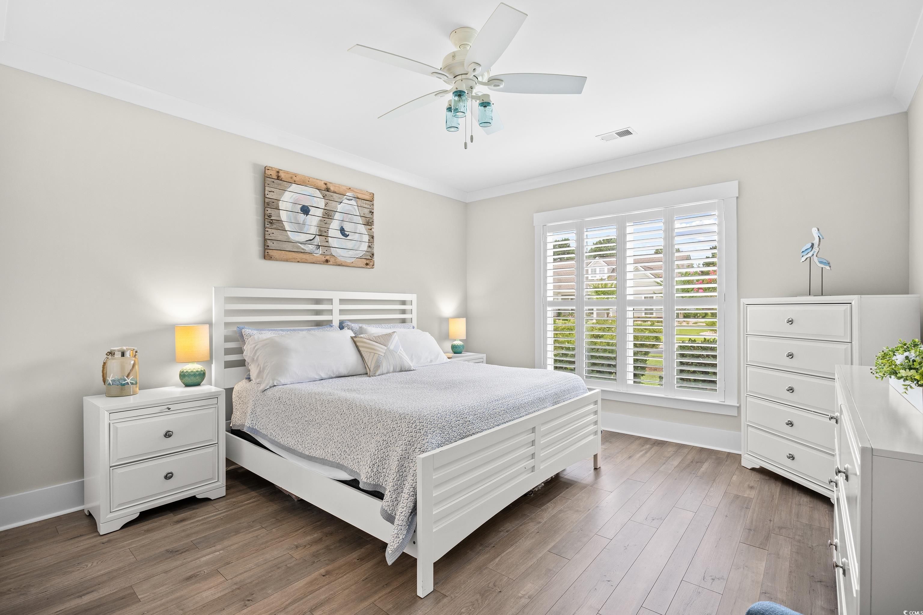 Welcome to this stunning and spacious 3-bedroom 3-bathroom home in the desirable Crow Creek neighborhood! Home is located on one of the biggest lots in this private gated golf course community with large backyard and screened lanai that boasts views of the water from 2 sides. Home has 2.5 car garage (2 car and golf cart garage) with a 4ft garage extension for all your storage and recreational needs. From the moment you walk through the front door you are met with 8ft sliders that allow you to enjoy this gorgeous view. The gourmet chef’s kitchen features double ovens and all Kitchen Aid stainless steel appliances - perfect for entertaining! Extra-large gas cook-top for all your cooking needs. Laminate flooring throughout - no carpet. Enjoy the luxury of quartz countertops and soft shut cabinets throughout the home. Open floor plan with tons of natural light allowed by plantation shutters throughout. Lovely amenity center with a pool and spa, exercise room, game room, tennis and pickle-ball courts. Less than 10 miles from the beach." Listing Agent and Co-Listing agent are licensed both in North and South Carolina. Flood insurance not required for this property. However, owners did purchase a Flood Policy thorough Wright Insurance company even though this property is located outside the AE zone area. SQUARE FOOTAGE IS APPROXIMATE AND NOT GUARANTEED. BUYER IS RESPONSIBLE FOR VERIFICATION.
