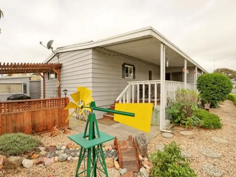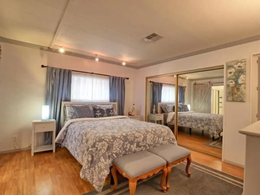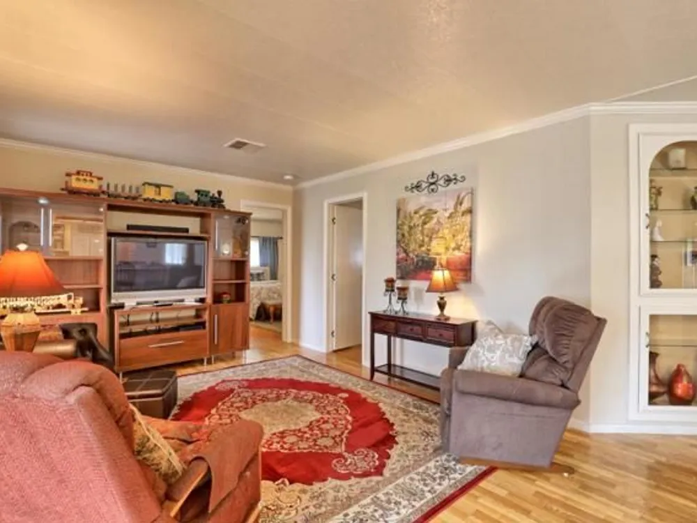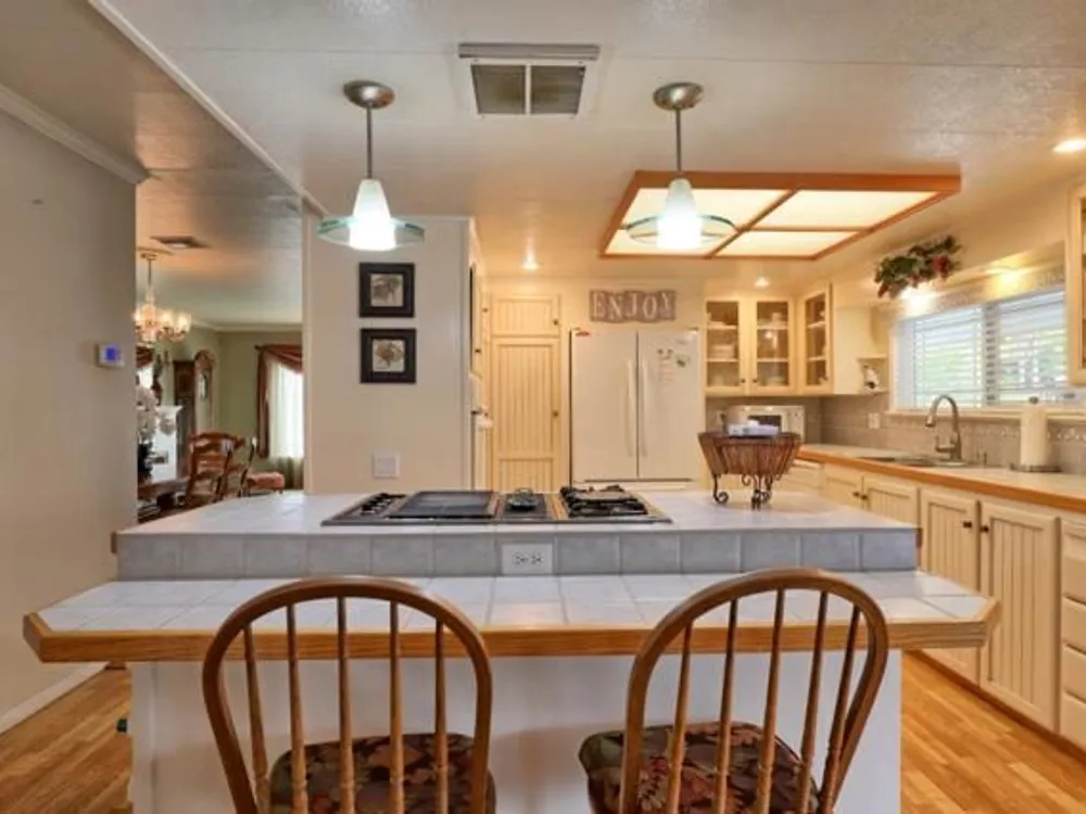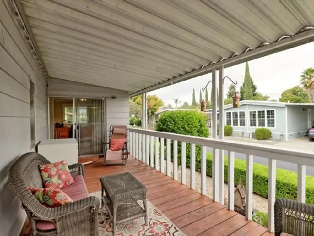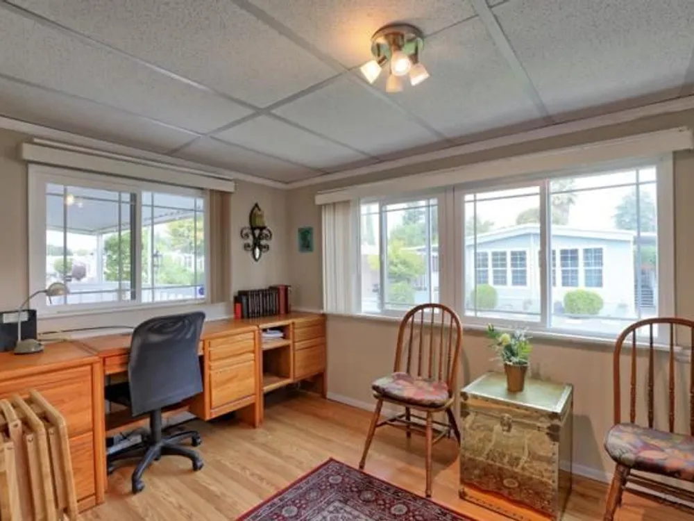 Lovely updated 1,536 sq ft home on a terrific corner lot with welcoming front and rear covered decks perfect for relaxing or entertaining. The spacious family room has an open feel and the addition creates a versatile office area. Enjoy a beautifully remodeled kitchen with tile counters, breakfast bar seating, and light cabinetry, plus tastefully updated baths. Upgrades include sheetrock walls, dual-pane windows, newer furnace and A/C, updated plumbing, earthquake bracing, and more. Two bedrooms and two full baths are complemented by the added office space for work or hobbies. Bright living and dining areas flow easily to the kitchen, while the outdoor spaces offer both privacy and charm. A well-maintained home with thoughtful improvements and plenty of room to spread out. Move-in ready and waiting for its next owner. Enjoy access to clubhouse, pool, spa, gym, tennis, and RV parking. A must-see gem in Woodland Estates, Morgan Hills most desirable senior park; one of only two resident owned parks in Santa Clara county! Woodland Estates is a resident owned senior park with a low park fee of only $370/mo including water, sewer & garbage!