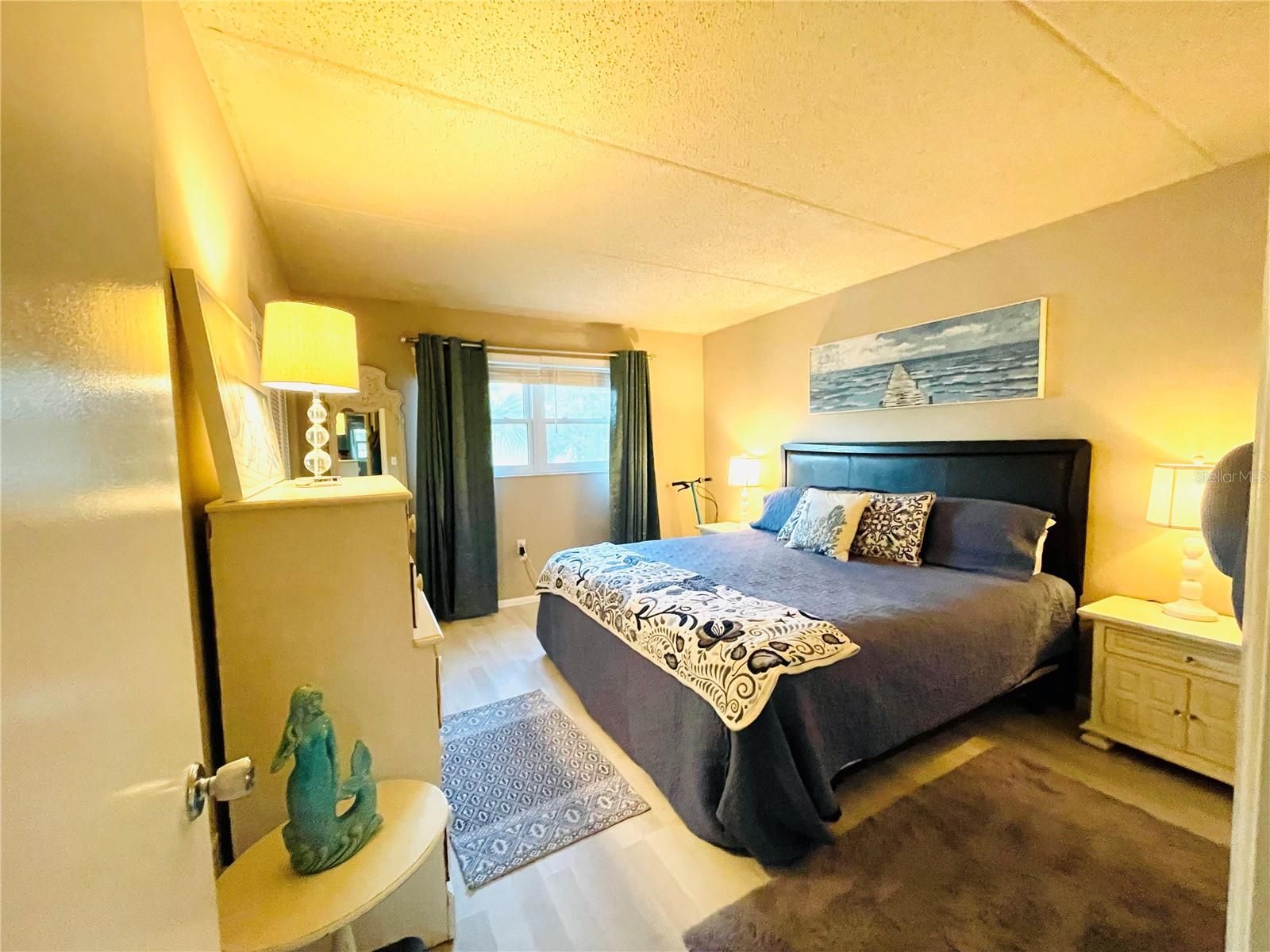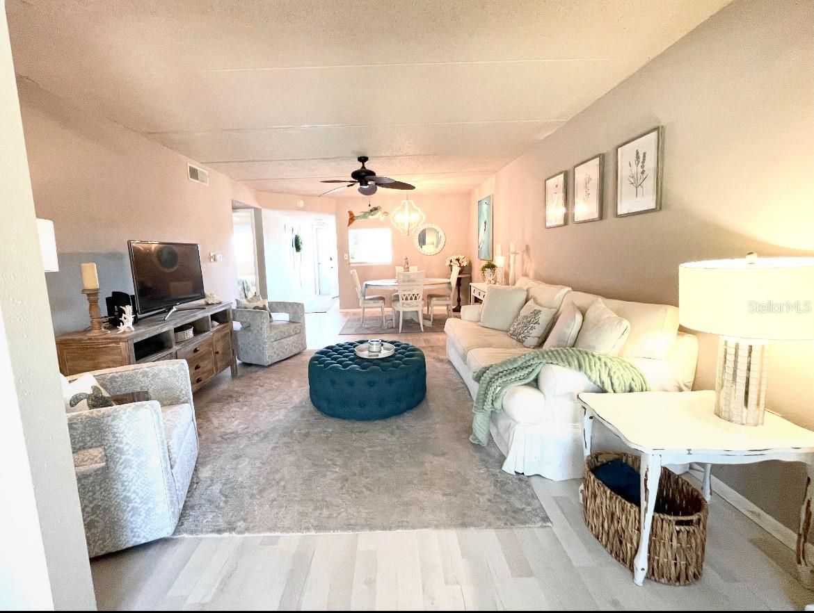 New to market. Come see this stunning and tastefully updated top floor condo with a coastal vibe. Located in the heart of Dunedin, this highly sought after 55+ community of Heather Lakes is a gem. Filled with natural light, this 2 bedroom home has the comfort and convenience you're looking for. The updated kitchen has rich wood cabinetry and granite countertops. The spacious open floor plan brings in a lot of natural light and feels immaculate with luxury vinyl plank flooring throughout. The attached bonus room is the perfect place to unwind with views of the pond, oak trees and green spaces. There are two spacious bedrooms and the primary has two closets for your storage needs. There are newer hurricane windows, the HVAC is newly installed in 2020 and the building has a new roof. Enjoy the active clubhouse, the heated pool, outdoor grilling spot or the community garden! Walk to downtown Dunedin with an abundance of choices for restaurants, shopping and breweries. The Pinellas Trail is nearby as well as spring training for the Toronto Blue Jays. Awarded winning gulf beaches are 10 minutes away by car. There is an elevator for the building, assigned covered parking and no flood zone worries. Included in the HOA are cable, internet, maintenance of exterior and grounds, water, sewer, trash, and escrow reserves. Furnishings are negotiable.