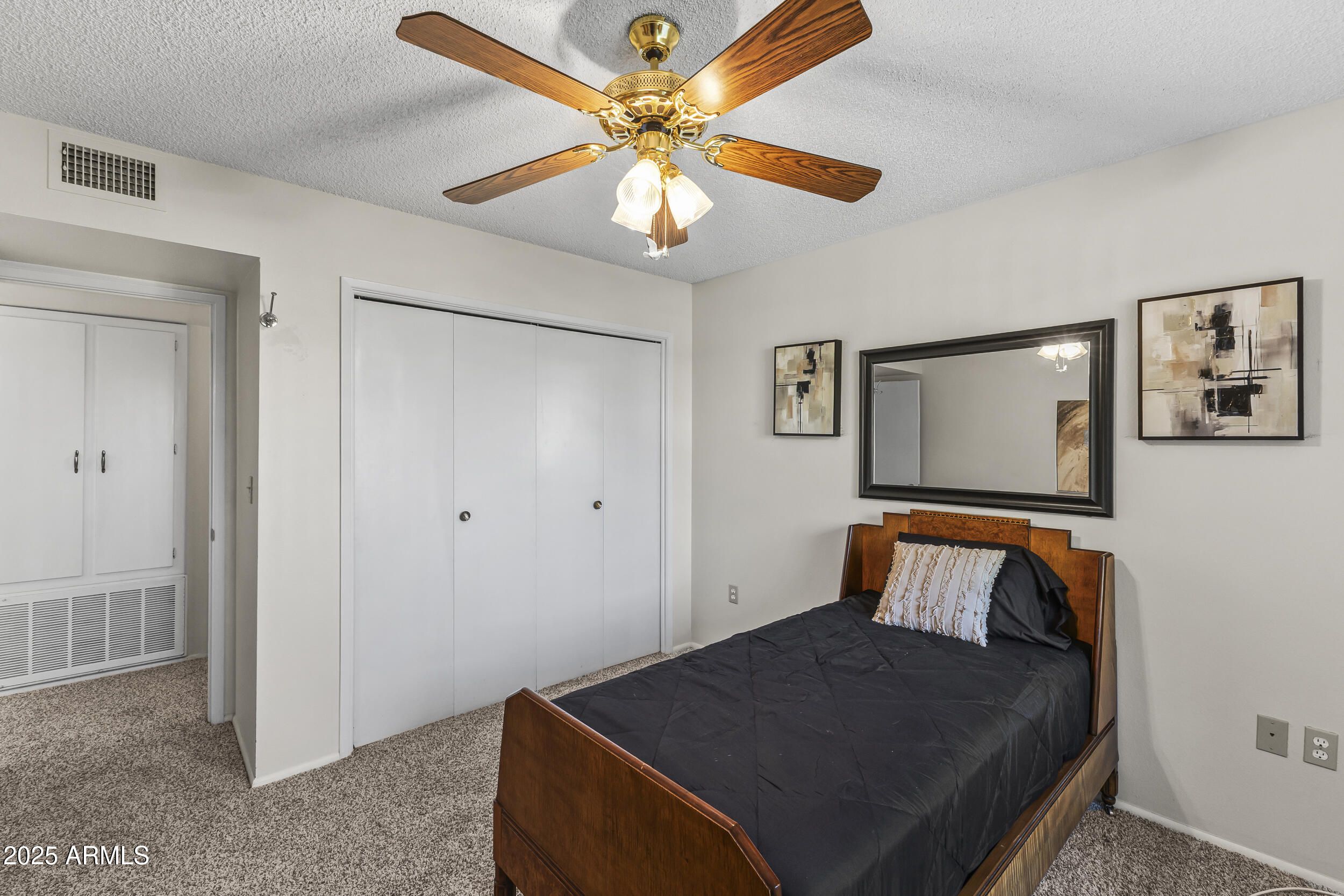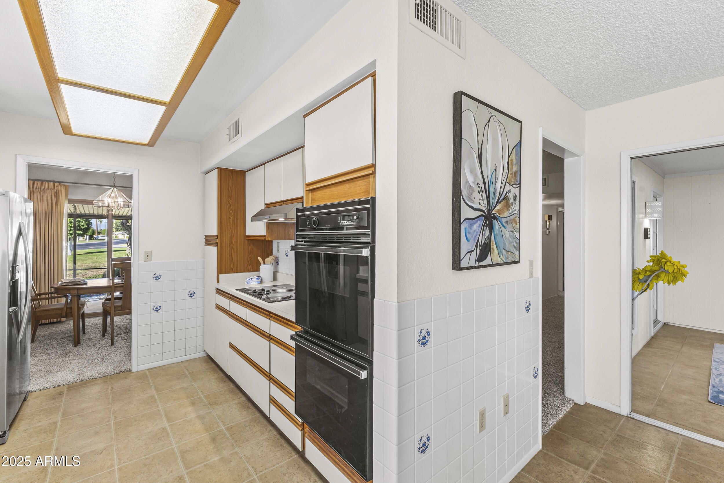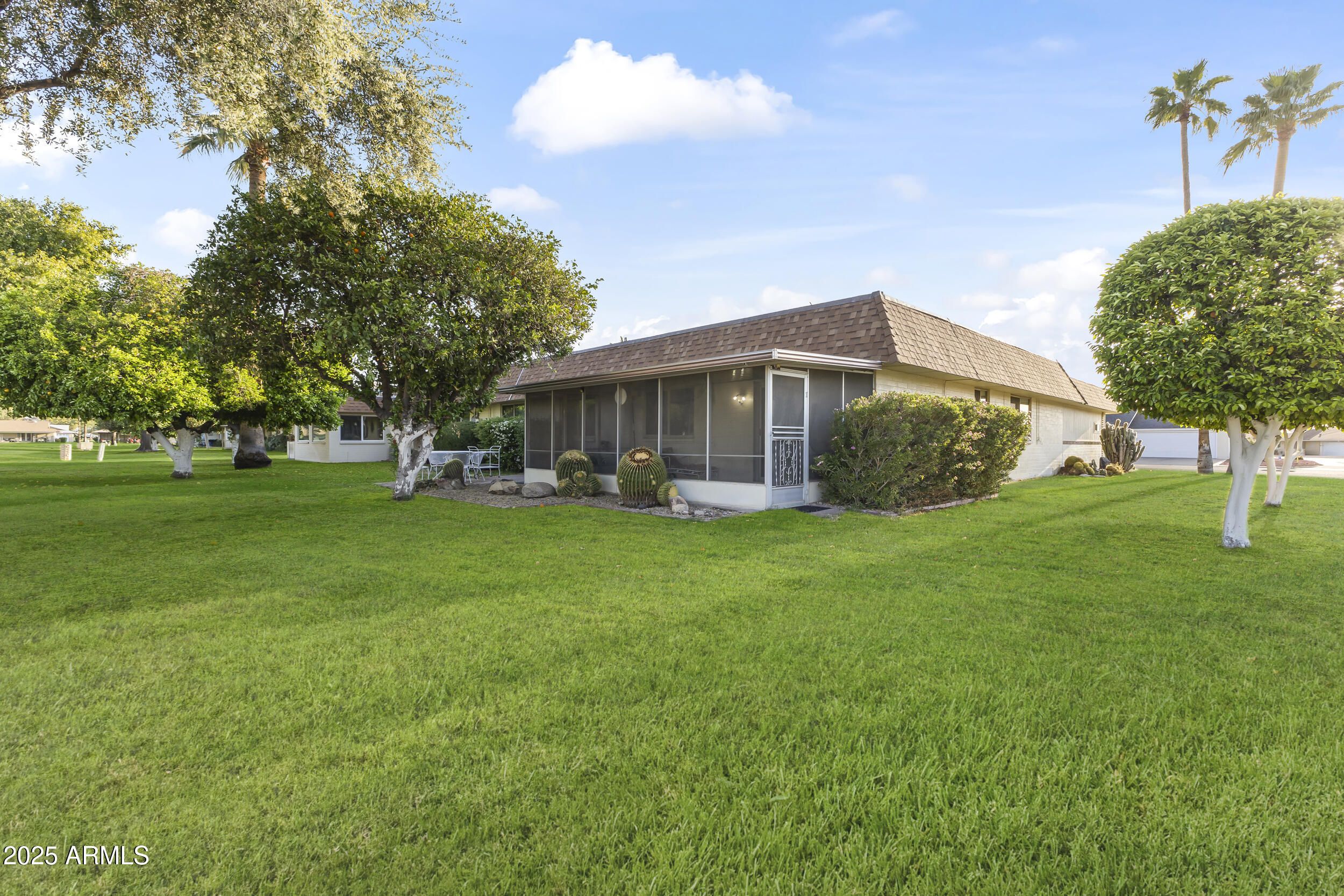 Welcome to this inviting and spacious 3-bedroom, 2-bathroom Charming Gemini Twin/Duplex nestled in the heart of the sought-after Sun Cities active adult community. This beautiful corner lot home offers a thoughtful layout with an array of desirable features designed for comfort and convenience. Step into the light & bright enclosed front patio/atrium, where soaring ceilings and skylights create an airy, welcoming ambiance. The eat-in kitchen is light & bright, featuring a built-in desk, double oven, and plenty of cabinet space. The living room and all three bedrooms have new carpet. The main bedroom has a walk-in closet. Enjoy views of the lush green belt from the newer back sliding door, which leads you to a tranquil screened-in patio and an additional paver patio—ideal for grilling and gathering with friends. The home also boasts an inside laundry room/hobby room, providing extra space for projects or additional storage. Stay cool and comfortable year-round with an updated AC unit installed in 2015. The 2-car garage offers ample parking. With convenient access to nearby recreation centers and a golf course, you'll enjoy an active lifestyle just steps from your front door. Don't miss your chance to experience the best of Sun Cities living