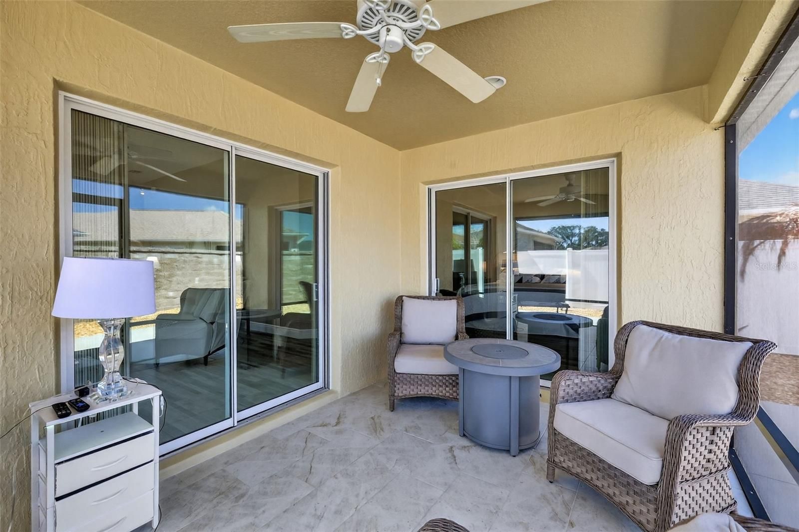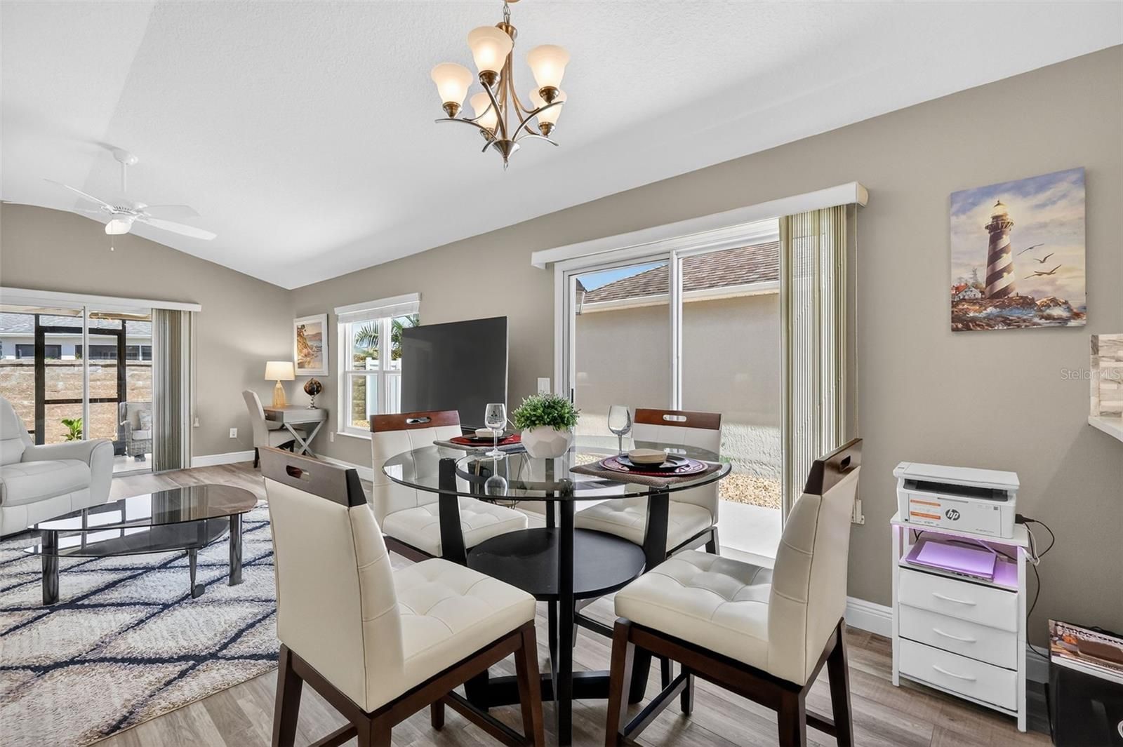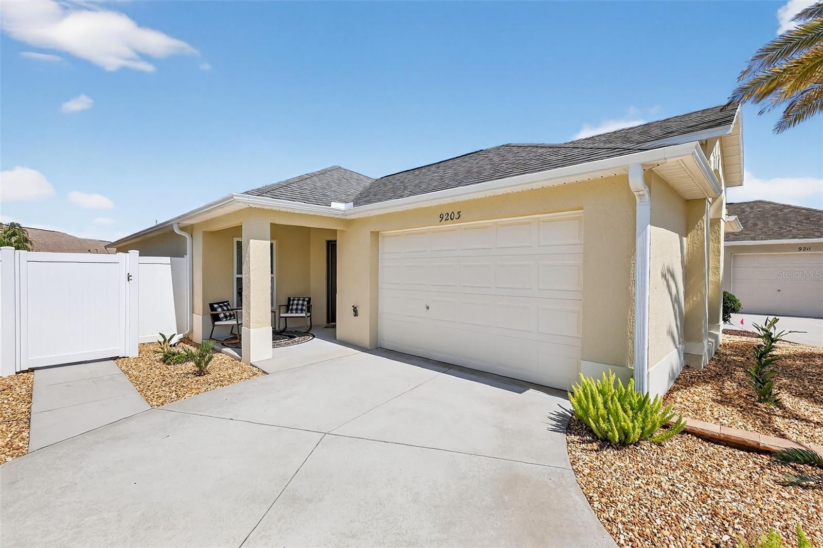 Welcome to Your Dream Home! Discover this MOVE-IN READY 2/2 Cambridge Courtyard Villa, nestled in the serene and desirable Phillips Villas community within the Village of Woodbury. As you approach, the beautifully landscaped exterior, featuring decorative rocks and newly planted greenery, invites you in. Upon entering, you'll be greeted by a spacious interior that radiates warmth and comfort. Luxury vinyl plank flooring throughout adds a sleek, modern touch. The open floor plan, enhanced by vaulted ceilings, allows for a seamless flow from room to room, creating a bright and welcoming atmosphere. The open kitchen is a chef's delight, boasting ample cabinetry, QUARTZ countertops, an EAT-IN bar area, and SS Appliances. The generous living and dining areas are perfect for everyday living and entertaining, while sliding doors off the dining room lead to a concrete patio ideal for grilling. Step outside to the SCREENED LANAI from the living room, a perfect spot for entertaining guests or enjoying a quiet evening. The primary bedroom features a TRAY CEILING, sliders to the lanai, a spacious walk-in closet, and an en-suite bath with a walk-in shower for your comfort. Your guests will appreciate their privacy in the guest bedroom, which offers a vaulted ceiling, ample closet space, and an en-suite bath, essentially providing a second suite. The LARGE PRIVATE COURTYARD has NO GRASS, ensuring low-maintenance care while being perfect for entertaining, relaxing, or soaking up the Florida lifestyle. Phillips Villas features its own neighborhood pool and is conveniently located near the VA Hospital, abundant shopping, and dining options. You'll also be minutes from the Mulberry Rec Center, which includes a pool and 10 pickleball courts, as well as the First Responders Rec Center, pool pickleball courts, fire-pit and putting course. For golf enthusiasts, the Nancy Lopez Country Club offers a stunning 27-hole championship course, fine dining, and casual fare at the pool bar, with four additional executive golf courses just a short golf cart ride away. This location can't be beat! ROOF, HVAC, WATER HEATER - 2016 | Lanai Tile - 2020 | Interior Painted - 2020 | Quartz Counters and Backsplash - 2023 | Range - 2026 | Landscaping - 2026 | BOND PAID - 2026 | 2014 Yamaha Gas Golf Cart included | Turn-Key see attached listing of items