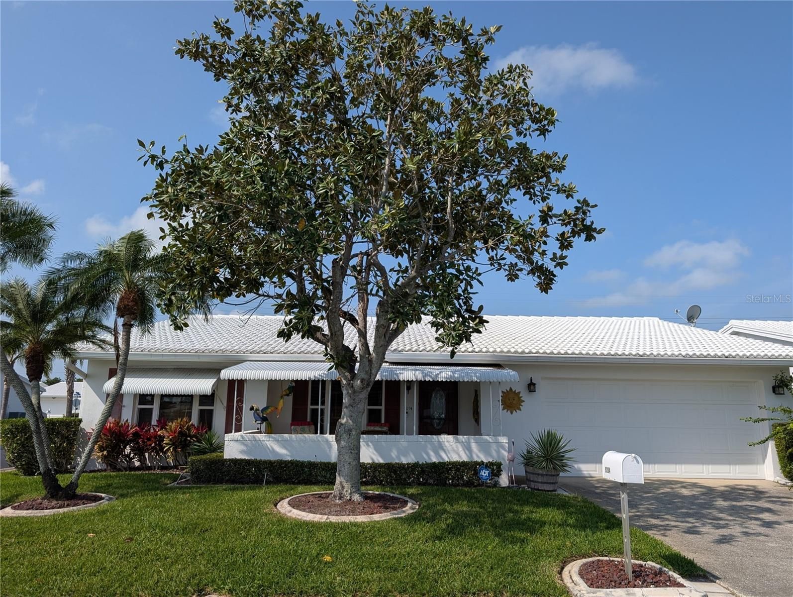 Tropical "PHILODENDRON" on corner lot, centrally located in Tampa Bay’s 55+ community, Mainlands of Tamarac by the Gulf. This 2BR/2BA/2CG home offers a warm, welcoming décor with a touch of the tropics: vibrant colors showcased by rich wood plank ceramic tile flooring (2018), honey oak Plantation shutters (2020), bamboo wainscoting & new tropical ceiling fans. The kitchen & baths offer many updates. Living/Dining/Florida & Bonus rooms surround the "Heart of the Home"...the kitchen. The beautifully updated kitchen (2018) features: wood plank tile floor, granite countertops, honey oak cabinetry, brushed nickel accents, rustic tile back splash, GE fingerprint resistant slate appliances (French door refrigerator w/ice maker, glass cooktop range w/oven, dishwasher, microwave hood), ceiling fan & dinette area. Kitchen remodel (2018) included extra cabinetry & 2 pantries. The bonus room, off kitchen dinette, is currently used as an office & craft room. This versatile space adapts to your lifestyle: den, man cave, grandchild room, craft room, office. The Florida room explodes w/natural light. Both large windows showcase the brick fireplace. Other features include plantation shutters, two ceiling fans & pass thru window to kitchen...great for entertaining. Bamboo wainscoting is the focus of the dining room. The popular split BR floorplan offers a private guest "suite" off the living room. This spacious, carpeted bedroom is next to the main bath which offers a white vanity, comfort height commode, converted walk-in tub to shower & grab bars. The primary bedroom is off Florida room. Also carpeted, it has a large walk-in closet, ceiling fan, large window, honey oak plantation shutters & private ensuite bath. The totally updated (2020) primary bath features a stunning, tile walk-in shower w/grab bars, matching tile floor, comfort height commode, stone countertops, honey oak double sink vanity, brushed nickel fixtures, ceiling vent, mirror & lighting. Spacious hall closet provides extra storage. The interior laundry, across from hall closet, has GE washer/dryer (2018), rich wood cabinetry & a barn door to primary bath. Home monitored by ADT security system. The oversized 2 car garage is accessed from the laundry room. Garage features include epoxy floor, utility sink, Carrier HVAC system (2018), Rheem water heater (2020), Square D electrical panel w/whole house surge protector (2018), reinforced garage door, Genie door motor, storage, exterior side door & attic w/pull-down ladder. Exterior features include a decorative front door & storm door w/hurricane panel, ring doorbell, covered front porch w/gate & pebble tek floor, cement edging around landscaping, gutters/downspouts, impact windows (2009) & tile roof (2002). Monthly maintenance fee of $415 includes lawn care/irrigation maintenance, exterior painting/power washing, water/sewer/trash, internet/cable in addition to maintaining all community property (clubhouse, pool, roads, sidewalks, lakes). Mainlands of Tamarac Unit #6 is an active, 55+ community offering a clubhouse, heated in-ground pool, shuffleboard courts, public golf course & many activities. A Tropical Paradise located in the "Heart of Tampa Bay" centrally situated between St. Petersburg, Clearwater & Tampa. Add'l conveniences include nearby shopping, sporting/cultural venues, medical/emergency care facilities, restaurants, banking, churches and easy access to Gulf coast beaches, interstates, Port of Tampa & two airports.