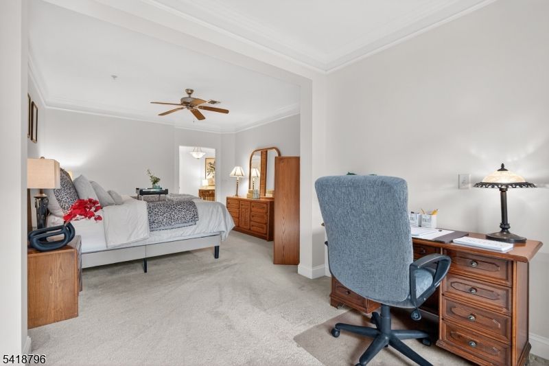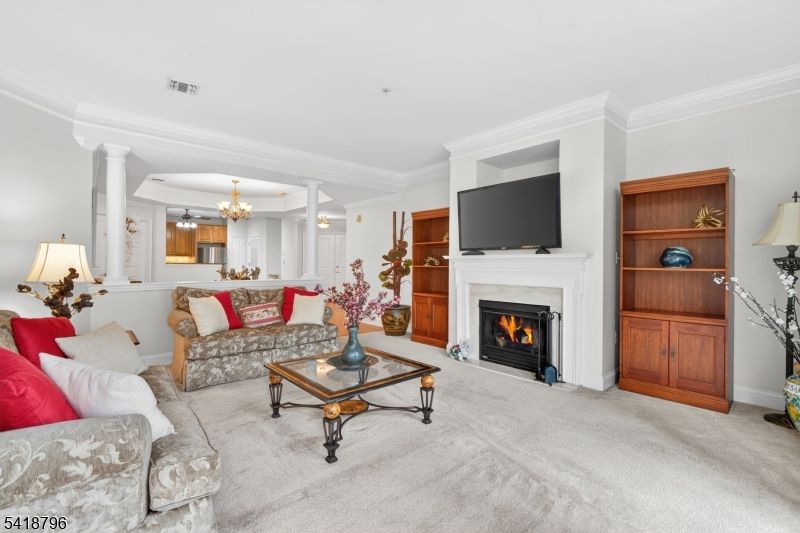 Welcome to the Donnington Executive Residence at Winthrop Court where downsizing doesn't mean giving up the space and comfort you're accustomed to.Located in Clifton's premier gated 55+ community, this spacious two-bedrm, two-bath home offers approx 1,871 sqft of well-designed, single-level living, a rare find among today's downsizing options.From the moment you enter, the scale is immediately apparent. Architectural tray ceilings w crown molding add depth & an upscale feel, while large windows fill the living & dining areas w natural light. The living rm, anchored by a gas fireplace, opens to a private balcony perfect for quiet mornings or relaxing evenings.The eat-in kitchen features granite countertops, stainless steel appliances, & ample cabinetry for everyday living & entertaining.The primary suite offers generous closet space & an en-suite bath w double vanity, soaking tub, & separate shower. A second bedroom is ideal for guests, a home office, or flexible use.Additional features include in-unit laundry, indoor garage parking w direct elevator access, & private storage.Winthrop Court offers a clubhouse, fitness center, heated pool, tennis, bocce, and beautifully maintained grounds within a secure, gated setting.With limited availability of this sought-after model, this is an opportunity to secure both space & lifestyle in one of Clifton's premier 55+ communities.
