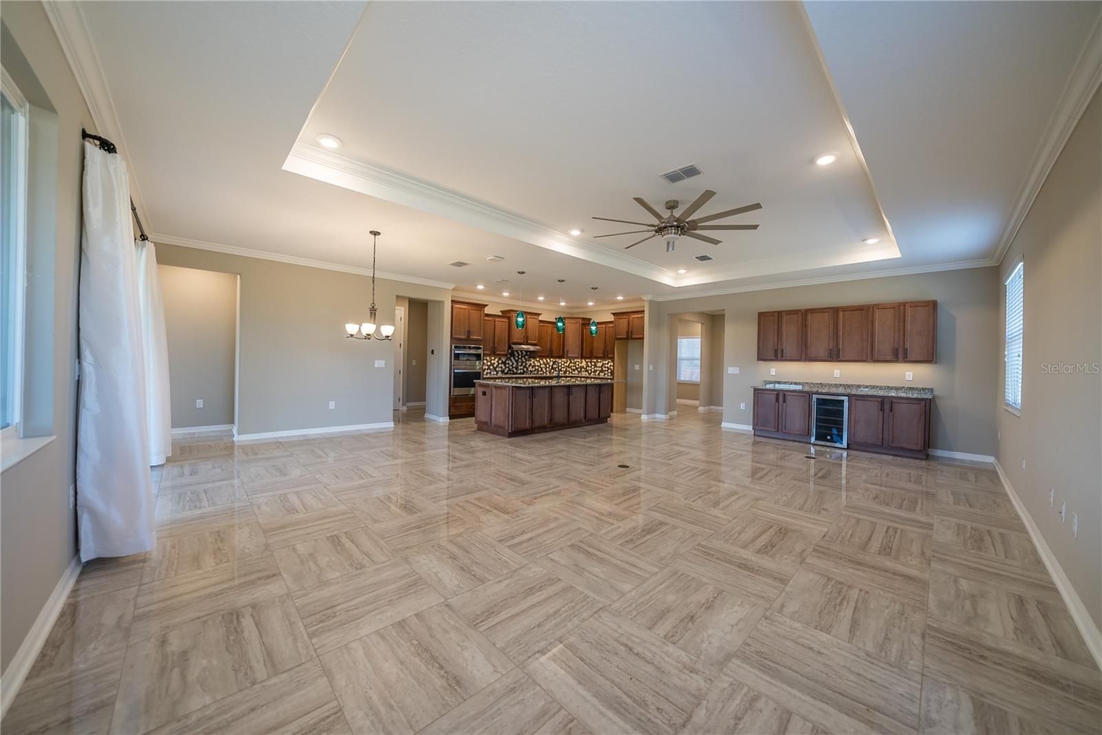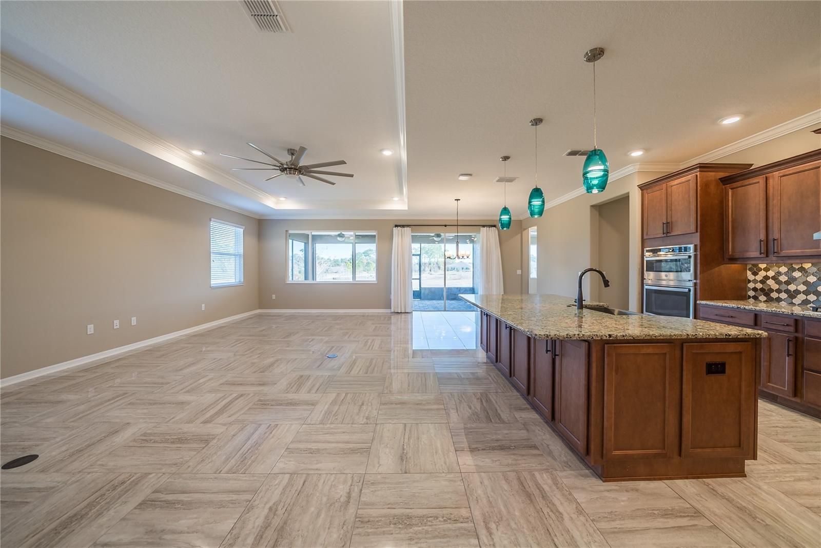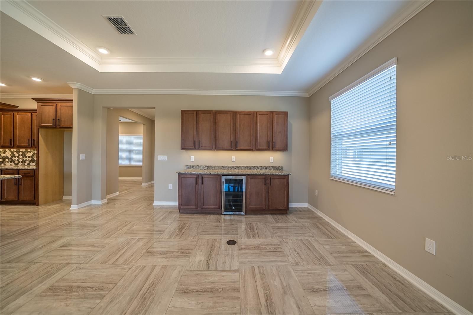 - Built-in Features, Cathedral Ceiling(s), Ceiling Fan(s), Crown Molding, Dry Bar, Eat-in Kitchen, High Ceilings, In-Wall Pest Control, Kitchen/Family Room Combo, L-Shaped Dining Room, Living/Dining Room, Open Floorplan, Main Level Primary, Smart Home, Solid Surface Counters, Stone Counters, Thermostat, Tray Ceiling(s), Vaulted Ceiling(s), Walk-In Closet(s), Wet Bar, Window Treatments