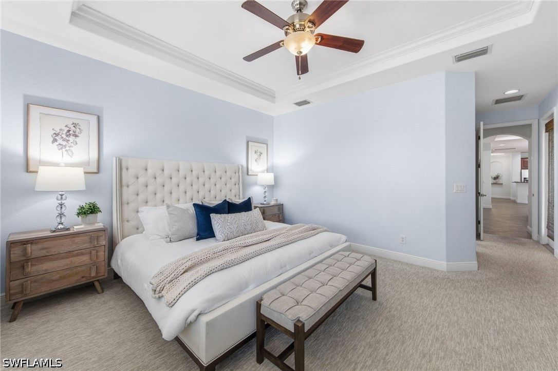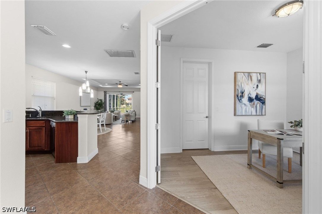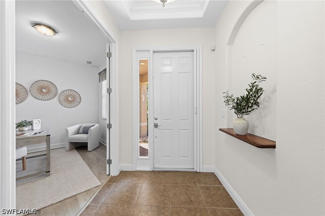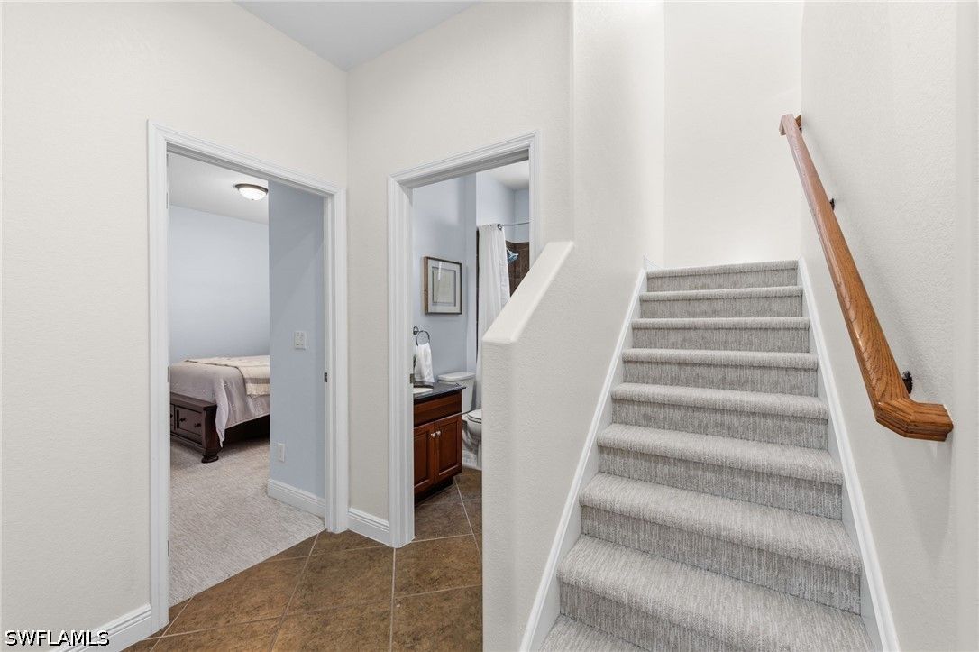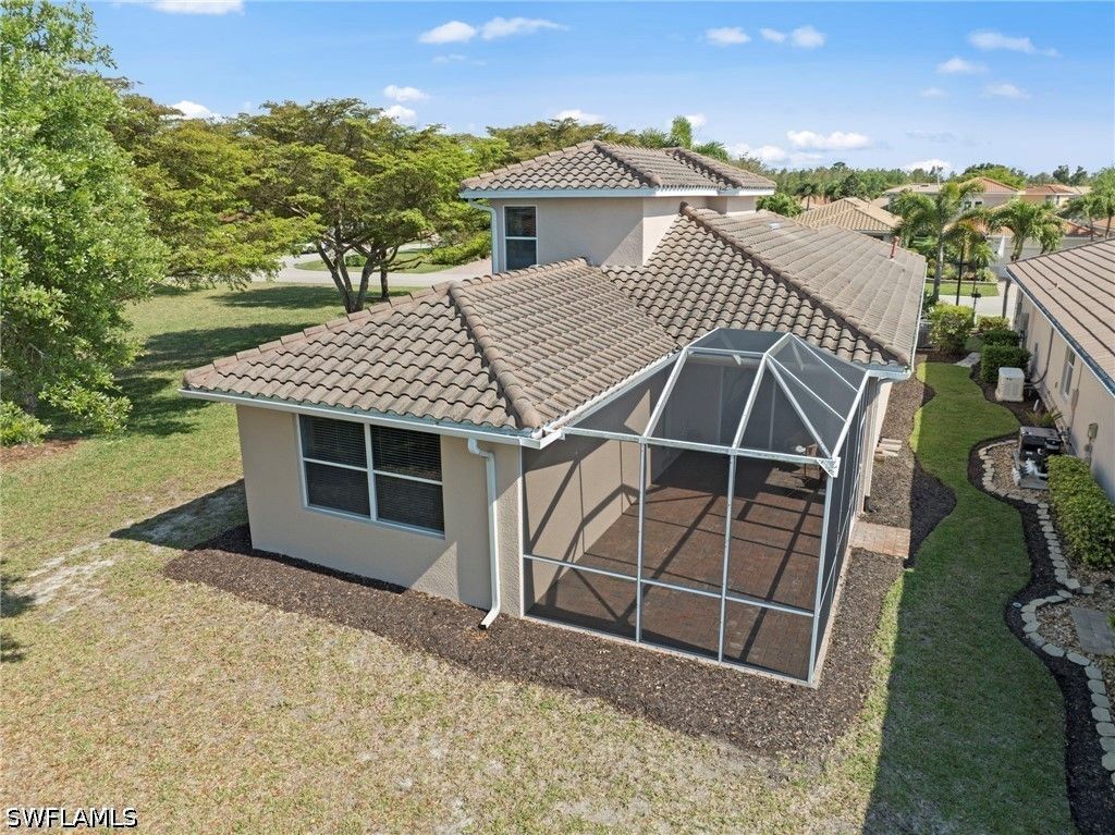 Located in The Reserve at Estero, this Toll Brothers Gianna model offers a spacious and flexible floor plan with 4 bedrooms and 3 full baths, set on an oversized homesite with no neighbor on one side—providing added privacy and a more open, expansive feel. The main level features 3 bedrooms and 2 full baths, including the primary suite, while a spacious upstairs bedroom with its own full bath offers the perfect setup for guests, a private retreat, or a bonus living space. Inside, the home showcases volume ceilings and a light, airy layout complemented by a well-appointed kitchen with 42” cabinetry and granite countertops, seamlessly connecting to the main living and dining areas for easy everyday living and entertaining. Step outside to the screened paver lanai, overlooking a generous backyard with glimpses of the lake and ample room to add a pool if desired—creating the opportunity to design your own private outdoor retreat. The larger lot size is a standout feature, offering both privacy and flexibility rarely found within the community. The roof was replaced in 2019, providing added value and peace of mind. The Reserve at Estero is a natural gas, 24-hour guard-gated community offering a resort-style pool and spa, fitness center, tennis, pickleball, and an active social atmosphere. Ideally located WEST of I-75 and in Flood Zone X, just minutes from Coconut Point Mall, Miromar Outlets, FGCU, RSW Airport, and the Gulf beaches, this home offers the best of Southwest Florida living.