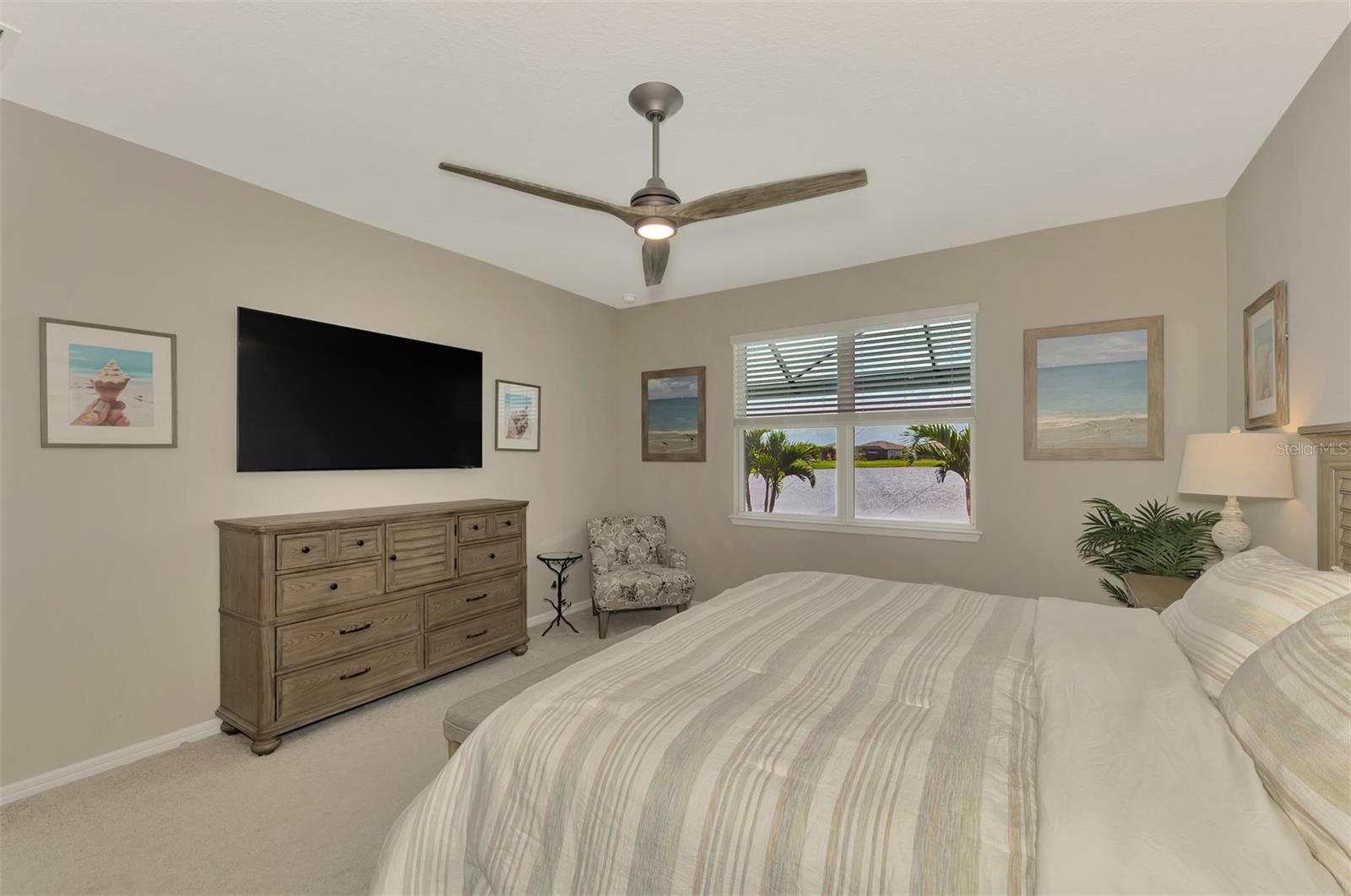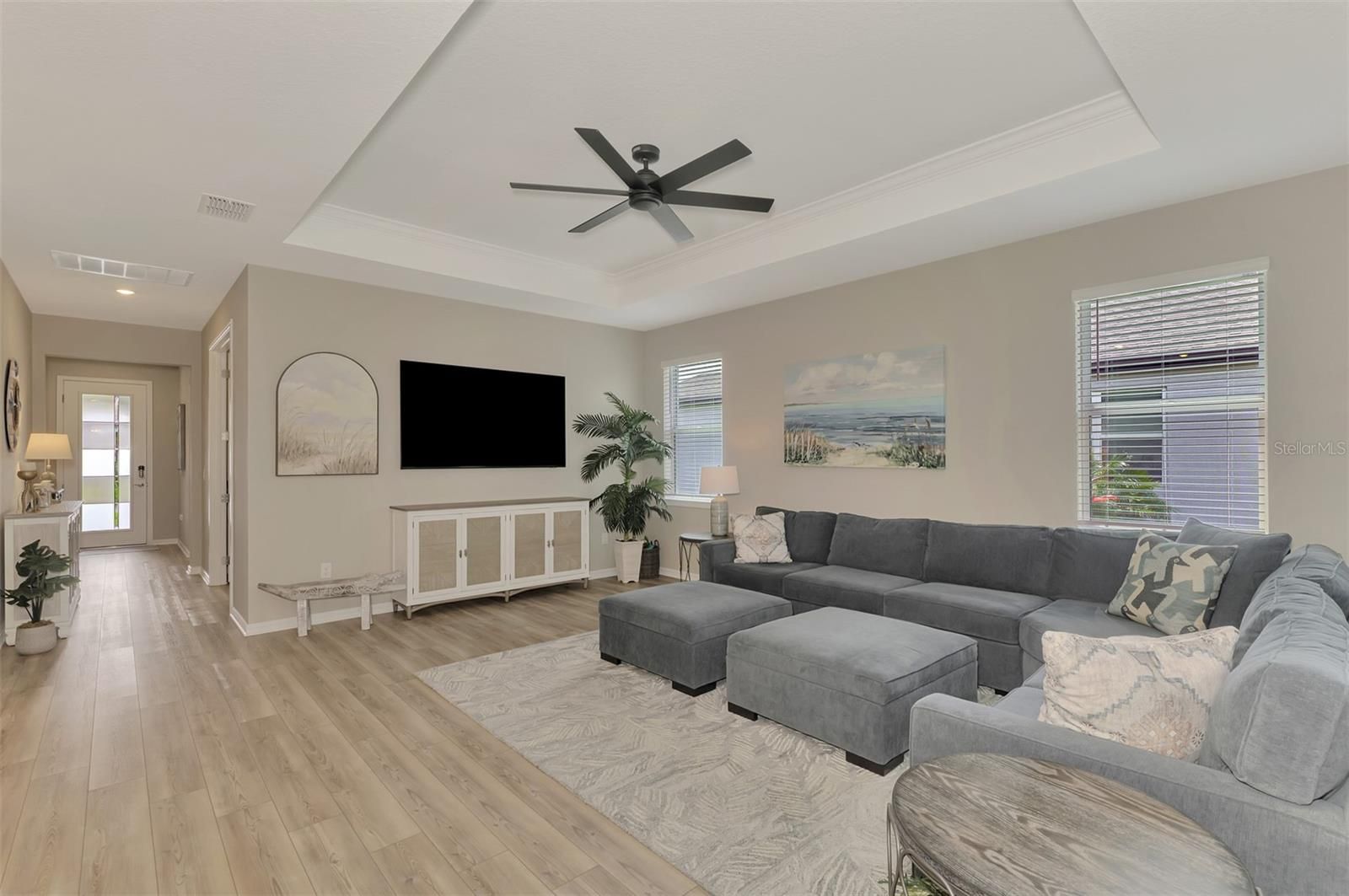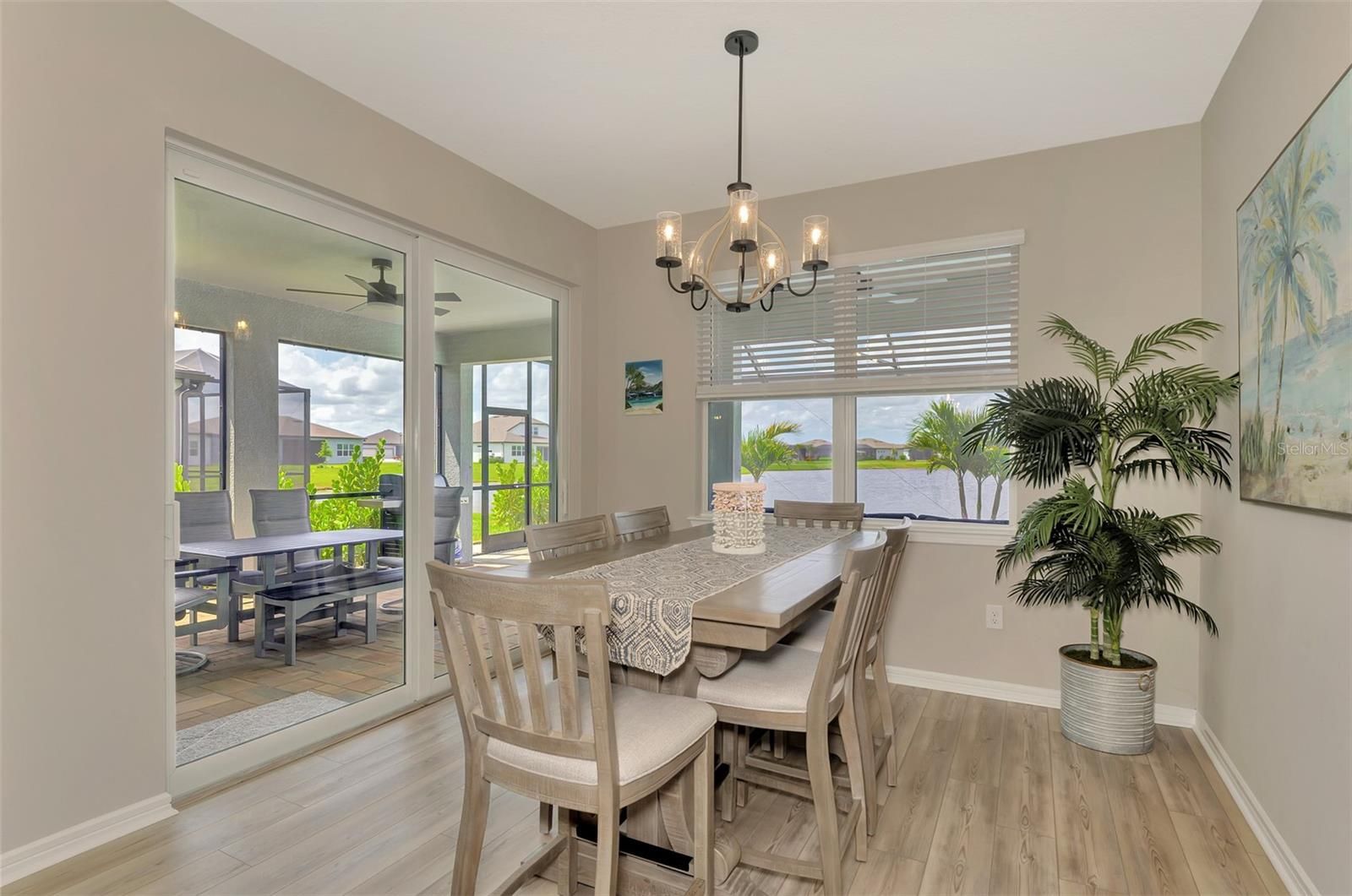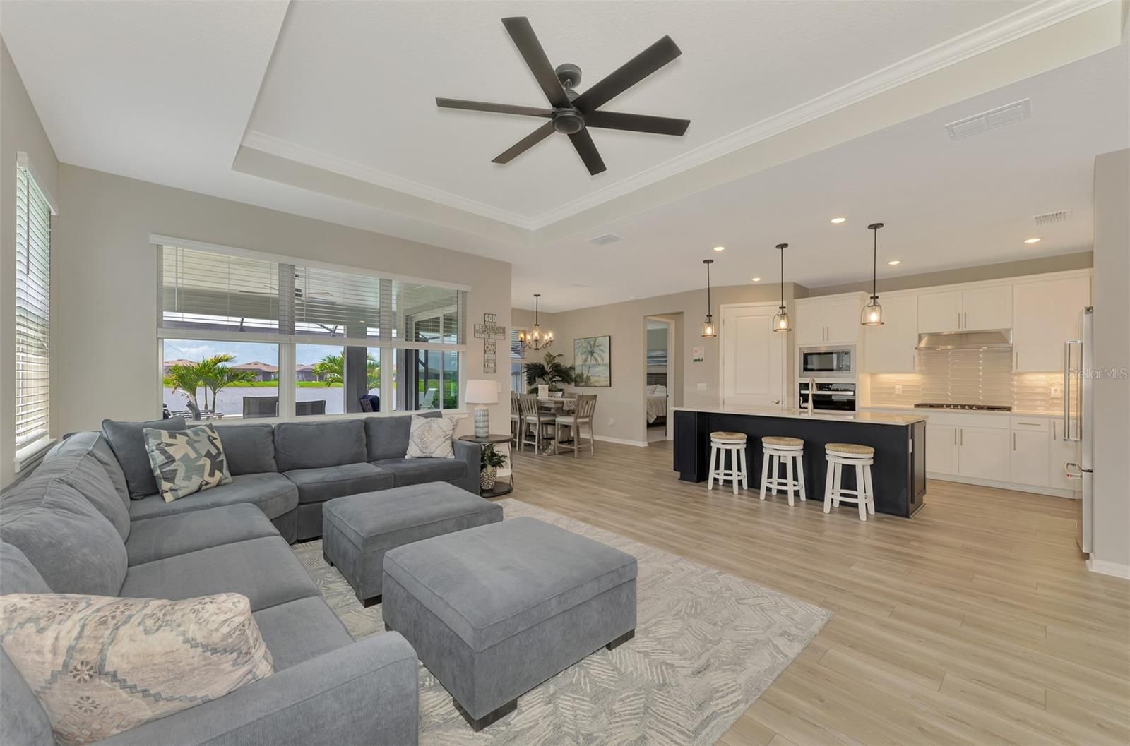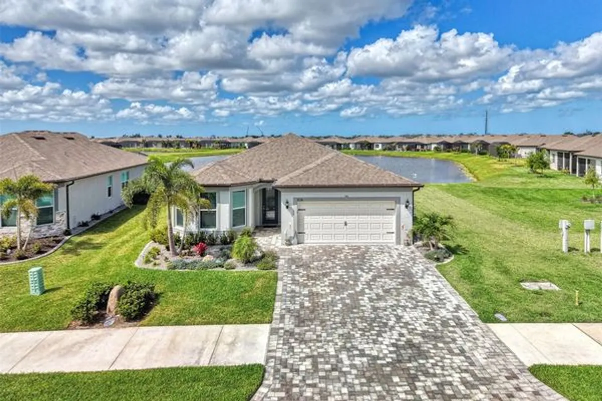 Enjoy resort style living in the highly sought after 55+ Del Webb at Bay View community. This 2024 built popular Mystique floor is situated on a premium water lot with sweeping lake views and offers stunning curb appeal. Exterior upgrades include tropical landscaping, flower bed curbing with ornamental rock garden around the entire perimeter, and industrial quality low voltage landscaping lighting. The driveway was also widened on each side. The oversized lanai off the back offers ample space to relax and unwind, and the current owner installed an after-market custom pool. The heated saltwater pool includes a pebble tec interior, beautiful decorative pavers, and a clear view screen to enjoy an unobstructed view of the water. The home was constructed with HURRICANE IMPACT GLASS and DOORS giving you peace of mind, and the floor plan was modified to include 3 bedrooms plus a den/office. Inside you will find a lavishly upgraded interior as you step through the glass front door. A welcoming foyer is adorned with luxury vinyl plank floors that run throughout the main living spaces, and you will appreciate other upgrades such as 8-foot doors, tray ceilings, and designer light fixtures and fans that can be found throughout. The kitchen was modified at the time of construction to the built-in gourmet package and features upgraded cabinetry with dovetail constructed drawers, soft close doors and drawers throughout, built-in stainless steel appliances with upgraded refrigerator, decorative backsplash with quartz countertops, a large single bowl granite sink, and under cabinet lighting. There is also a generous sized pantry for extra storage. The large living room is flooded with light and enjoys lake views from every angle, and the dining area is the perfect place to throw a lavish dinner party or enjoy a quiet low-key meal at home. The primary suite is sure to impress with a custom built-in closet, and an en suite spa inspired bathroom with large walk-in shower and dual sink vanity with extra storage. Enjoy the lake view right from the comfort of your bed on those lazy mornings. Back at the front of the house just off the foyer, you will find a light filled guest bedroom and a second full bathroom that was upgraded with tile to the ceiling and beautiful quartz countertops. On the opposite side of the foyer, you will find the third bedroom making each bedroom in the home absolutely private. In addition to the 3 bedrooms there is a den/office with double door entry that has a built-in desk accented with under cabinet lighting that was custom designed and installed. There is a large laundry room with extra built-ins with folding station and a luxury washer and dryer package. The garage was finished with an epoxy floor and tons of built-in shelving for staying organized, and there is even a 50 AMP generator plug hook up for a back feed generator should you need it. Enjoy world class amenities that include the 22,562 sf Driftwood Clubhouse, a heated resort style pool, state of the art fitness center, tennis and pickleball courts, bocce ball, event lawn and amphitheater, dog park, fire pit, community garden, demo kitchen and craft room, and tons of walking paths. The community includes a full-time lifestyle director and a guard gated entry. With the onsite restaurant The Sailfish Bar and Grille, you will feel like you are always on vacation. Enjoy maintenance free living with lawn maintenance included in your HOA fee as well as cable and internet.