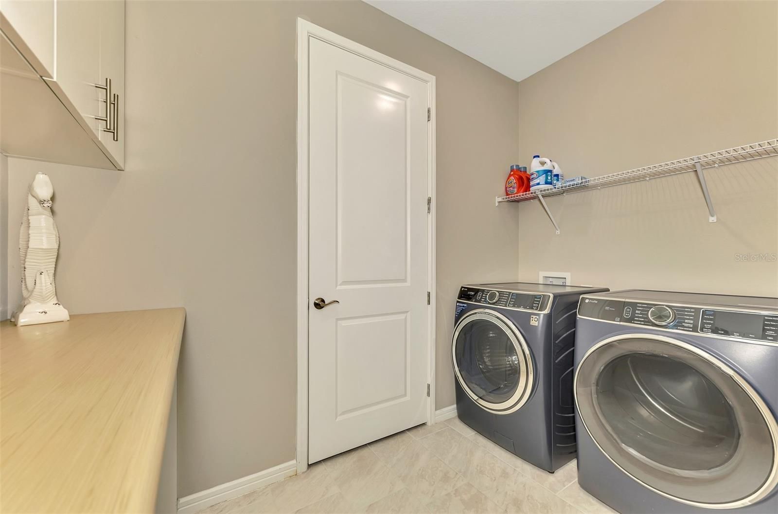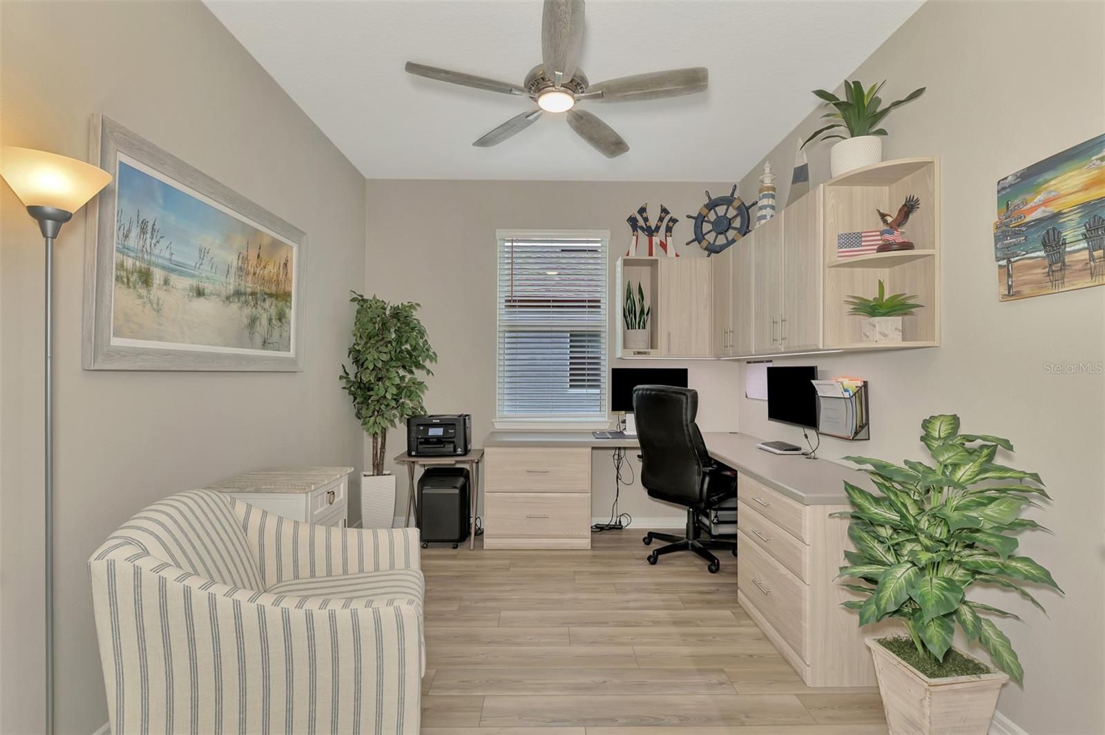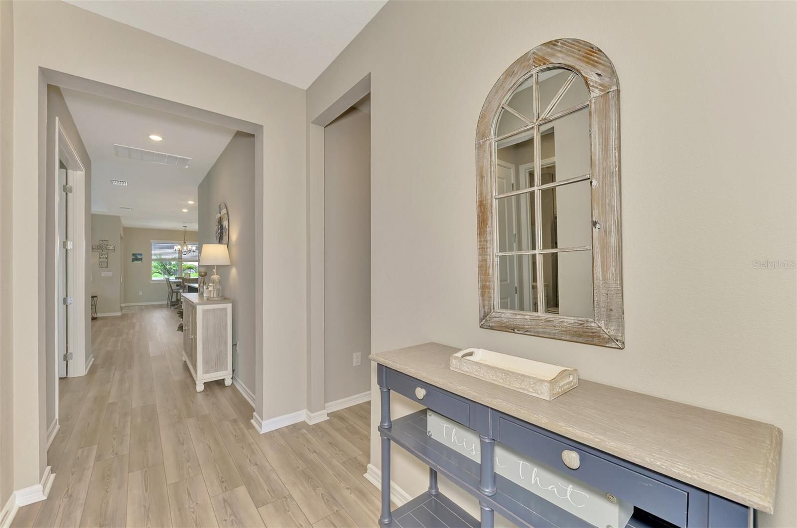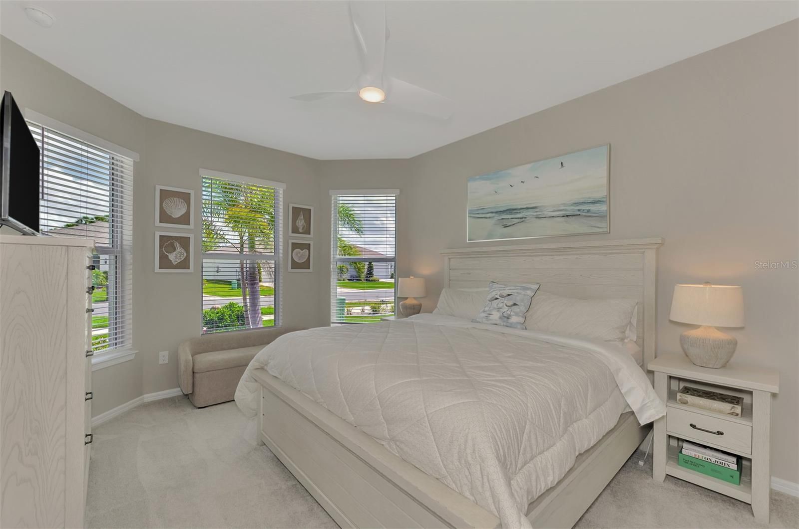 Enjoy resort style living in the highly sought after 55+ Del Webb at Bay View community. This 2024 built popular Mystique floor is situated on a premium water lot with sweeping lake views and offers stunning curb appeal. Exterior upgrades include tropical landscaping, flower bed curbing with ornamental rock garden around the entire perimeter, and industrial quality low voltage landscaping lighting. The driveway was also widened on each side. The oversized lanai off the back offers ample space to relax and unwind, and the current owner installed an after-market custom pool. The heated saltwater pool includes a pebble tec interior, beautiful decorative pavers, and a clear view screen to enjoy an unobstructed view of the water. The home was constructed with HURRICANE IMPACT GLASS and DOORS giving you peace of mind, and the floor plan was modified to include 3 bedrooms plus a den/office. Inside you will find a lavishly upgraded interior as you step through the glass front door. A welcoming foyer is adorned with luxury vinyl plank floors that run throughout the main living spaces, and you will appreciate other upgrades such as 8-foot doors, tray ceilings, and designer light fixtures and fans that can be found throughout. The kitchen was modified at the time of construction to the built-in gourmet package and features upgraded cabinetry with dovetail constructed drawers, soft close doors and drawers throughout, built-in stainless steel appliances with upgraded refrigerator, decorative backsplash with quartz countertops, a large single bowl granite sink, and under cabinet lighting. There is also a generous sized pantry for extra storage. The large living room is flooded with light and enjoys lake views from every angle, and the dining area is the perfect place to throw a lavish dinner party or enjoy a quiet low-key meal at home. The primary suite is sure to impress with a custom built-in closet, and an en suite spa inspired bathroom with large walk-in shower and dual sink vanity with extra storage. Enjoy the lake view right from the comfort of your bed on those lazy mornings. Back at the front of the house just off the foyer, you will find a light filled guest bedroom and a second full bathroom that was upgraded with tile to the ceiling and beautiful quartz countertops. On the opposite side of the foyer, you will find the third bedroom making each bedroom in the home absolutely private. In addition to the 3 bedrooms there is a den/office with double door entry that has a built-in desk accented with under cabinet lighting that was custom designed and installed. There is a large laundry room with extra built-ins with folding station and a luxury washer and dryer package. The garage was finished with an epoxy floor and tons of built-in shelving for staying organized, and there is even a 50 AMP generator plug hook up for a back feed generator should you need it. Enjoy world class amenities that include the 22,562 sf Driftwood Clubhouse, a heated resort style pool, state of the art fitness center, tennis and pickleball courts, bocce ball, event lawn and amphitheater, dog park, fire pit, community garden, demo kitchen and craft room, and tons of walking paths. The community includes a full-time lifestyle director and a guard gated entry. With the onsite restaurant The Sailfish Bar and Grille, you will feel like you are always on vacation. Enjoy maintenance free living with lawn maintenance included in your HOA fee as well as cable and internet.